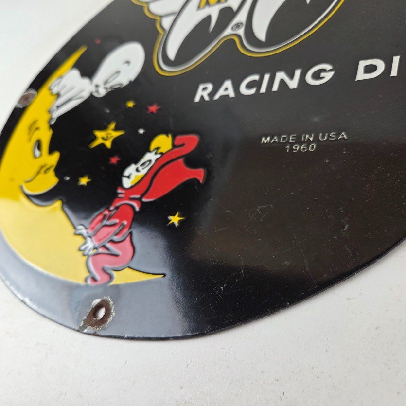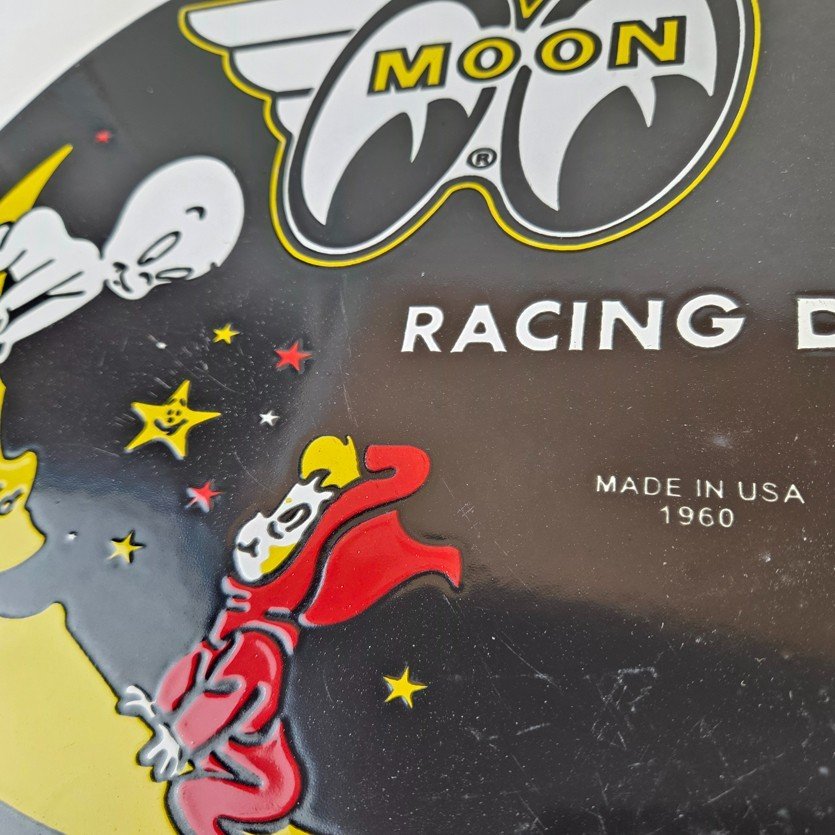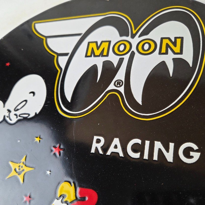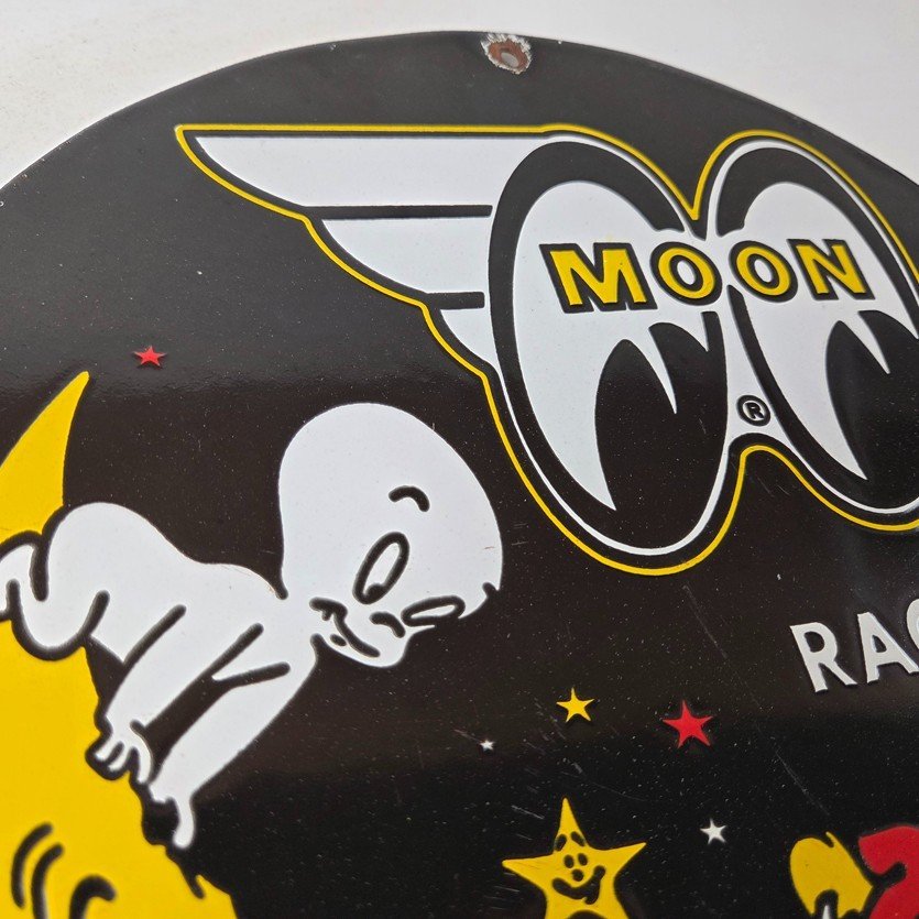 This vintage Moon Eyes Speed Equipment porcelain sign features Casper on the crescent moon. The sign is made of porcelain and measures 12″ across.