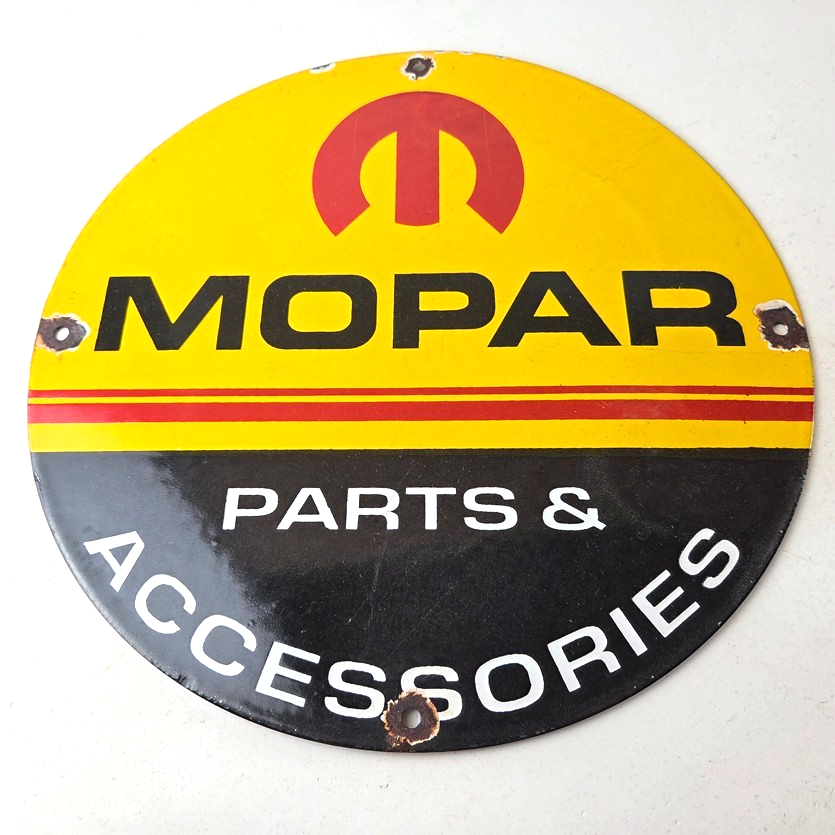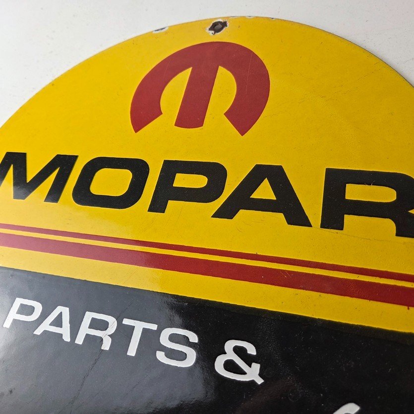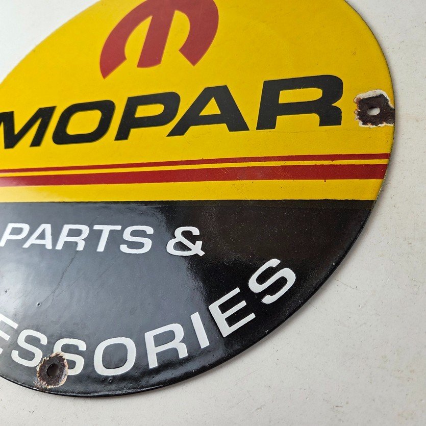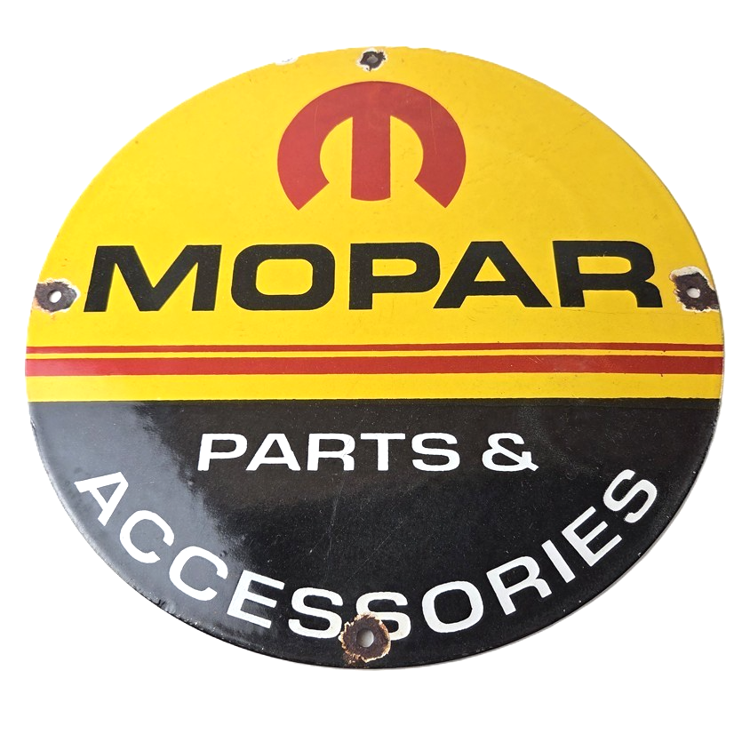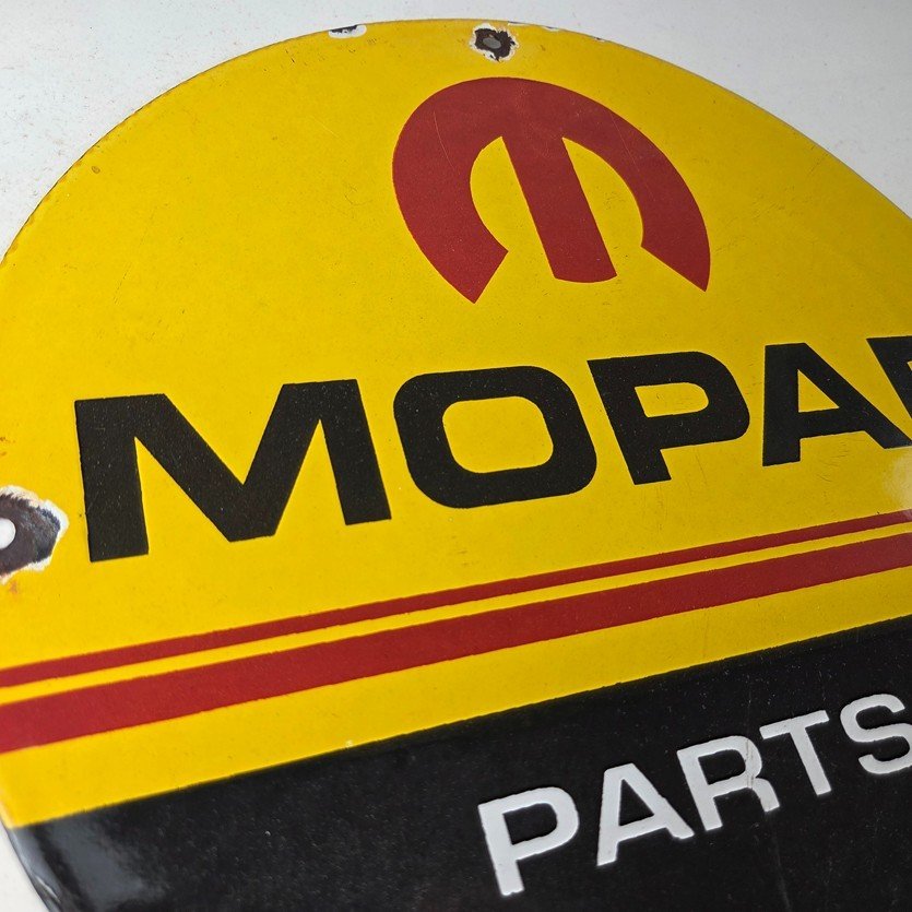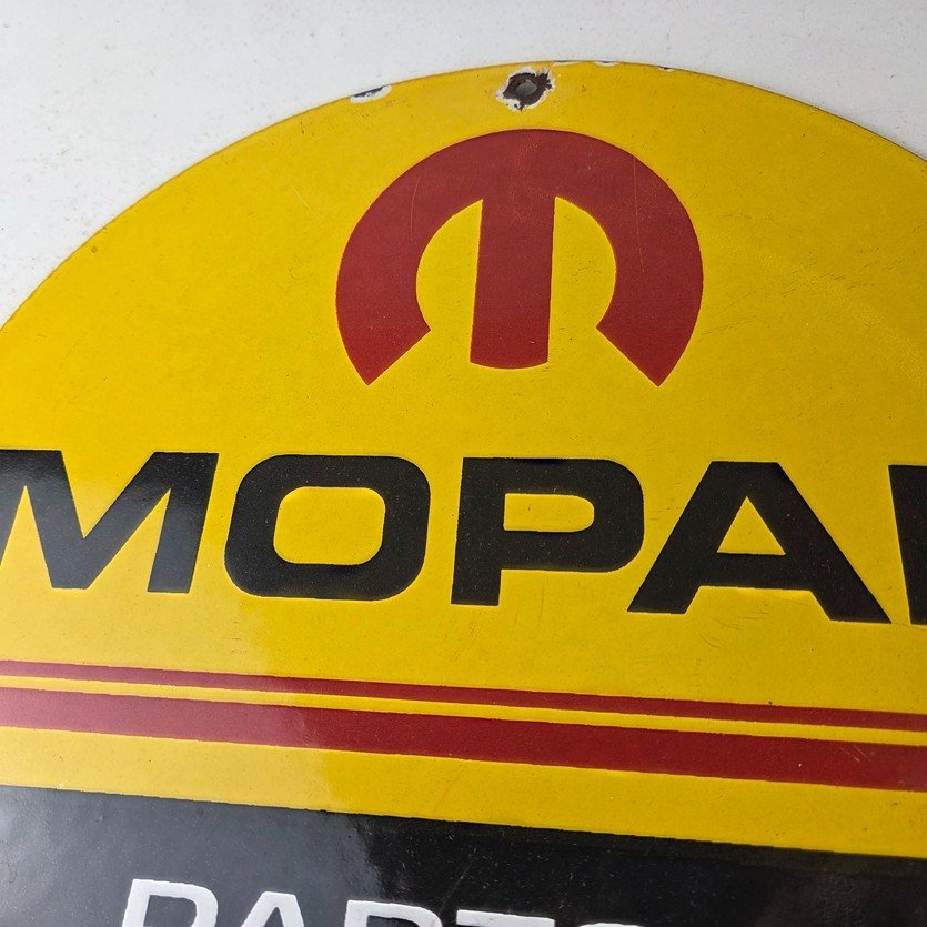 This vintage Mopar porcelain sign features the iconic Mopar lettering and M at the top. The sign has large lettering that really stands out.