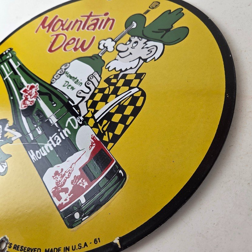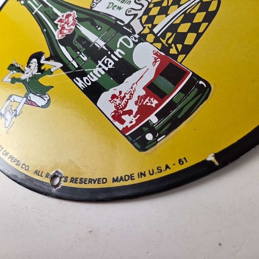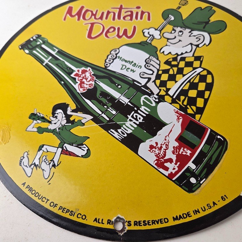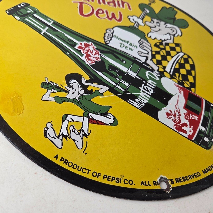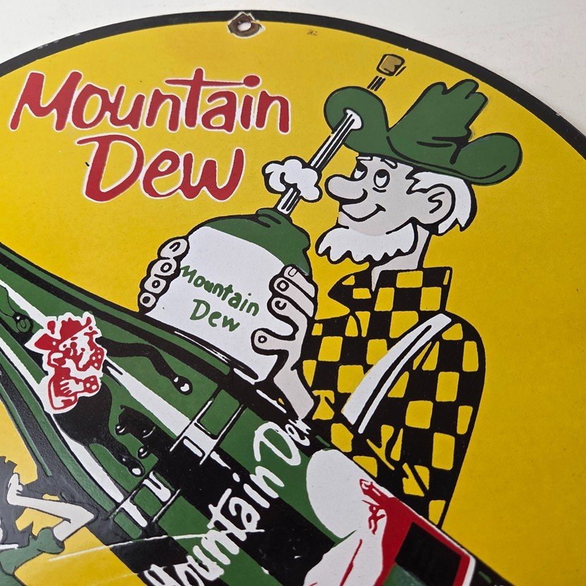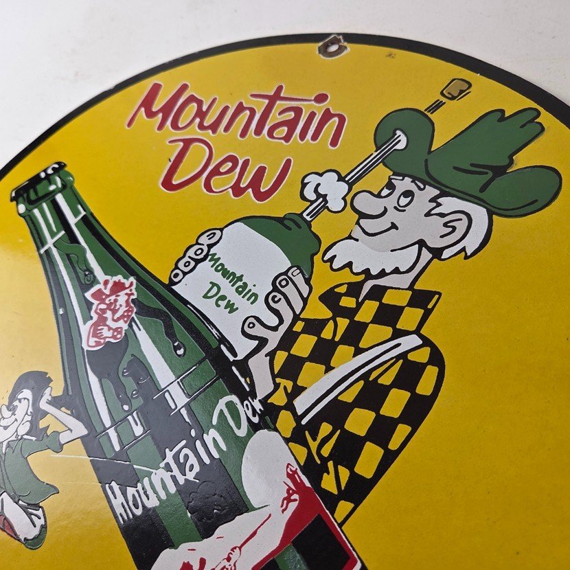 This vintage Mountain Dew hillbilly sign makes a great addition to a garage, shop display, man cave, bar, or any Mountain Dew memorabilia collection, vintage soda advertising collection, or retro PepsiCo sign collection.