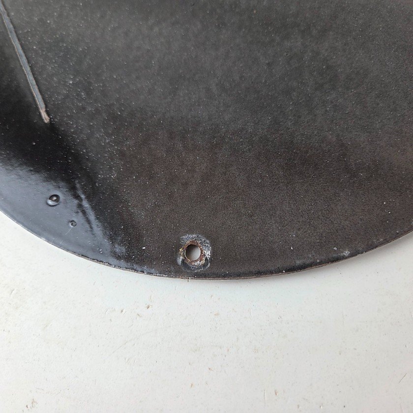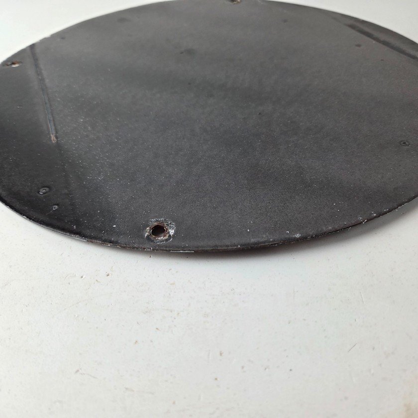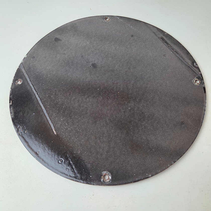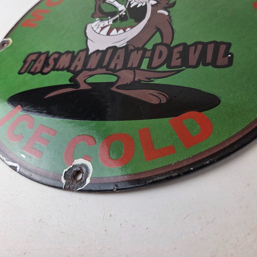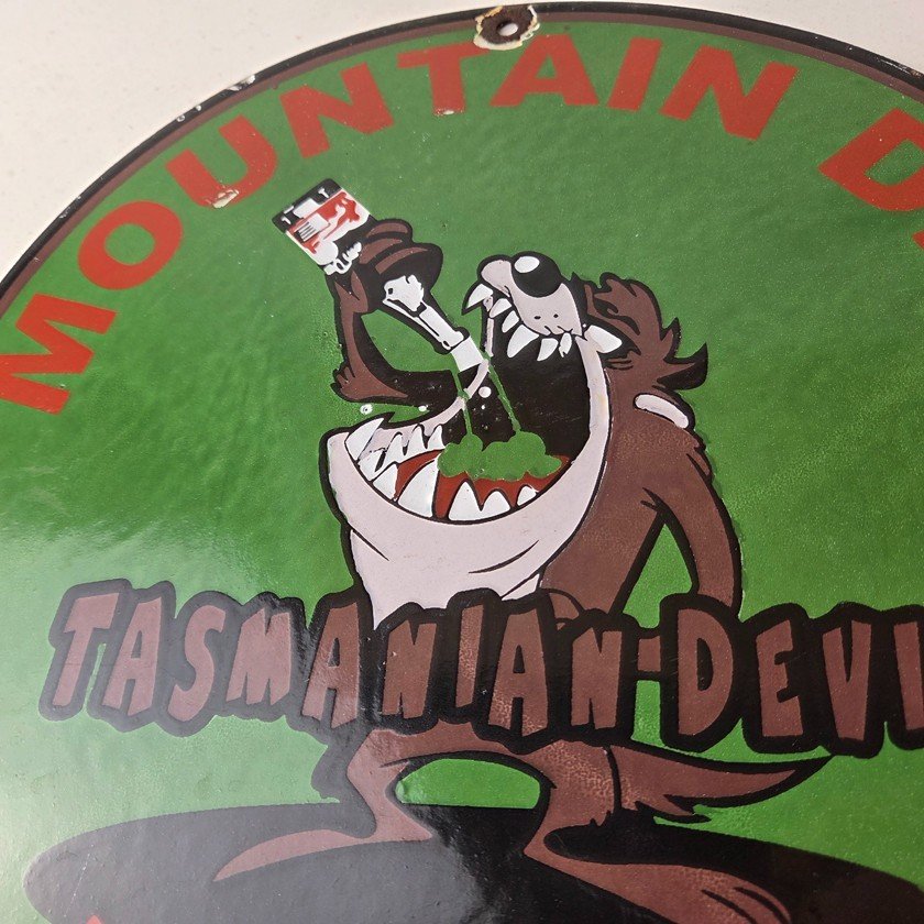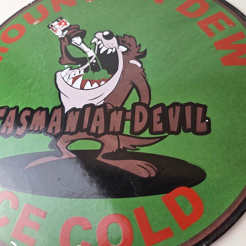 It is a vintage Mountain Dew porcelain sign featuring the iconic cartoon character. If you love retro gas and oil memorabilia, or the classic soda signs, you will appreciate this sign. It measures 12 inches in diameter and is in excellent condition. This sign is sure to make a statement in any space. Whether you’re looking to add to your collection or decorate your garage, this Mountain Dew porcelain sign is the perfect addition. It has vivid colors and gloss and is in great condition.