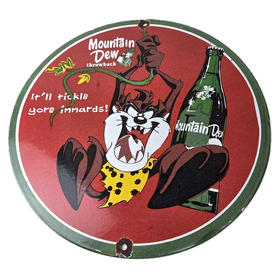 It is a vintage Mountain Dew porcelain sign featuring the iconic cartoon character. If you love retro gas and oil memorabilia, or the classic soda signs, you will appreciate this sign. It measures 12 inches in diameter and is in excellent condition. This sign is sure to make a statement in any space. Whether you’re looking to add to your collection or decorate your garage, this Mountain Dew porcelain sign is the perfect addition. It has vivid colors and gloss and is in great condition.