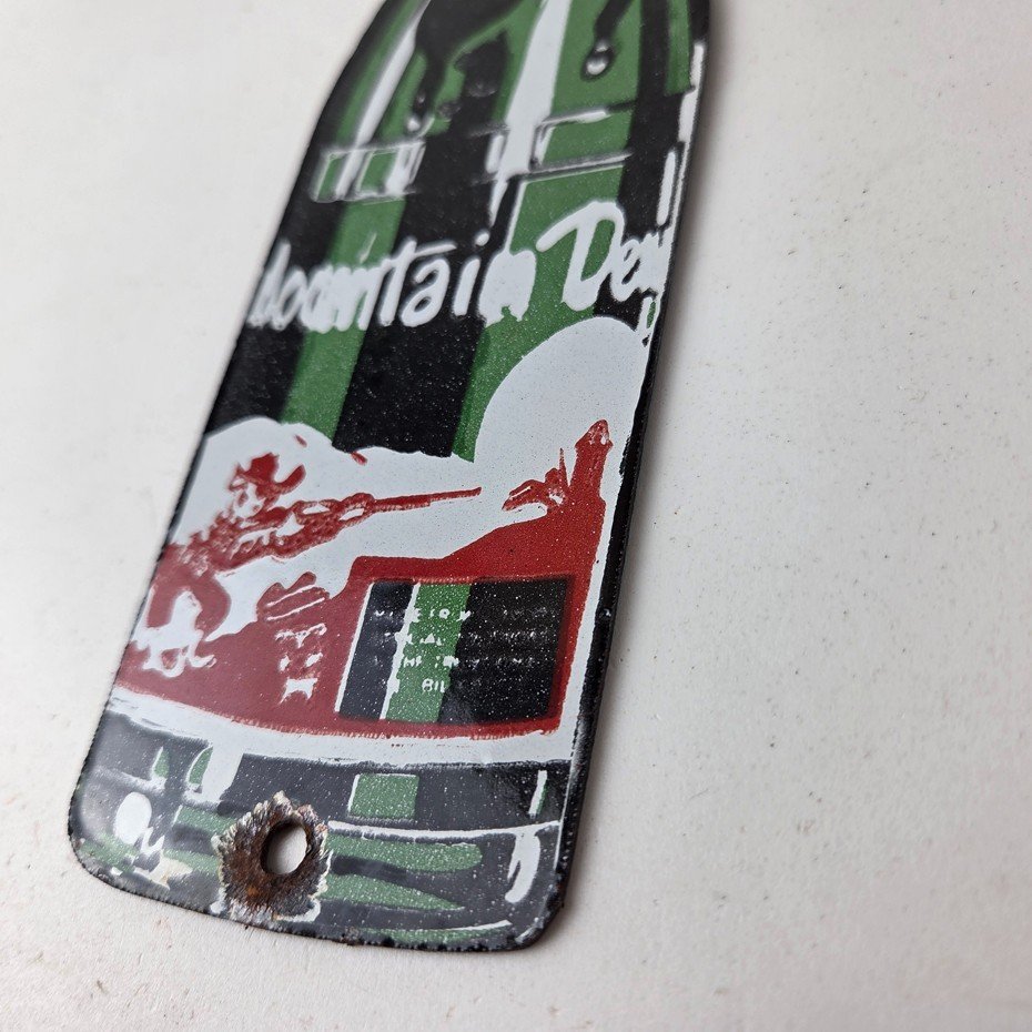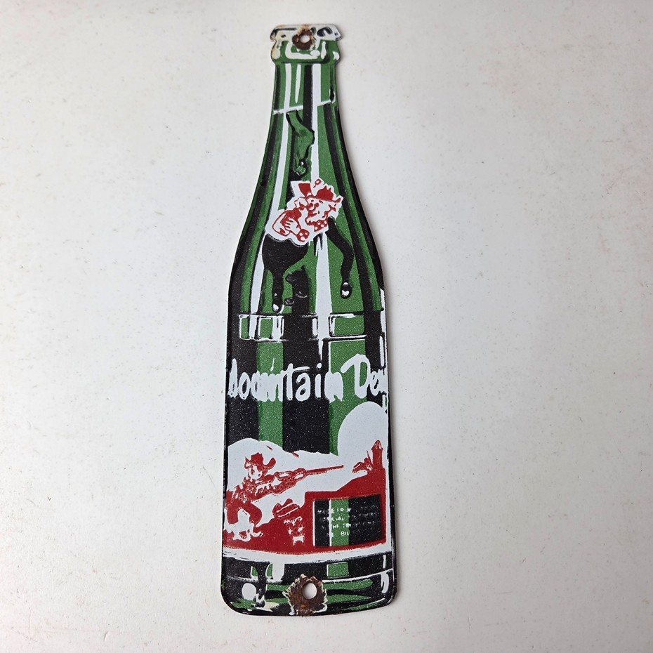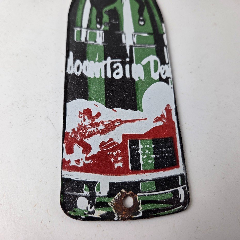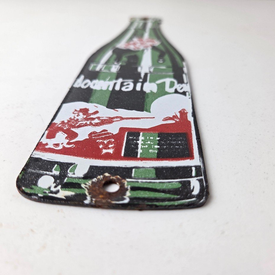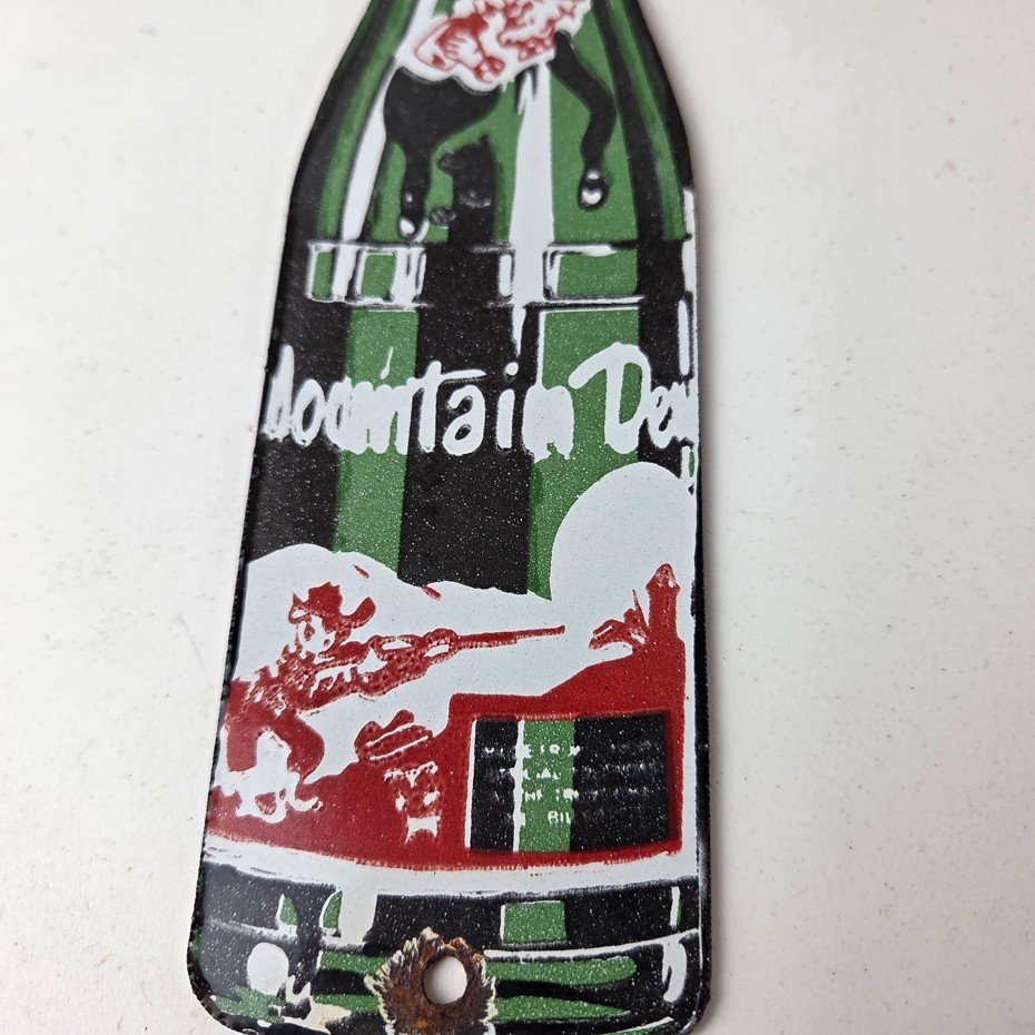 It is a vintage Mountain Dew porcelain sign featuring the iconic friendly hillbilly and in the shape of a glass Mountain Dew soda bottle. If you love retro gas and oil memorabilia, or the classic soda signs, you will appreciate this sign. It measures 10″ by 2 1/2″ and is in excellent condition.