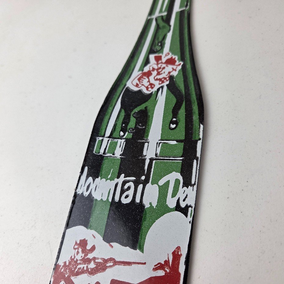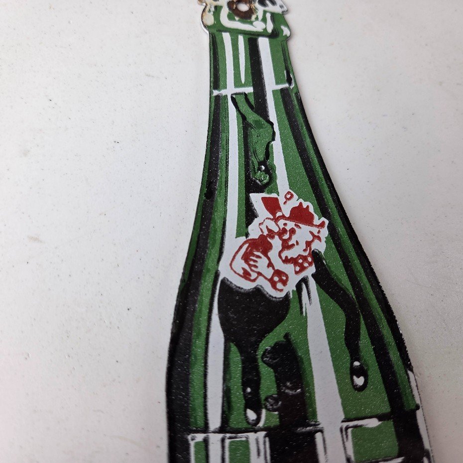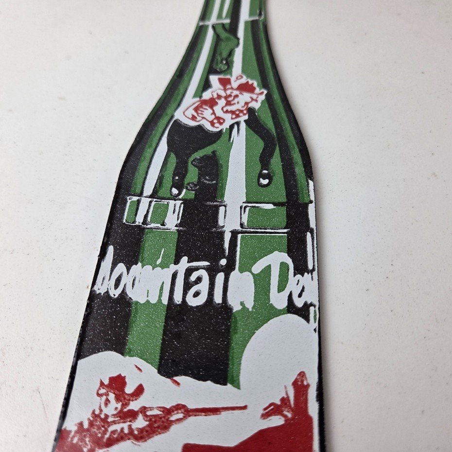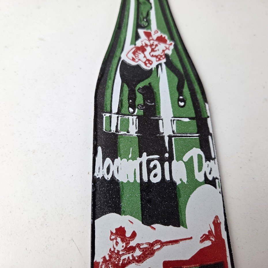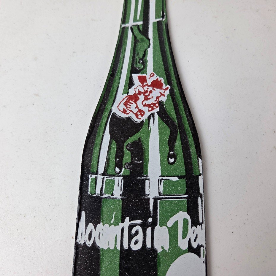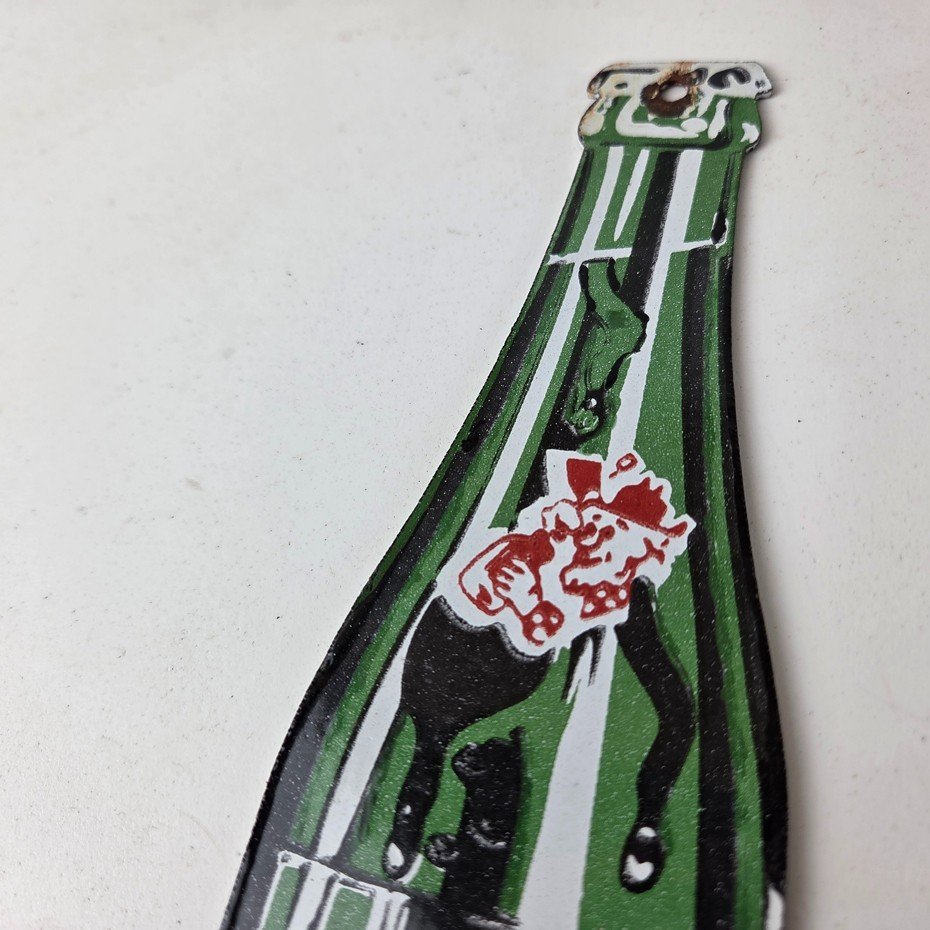 It is a vintage Mountain Dew porcelain sign featuring the iconic friendly hillbilly and in the shape of a glass Mountain Dew soda bottle. If you love retro gas and oil memorabilia, or the classic soda signs, you will appreciate this sign. It measures 10″ by 2 1/2″ and is in excellent condition.