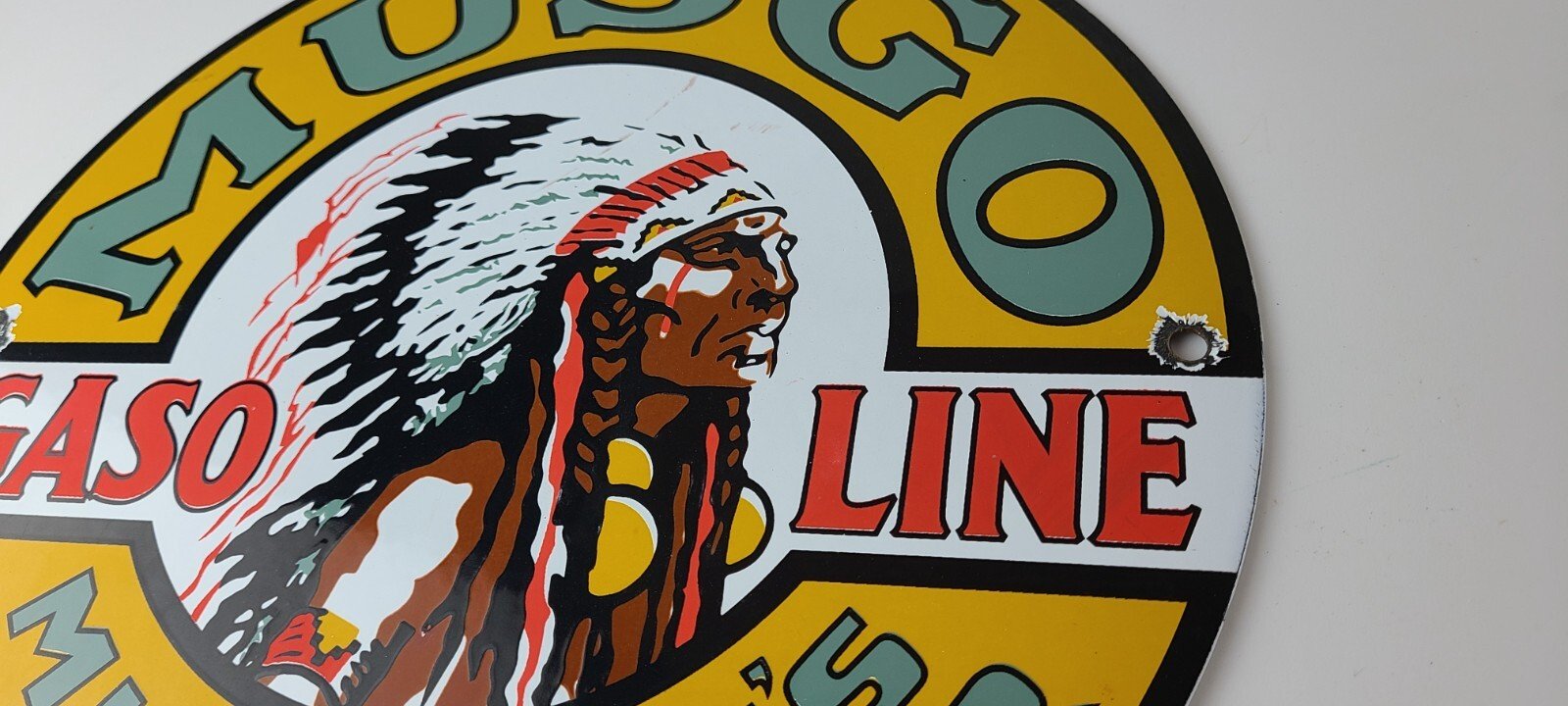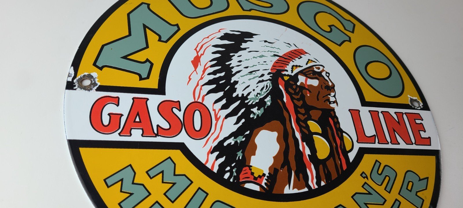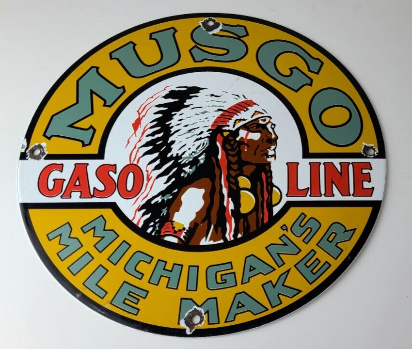 This vintage Musgo Gasoline porcelain sign features a striking design with bold & vivid colors and is made of porcelain material. It is perfect for display in a garage, shop, or man cave. The sign measures 11 3/4″ and is in excellent condition, with no major chips or cracks. It was made in the United States and has excellent porcelain and colors.
