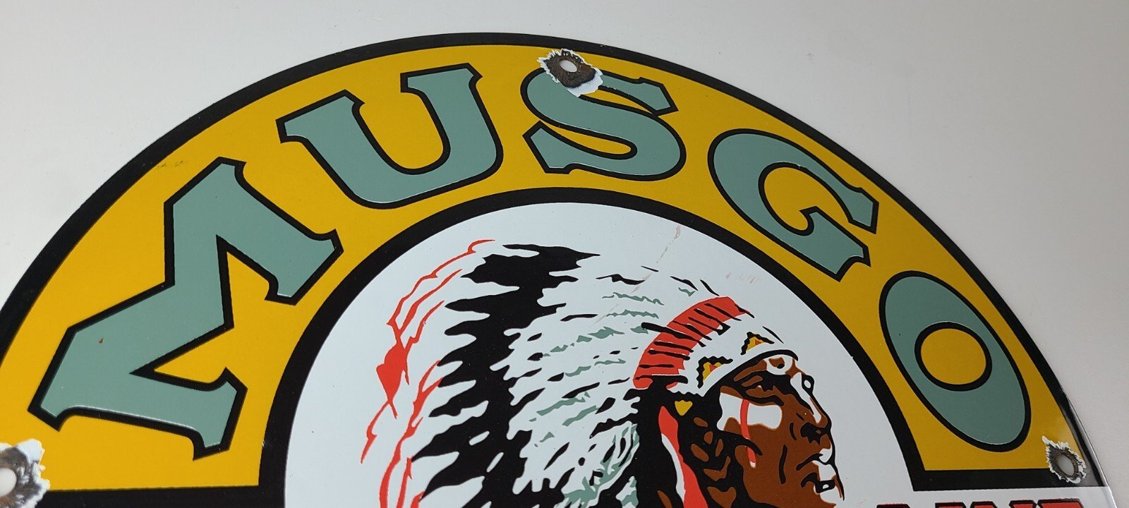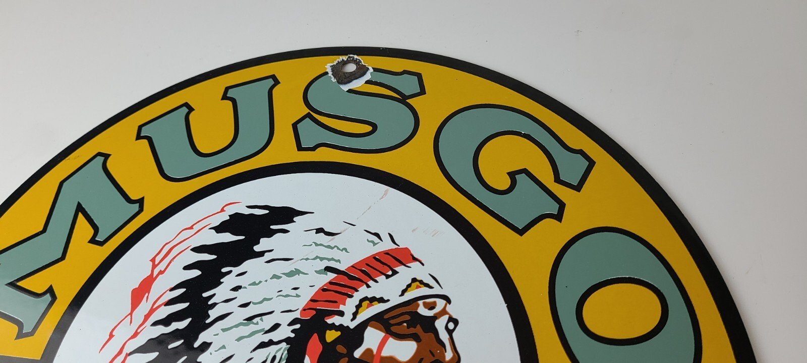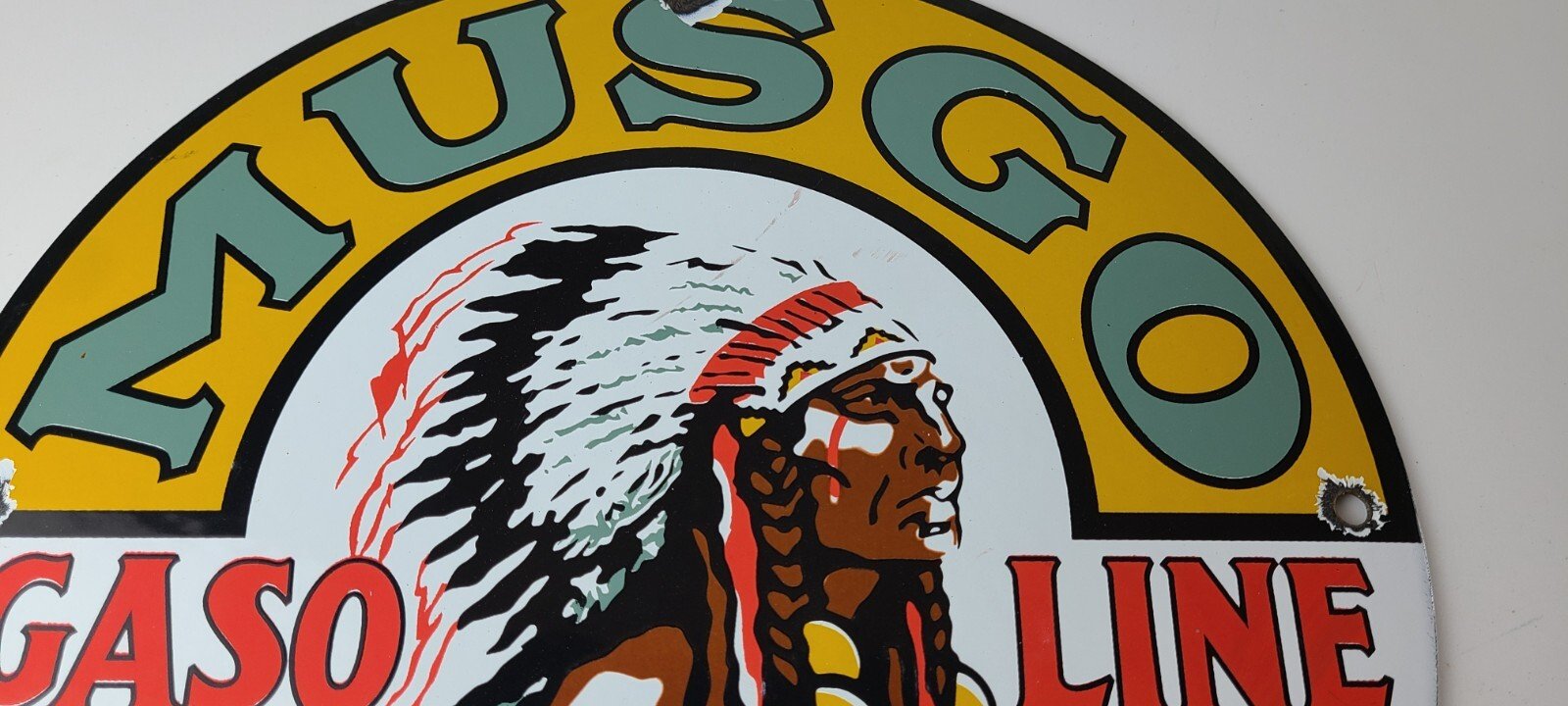 This vintage Musgo Gasoline porcelain sign features a striking design with bold & vivid colors and is made of porcelain material. It is perfect for display in a garage, shop, or man cave. The sign measures 11 3/4″ and is in excellent condition, with no major chips or cracks. It was made in the United States and has excellent porcelain and colors.