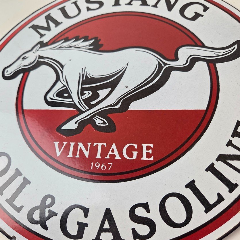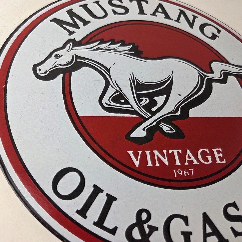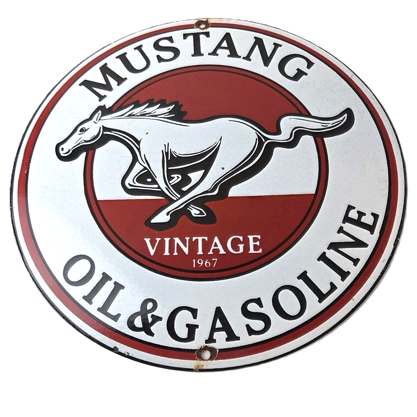 This vintage Mustang Oil porcelain sign is a must-have for any collector of gas and oil memorabilia.
