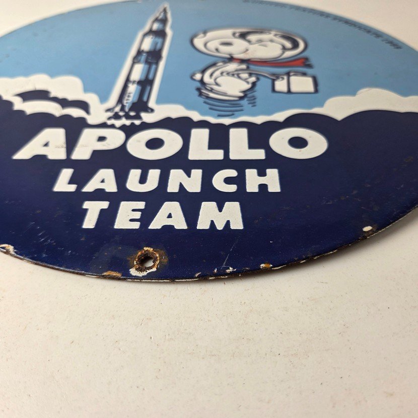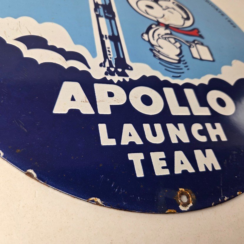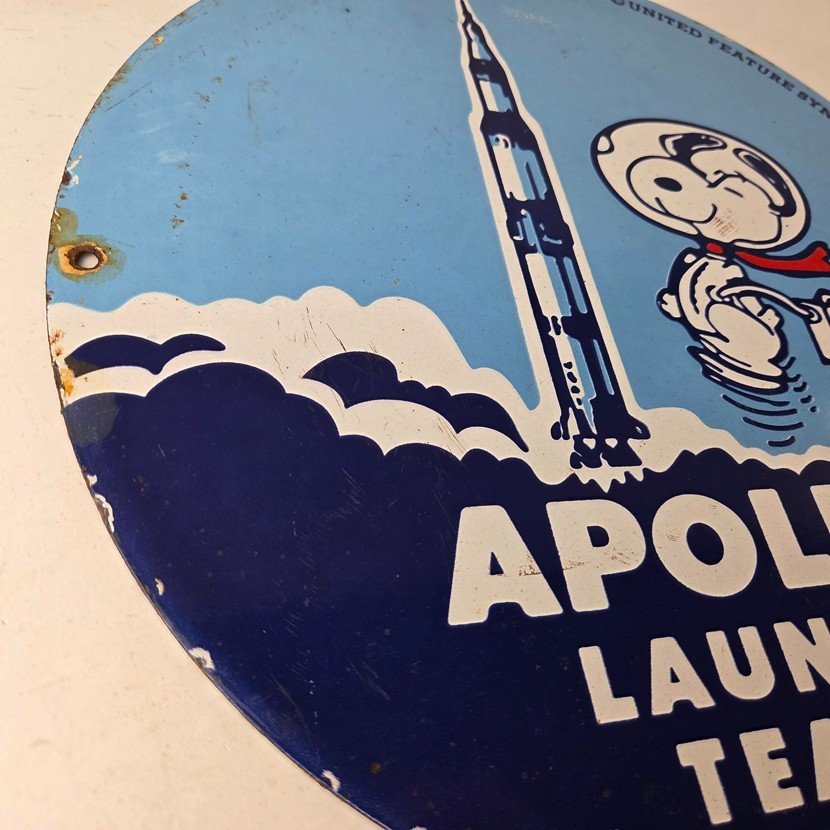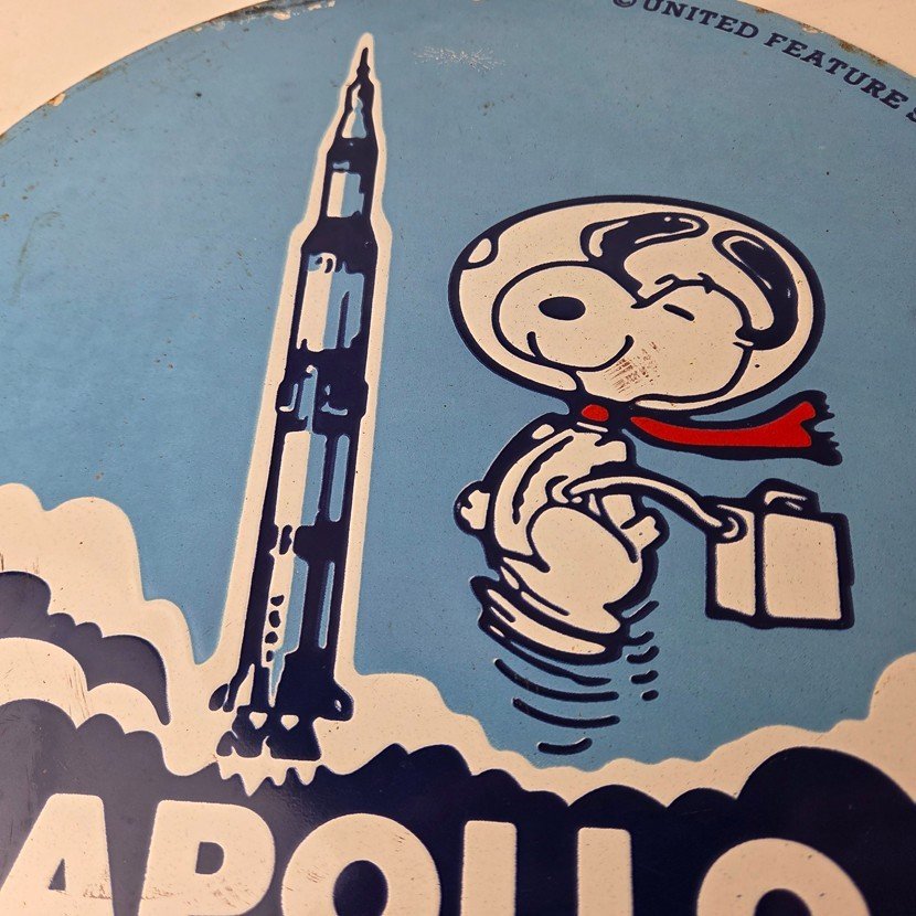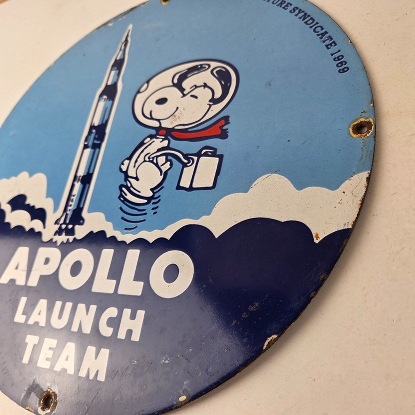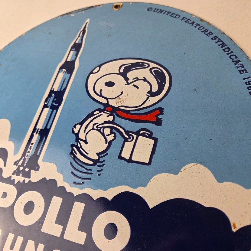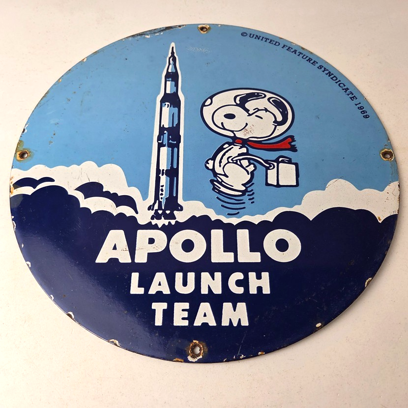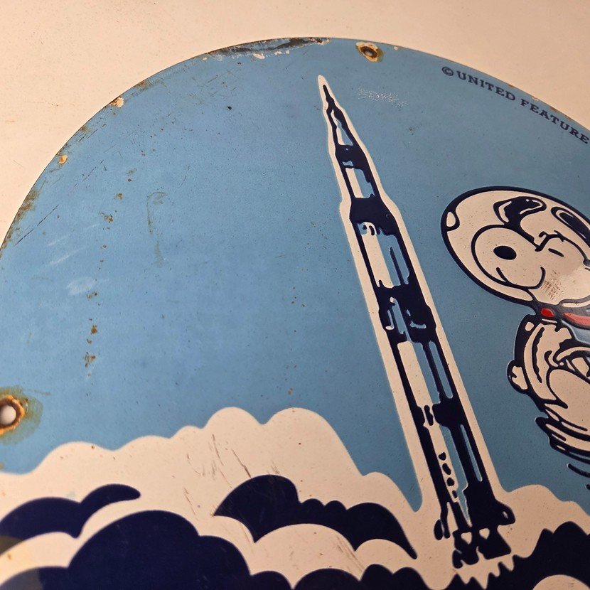 This vintage NASA Space Agency porcelain sign features the iconic NASA astronaut Snoopy from Peanuts. Its striking blue and red colors make it a standout piece for any room. This sign is a perfect addition for NASA enthusiasts, collectors of gas & oil memorabilia, or anyone looking for a unique piece for their display.