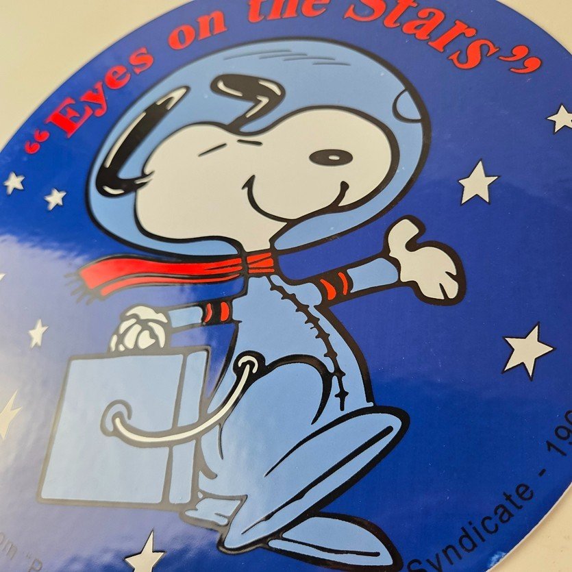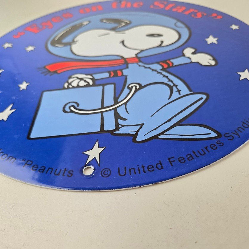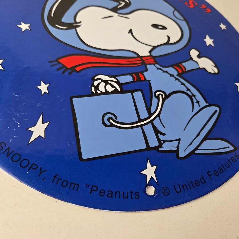 This vintage NASA Space Agency porcelain sign features the iconic NASA astronaut Snoopy from Peanuts. Its striking blue and red colors make it a standout piece for any room. This sign is a perfect addition for NASA enthusiasts, collectors of gas & oil memorabilia, or anyone looking for a unique piece for their display.