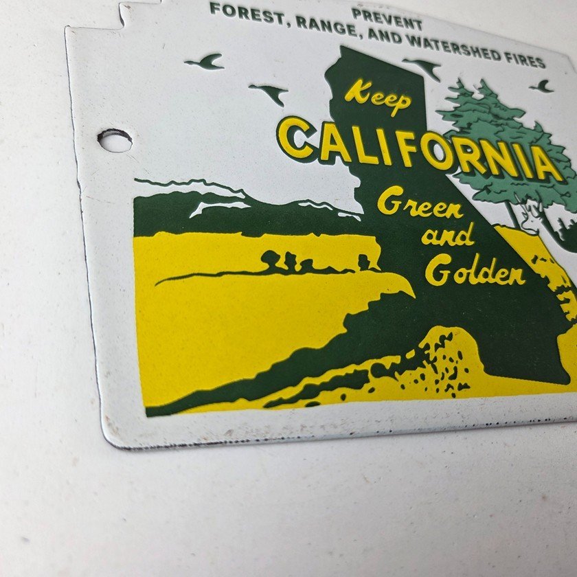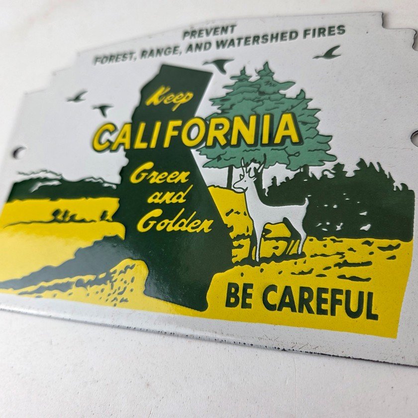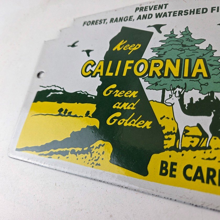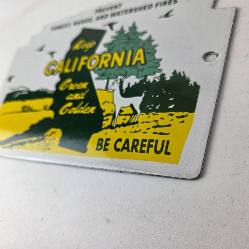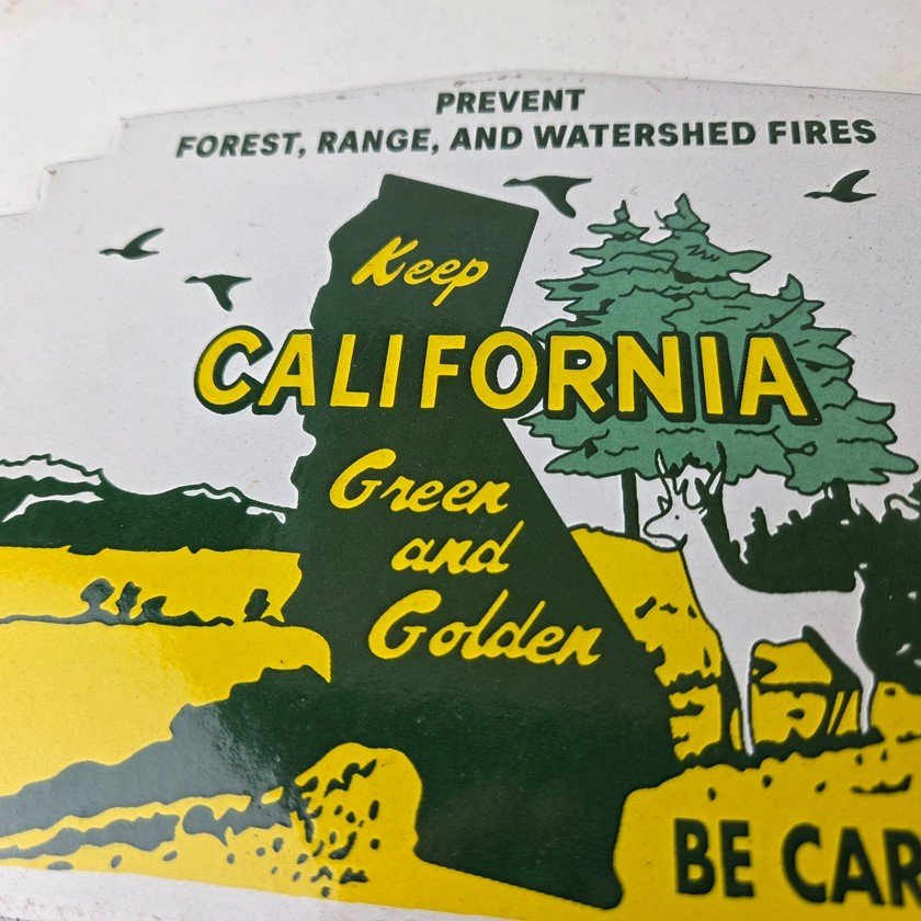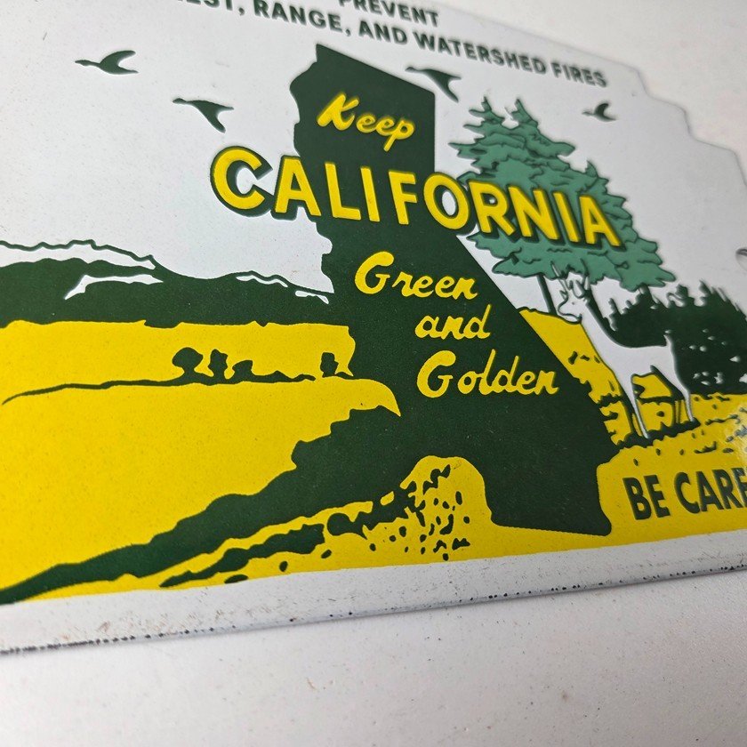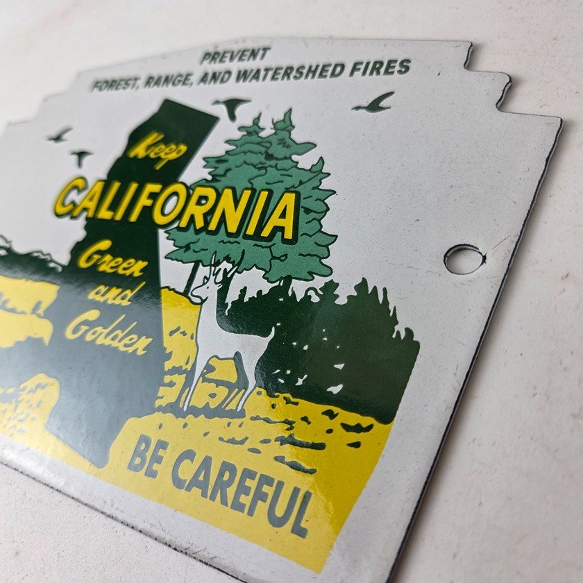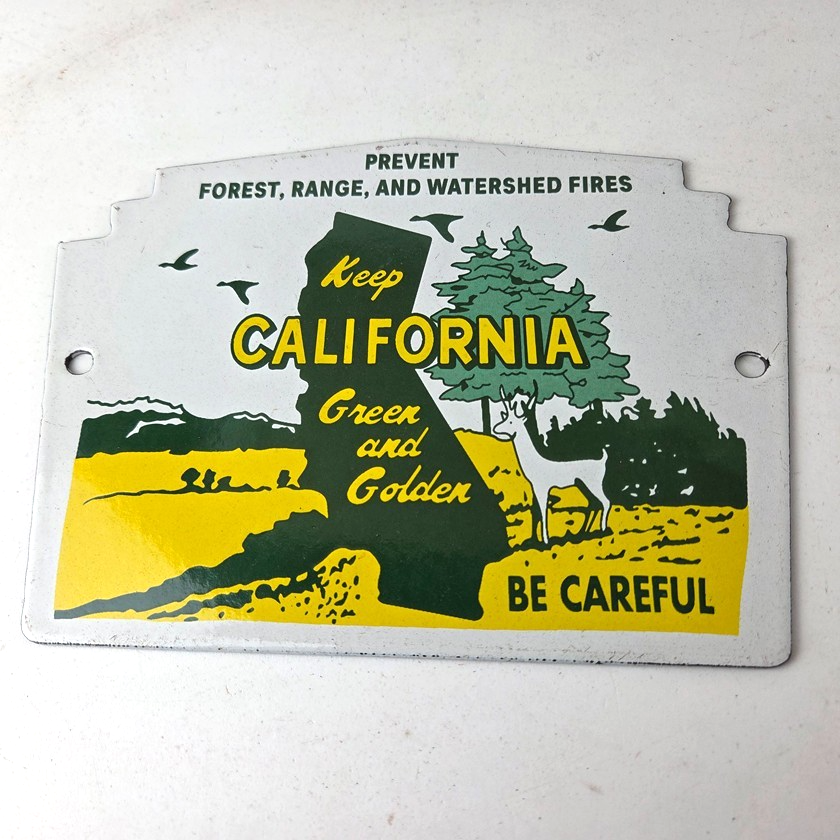This vintage California State porcelain sign features really nice graphic of the state of California. This sign is made of porcelain and measures 7 3/4″ x 5 3/4″. It has nice lettering that says Prevent Forest, Range, and Watershed Fires. Keep Cailfornia Green and Golden. Be Careful.