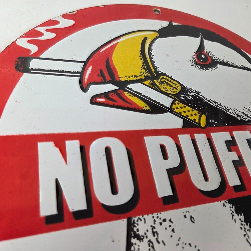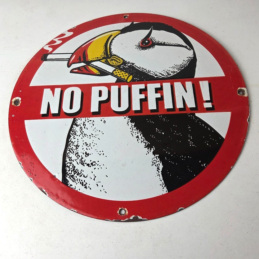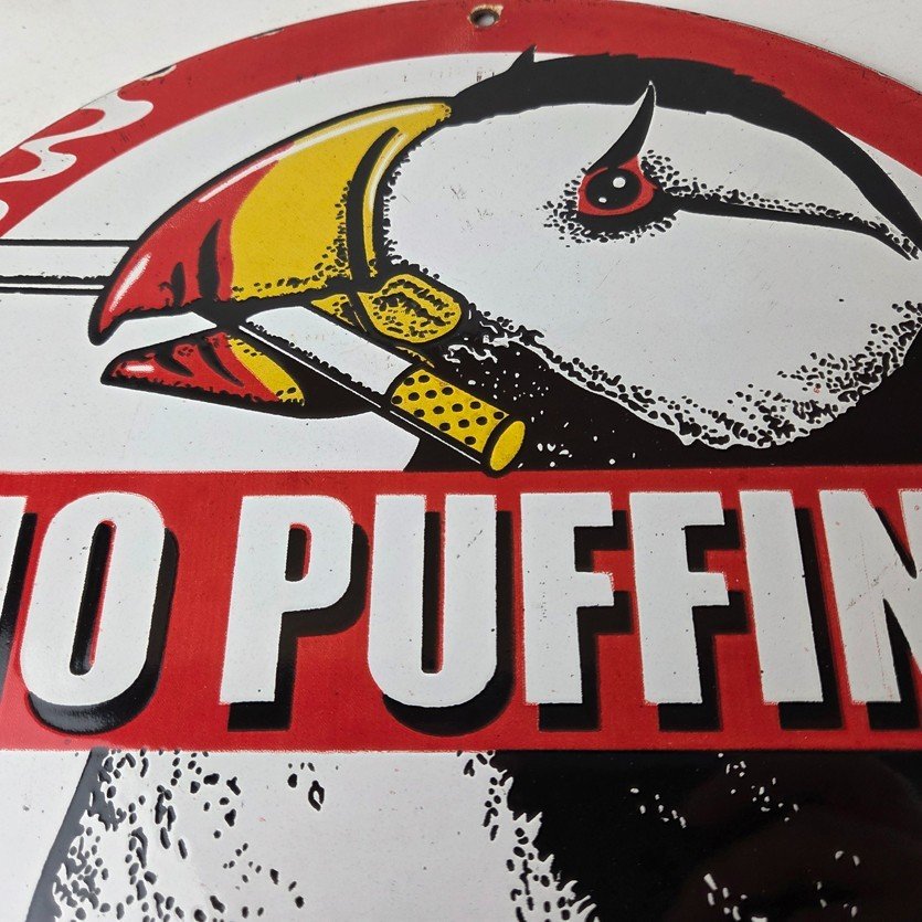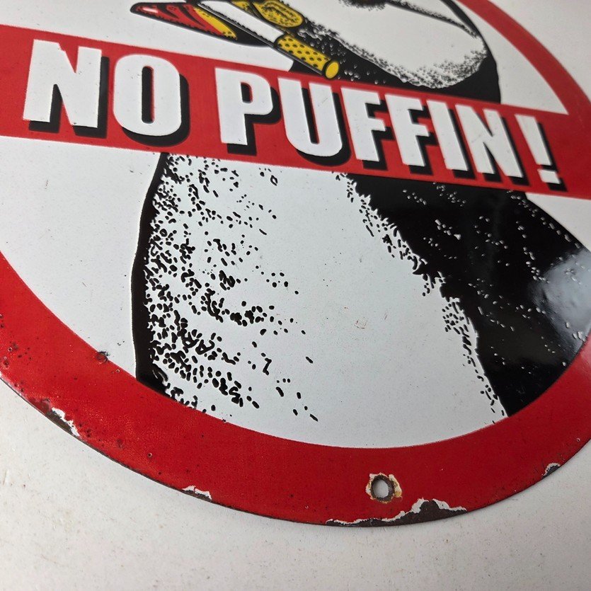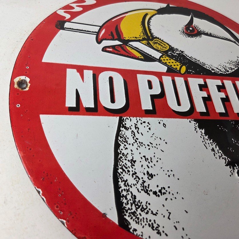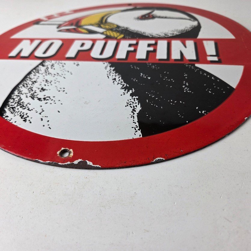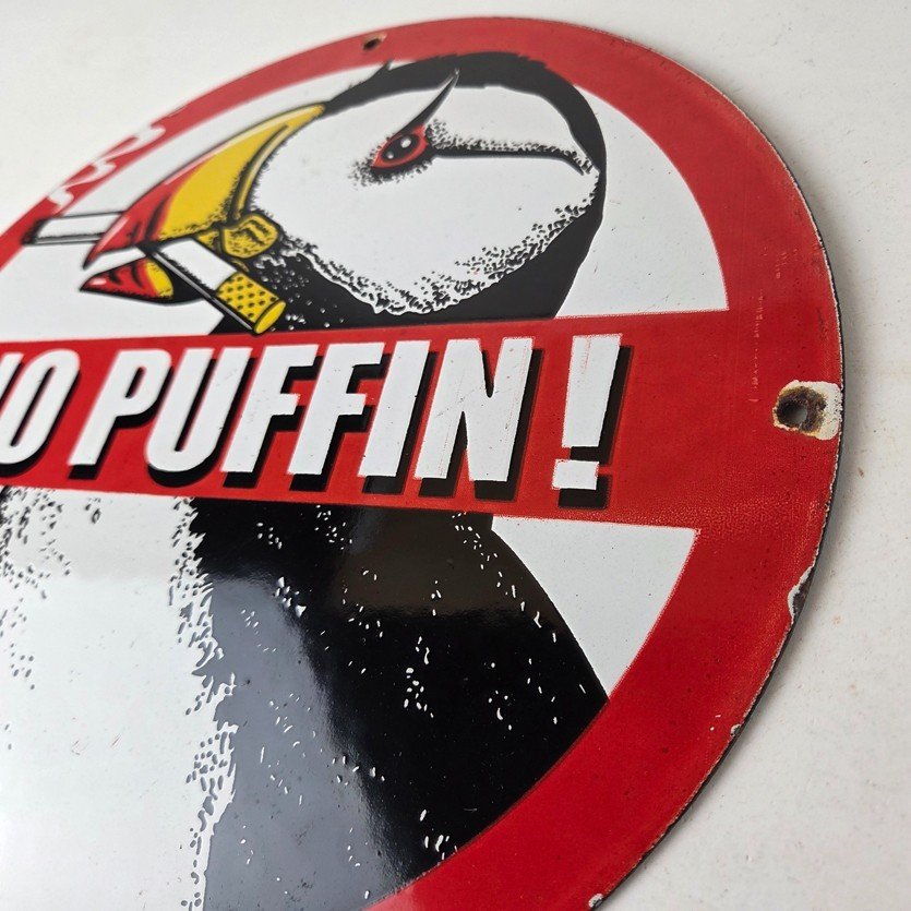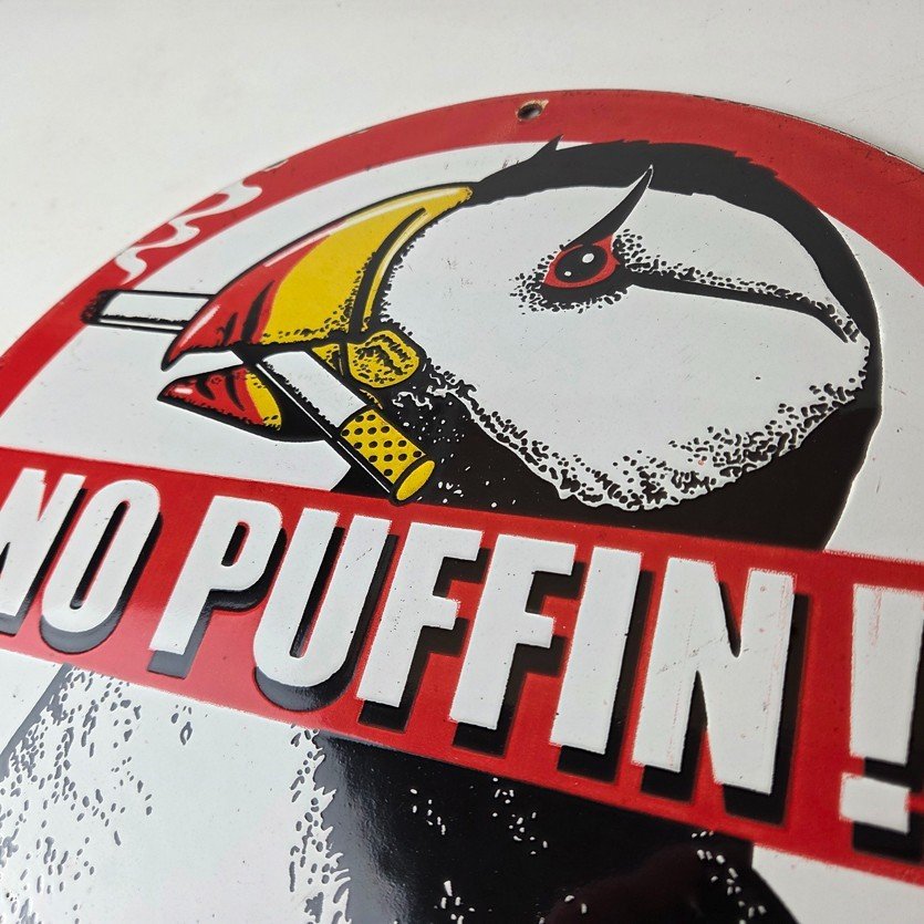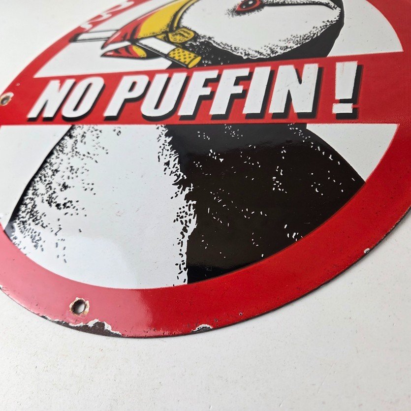 This vintage Cigarette Porcelain sign features the iconic puffin bird and is perfect for collectors of gas and oil advertising memorabilia. The sign measures 12″ and features a vibrant red and black color scheme with bold lettering.