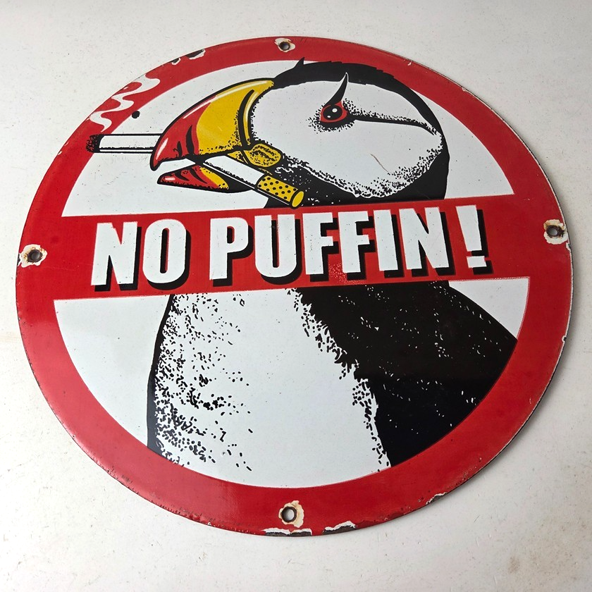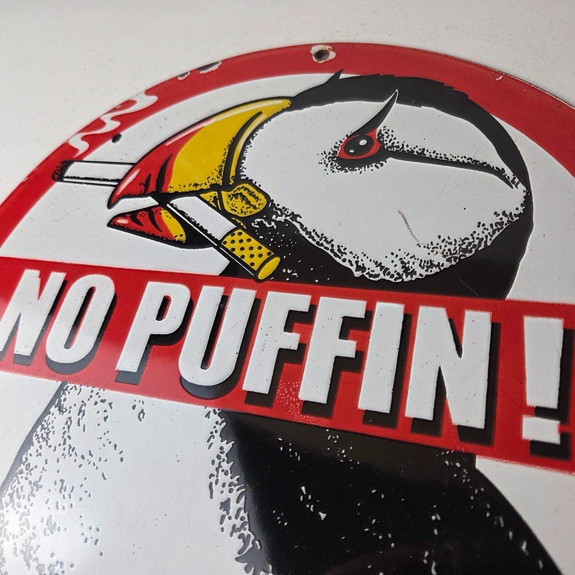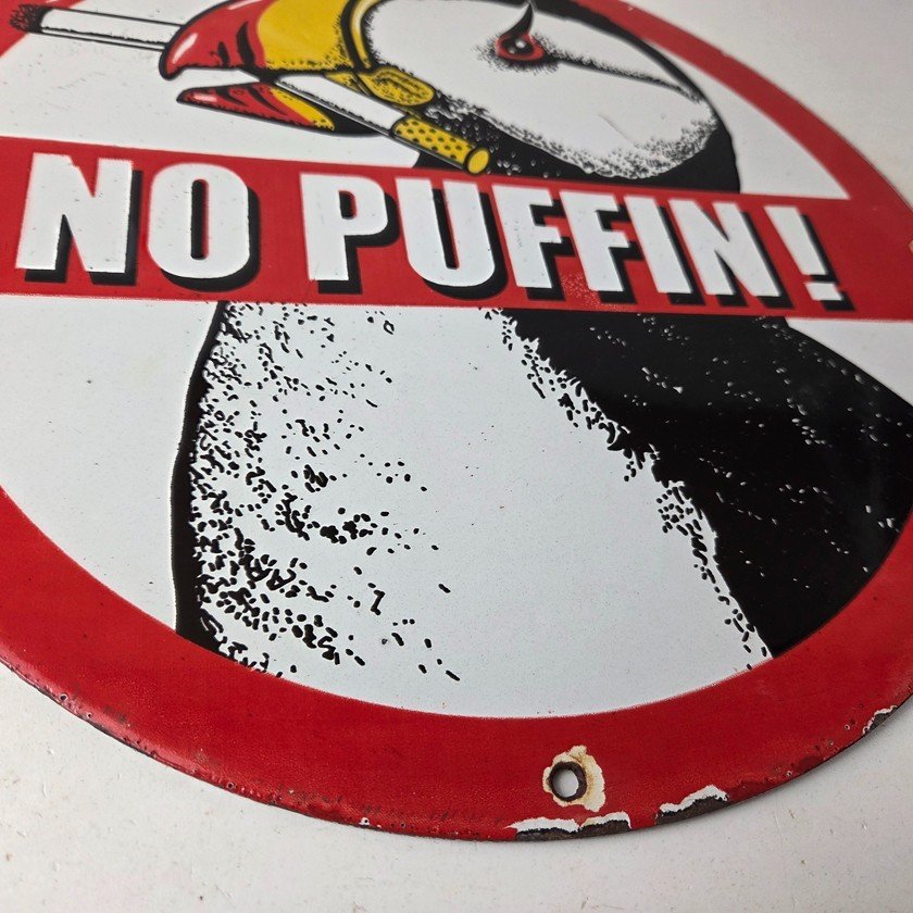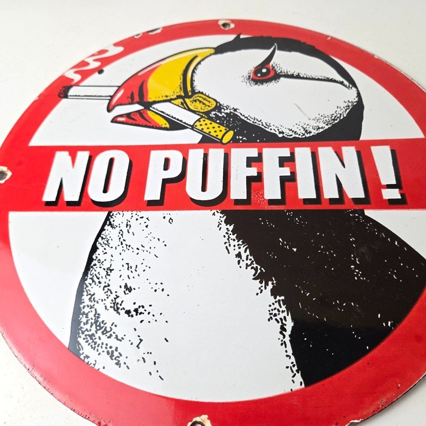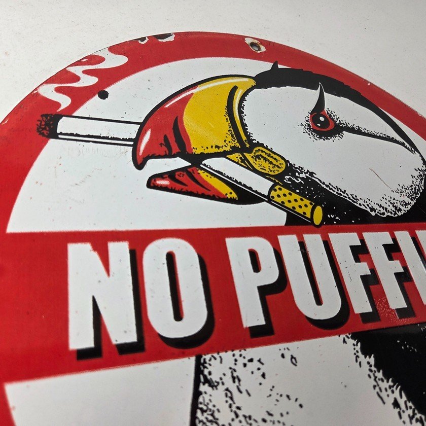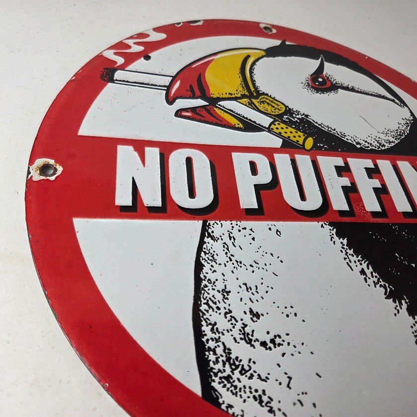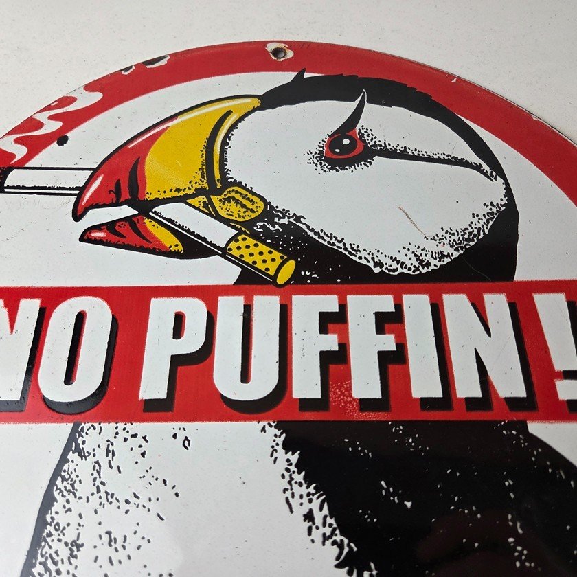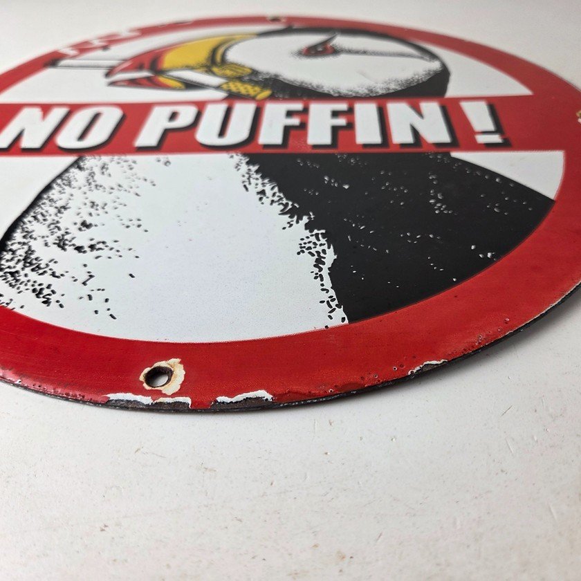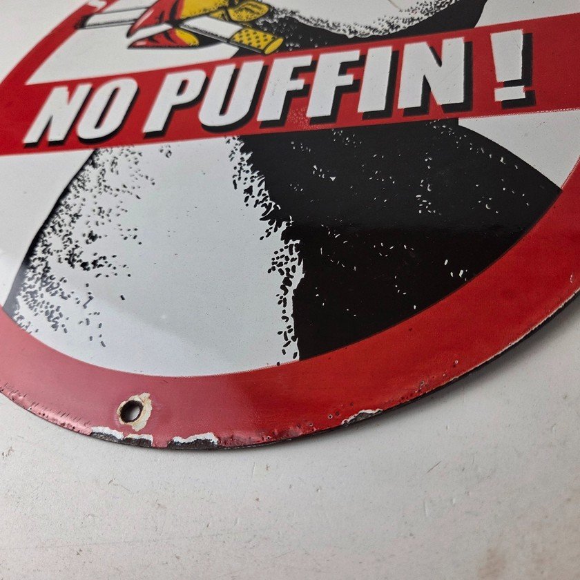 This vintage Cigarette Porcelain sign features the iconic puffin bird and is perfect for collectors of gas and oil advertising memorabilia. The sign measures 12″ and features a vibrant red and black color scheme with bold lettering.