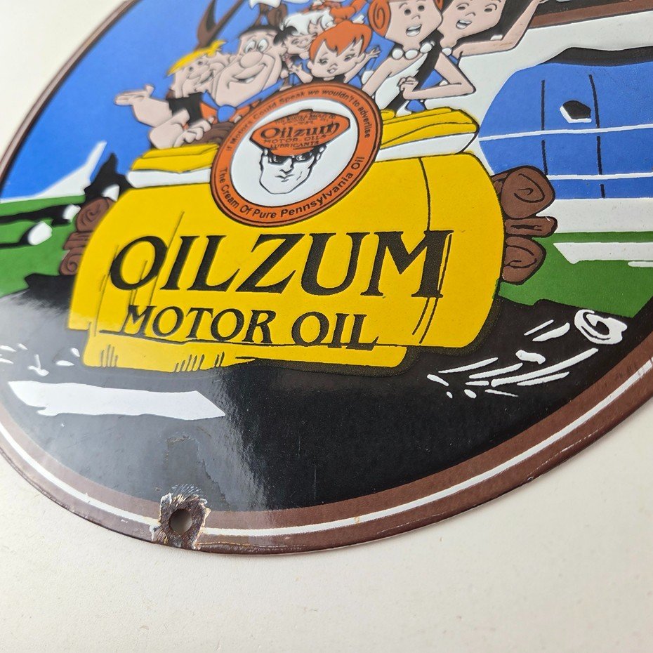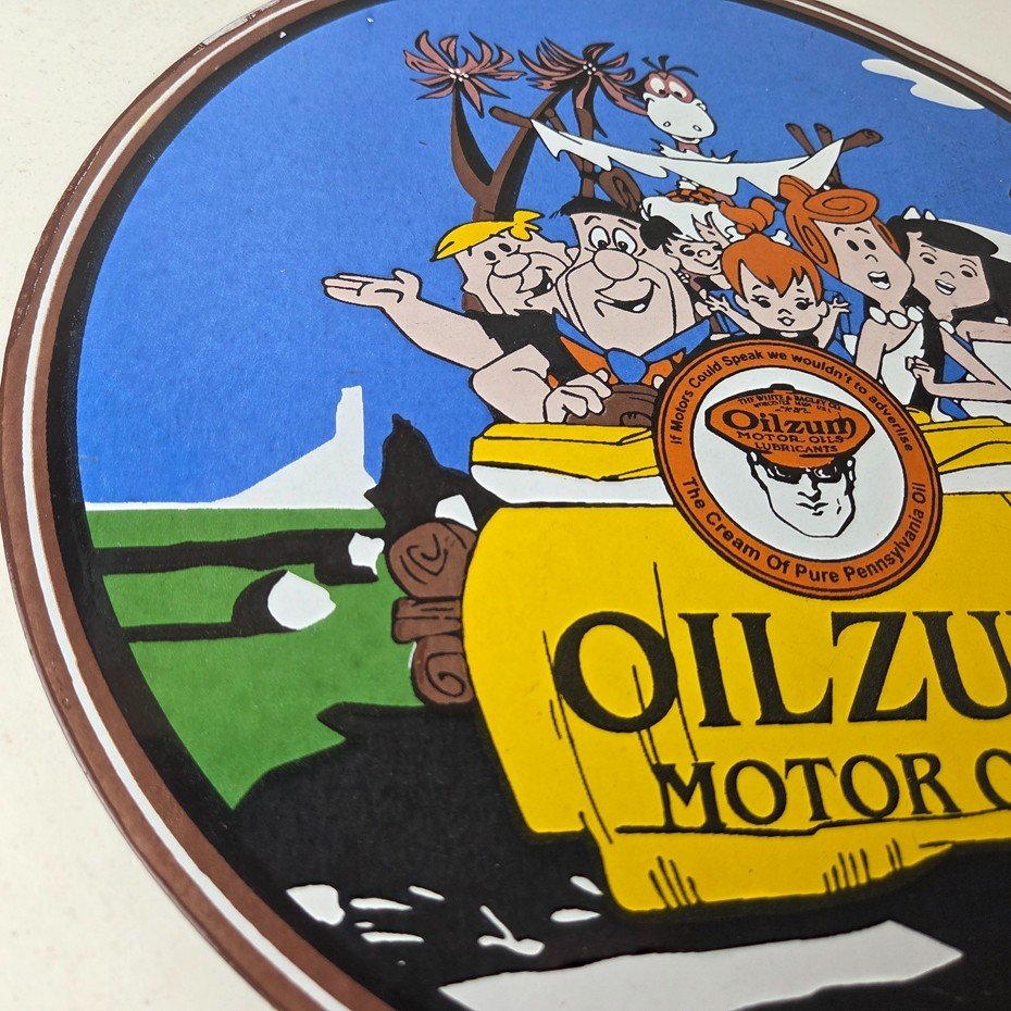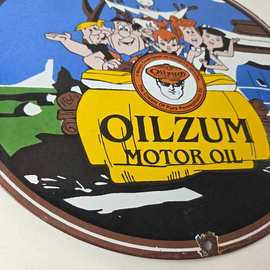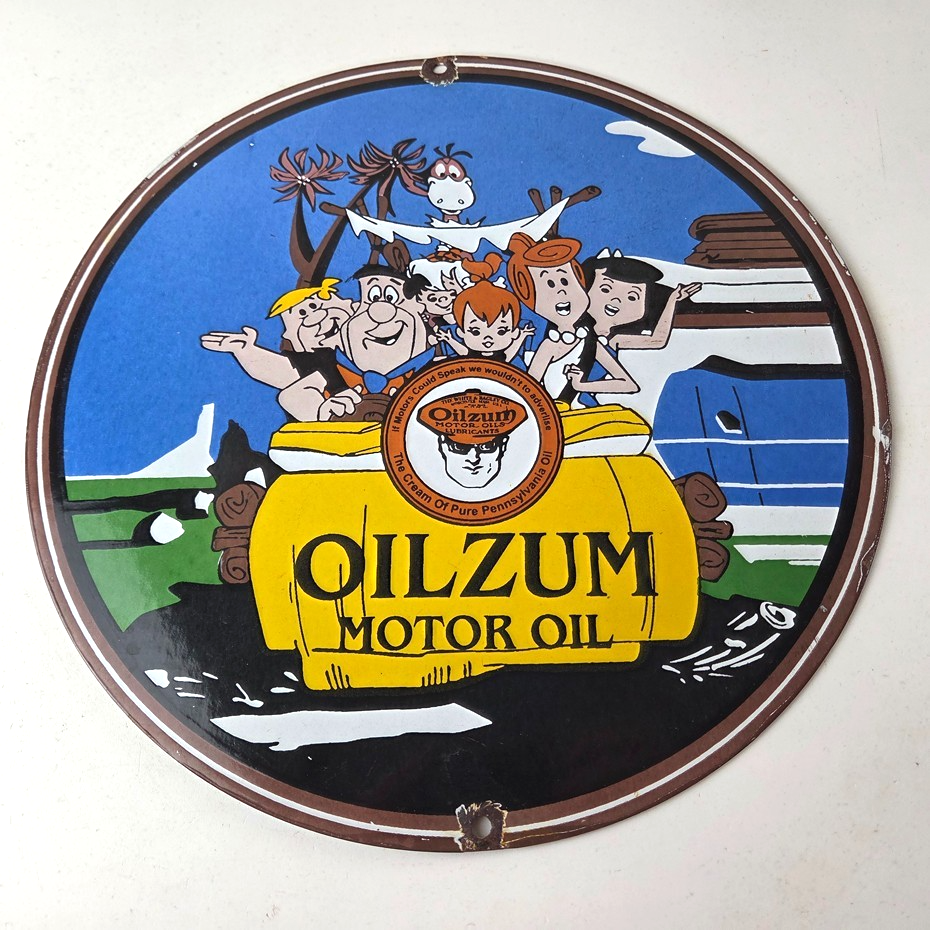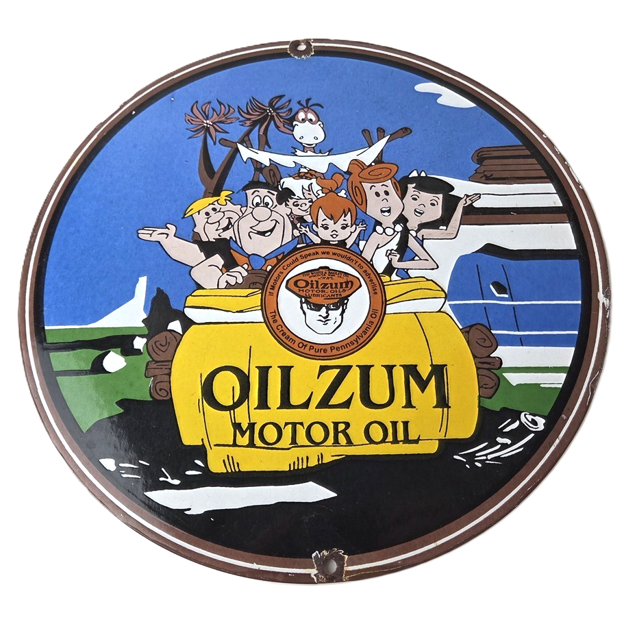 This vintage Oilzum Motor Oils porcelain sign features the Flintstones. The colorful 12″ sign has vibrant colors that make it stand out, and its type of advertising will fit nicely amongst your collection. The brand is Oilzum, which is the most iconic gasoline brand.