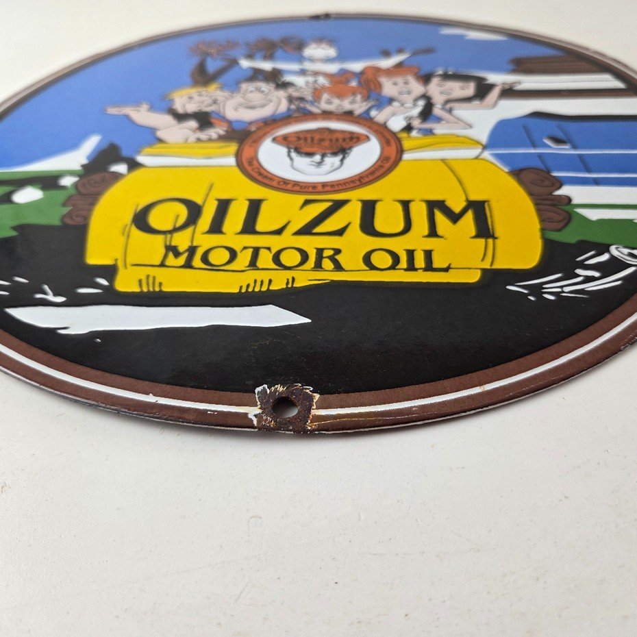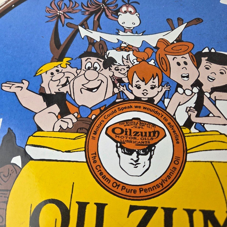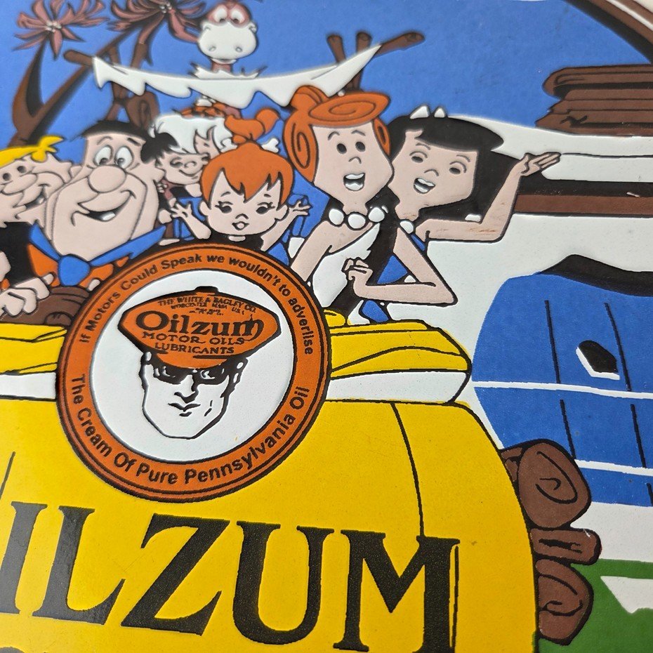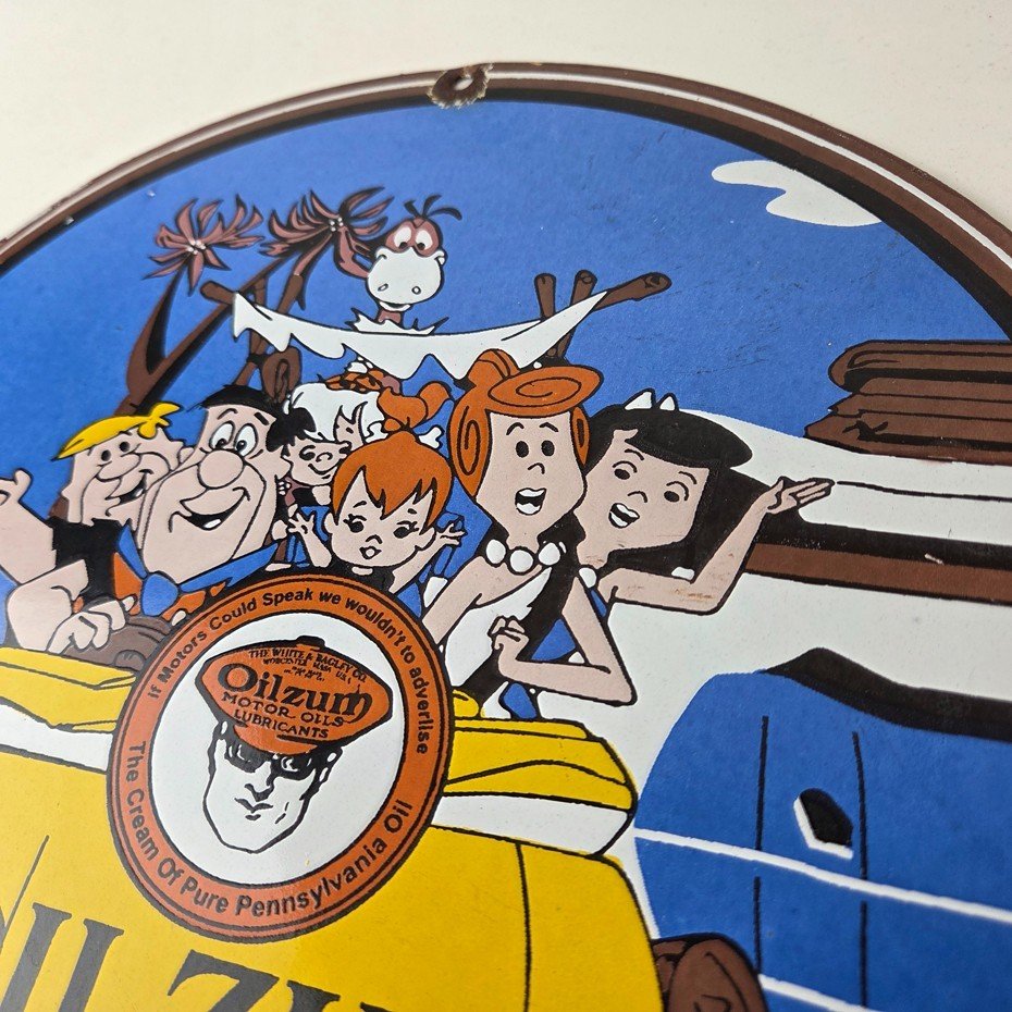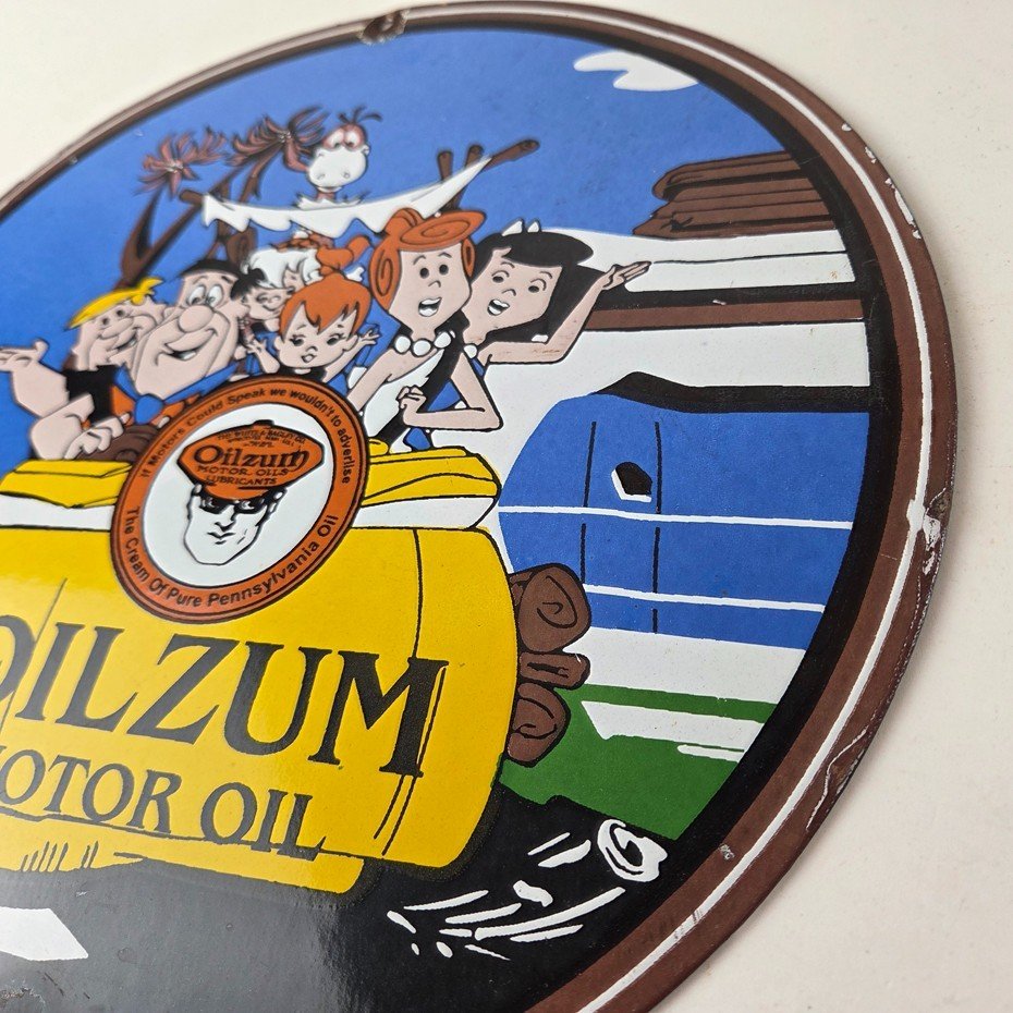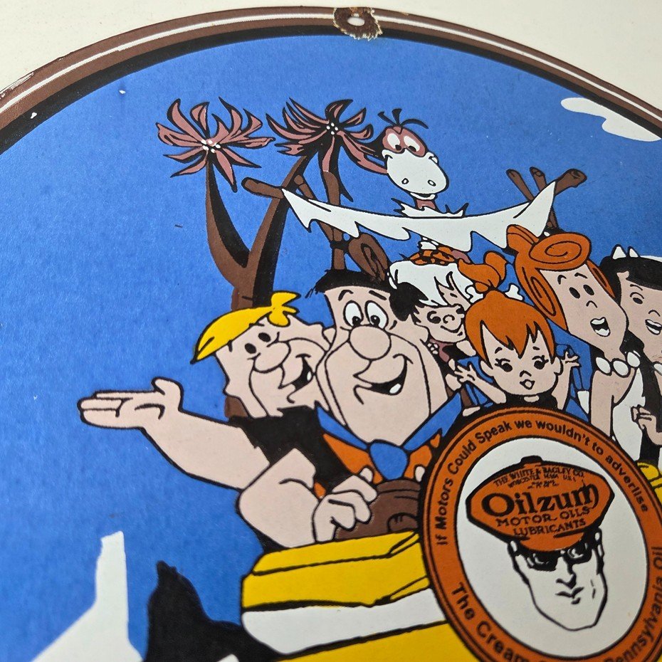 This vintage Oilzum Motor Oils porcelain sign features the Flintstones. The colorful 12″ sign has vibrant colors that make it stand out, and its type of advertising will fit nicely amongst your collection. The brand is Oilzum, which is the most iconic gasoline brand.