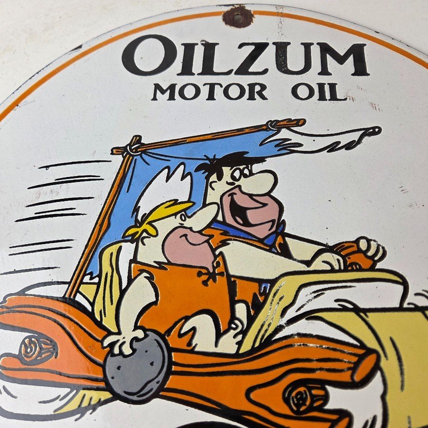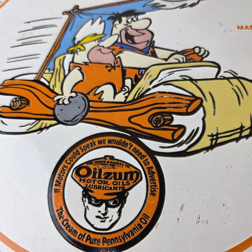 This vintage Oilzum Motor Oils porcelain sign features the race car driver of White & Bagley at the bottom with the Flintstones at the top. The colorful 12″ sign has vibrant orange colors that make it stand out, and its type of advertising will fit nicely amongst your collection. The brand is Oilzum, which is the most iconic gasoline brand.