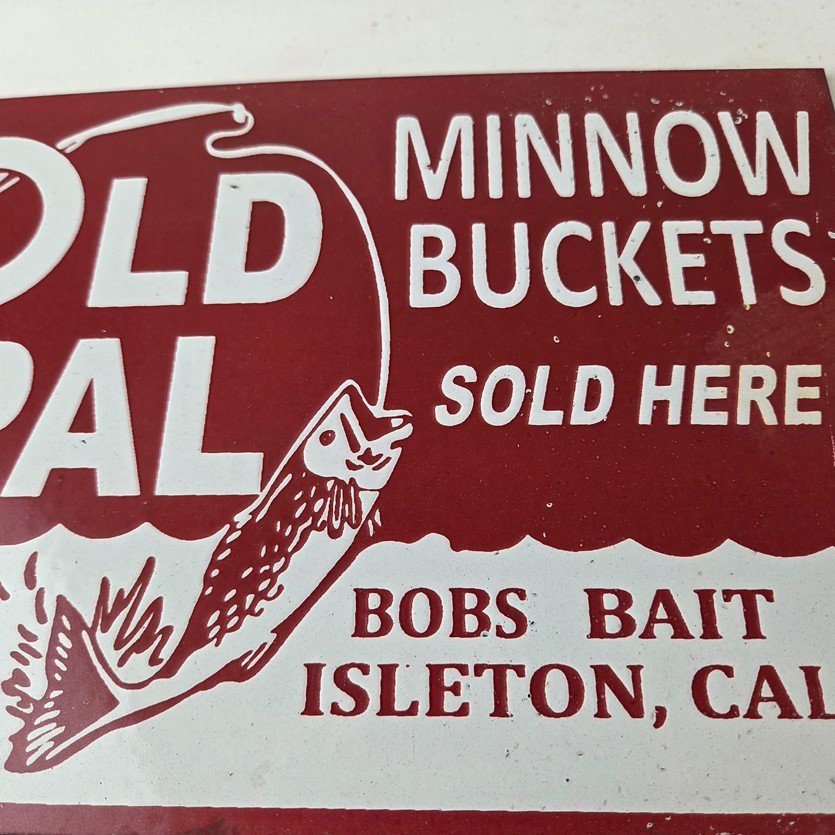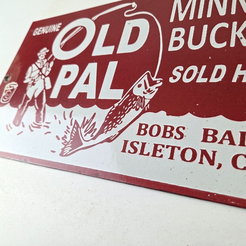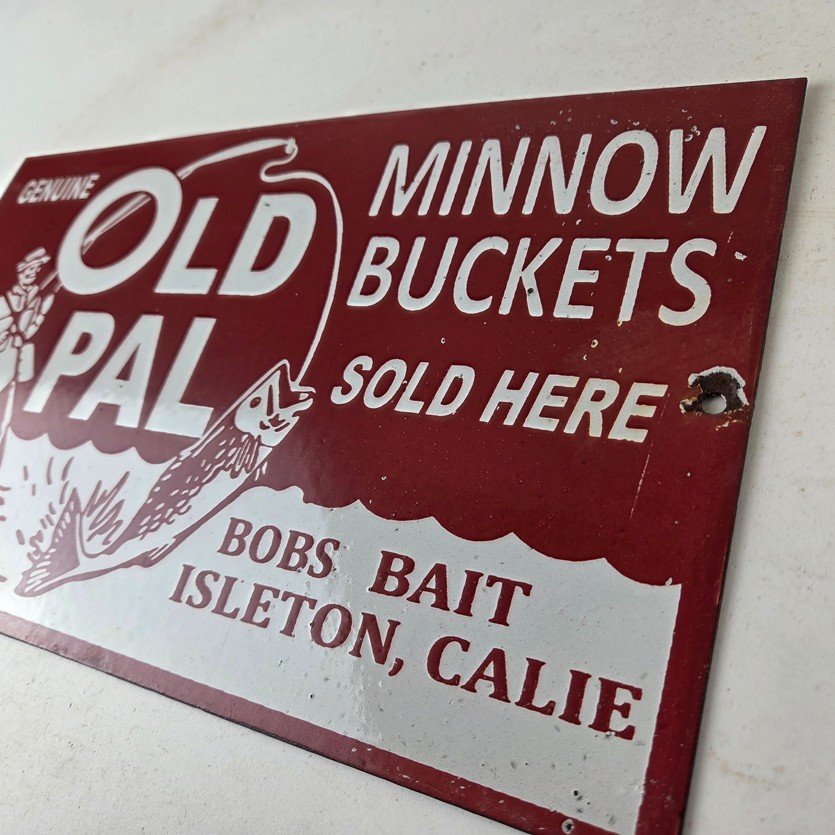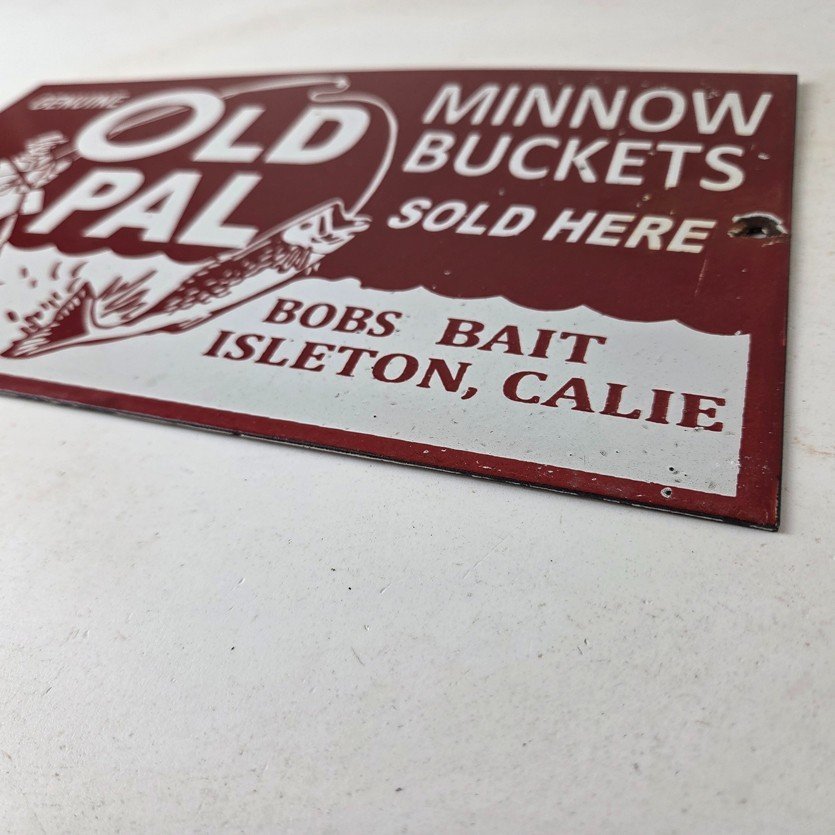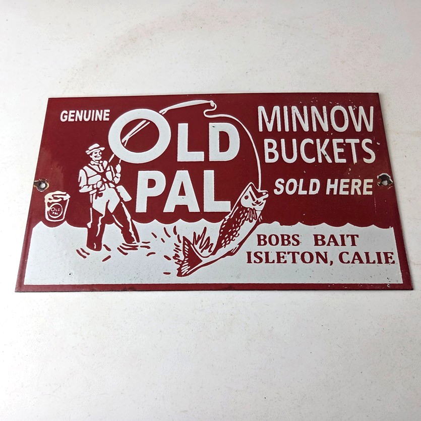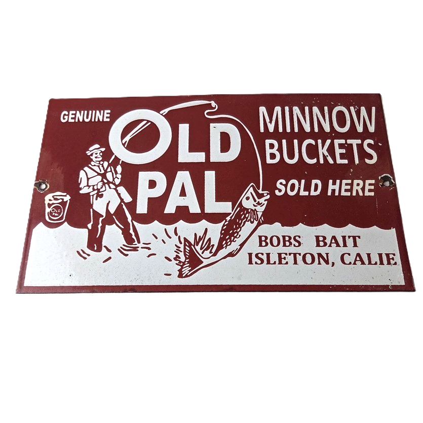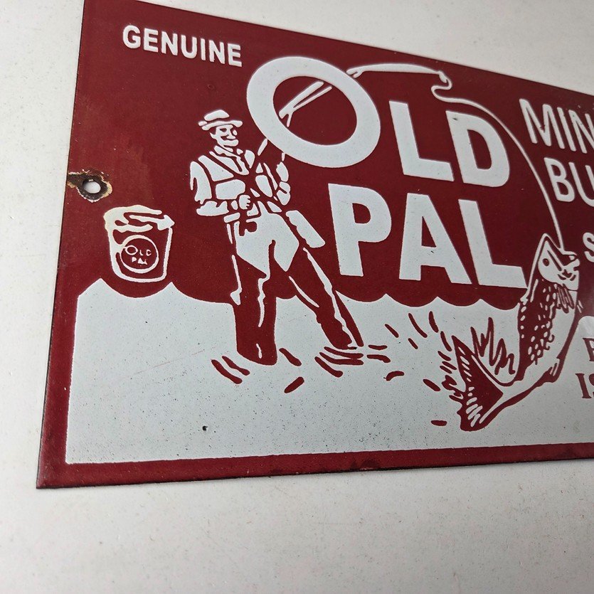 This vintage porcelain Fishing sign has excellent porcelain and color. This sign has large Old Pal lettering and prominently displays the brand name in bold lettering. The sign is designed to promote Fishing minnow buckets and is perfect for any enthusiast of fishing or vintage advertising. This sign will enhance your man cave, boat storage, collection, shop, or garage. It is your chance to own a piece of Penn advertising.