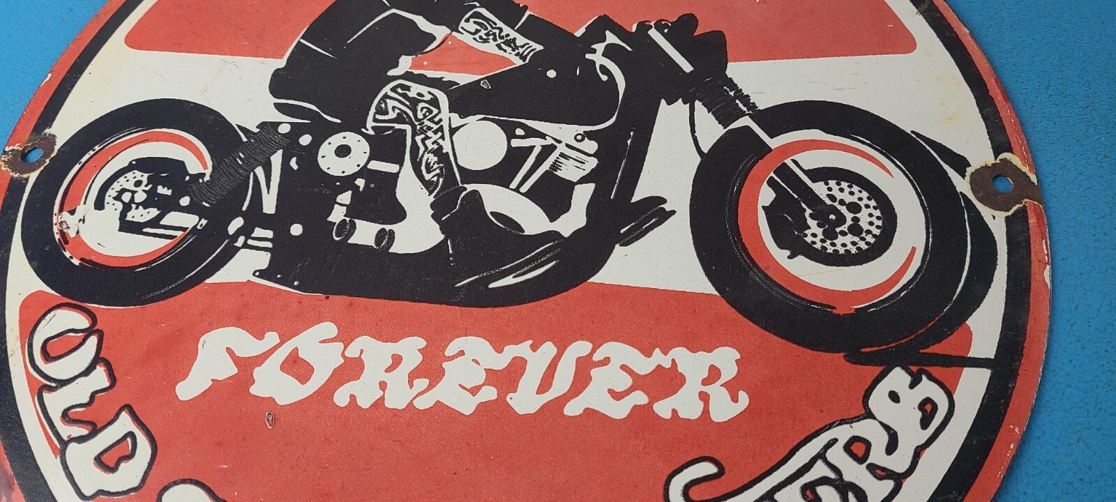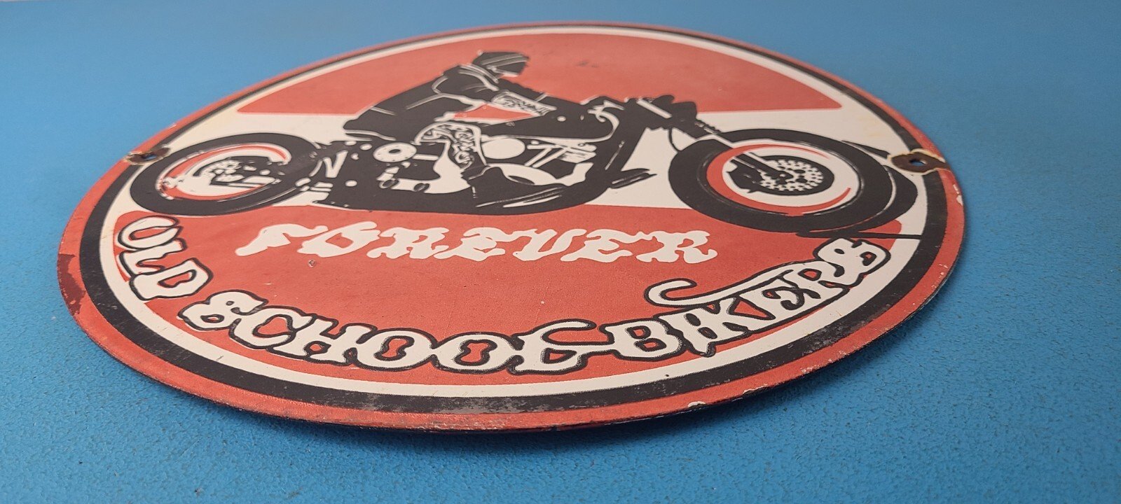 This vintage Old School Bikers Forever porcelain sign measures 12″ and features bold black & red colors and the person riding a motorcycle. The sign is made of porcelain on both sides and has the graphic on one side.
