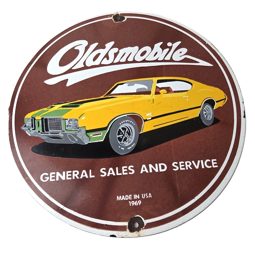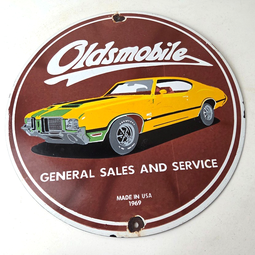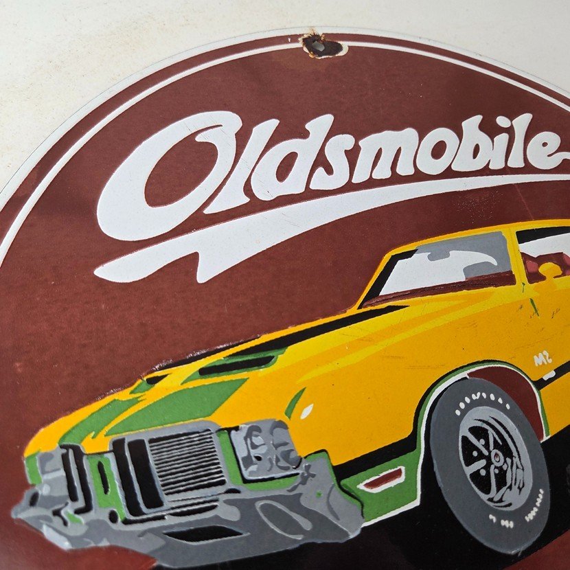For sale is an Oldsmobile porcelain sign featuring an old car advertising for Oldsmobile. Measuring at 12″, this sign is the perfect size to display in your garage or man cave.