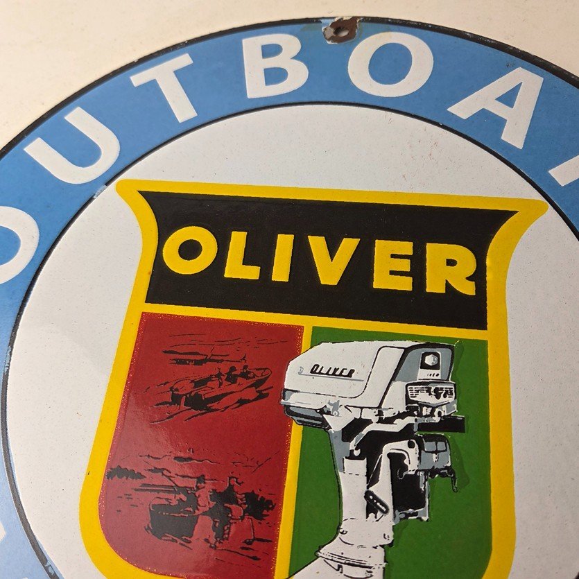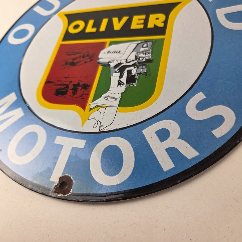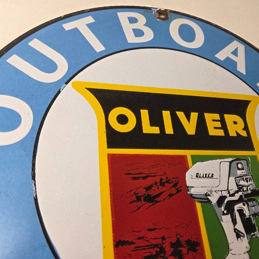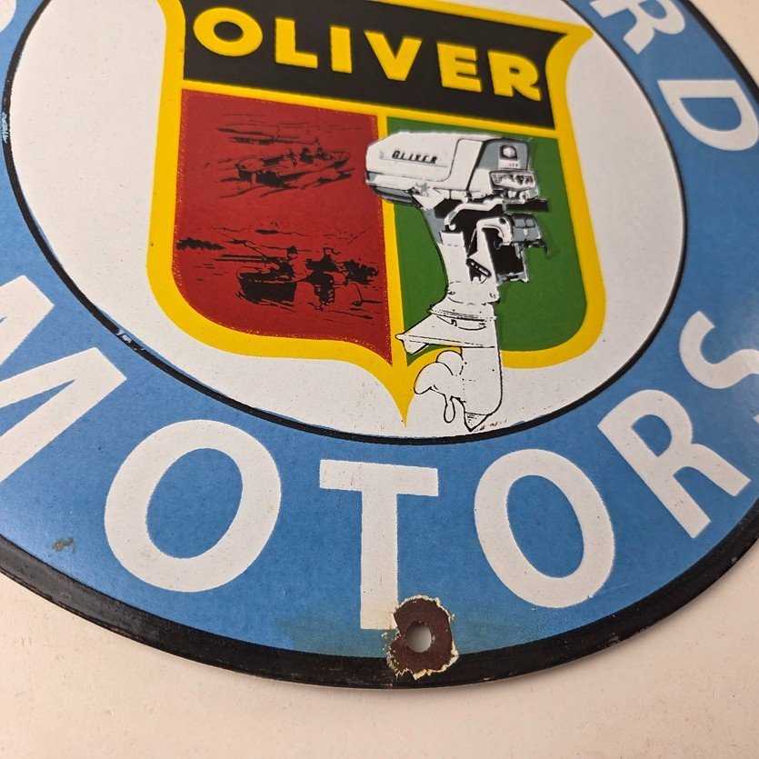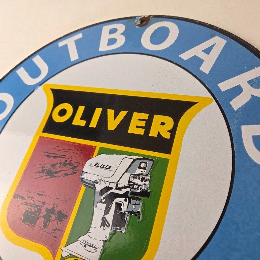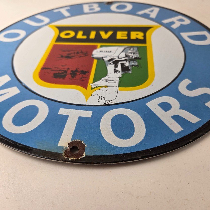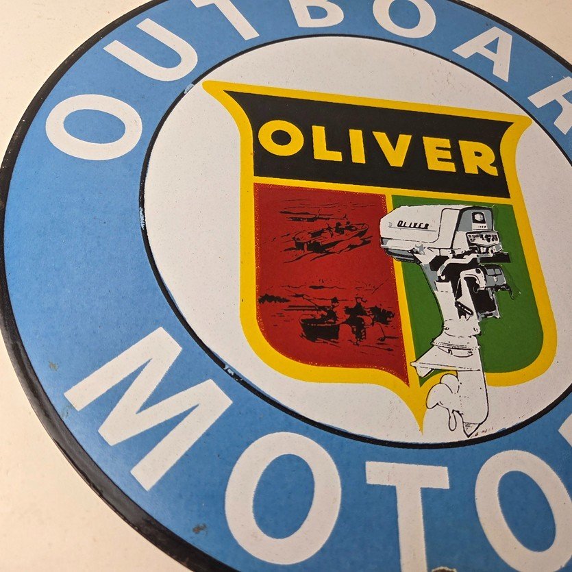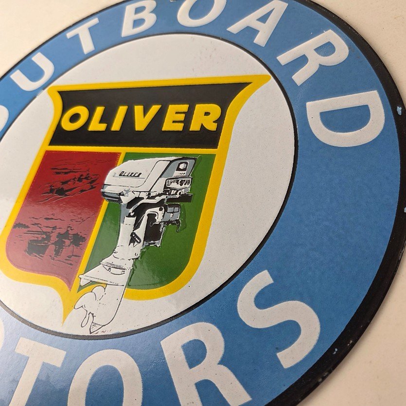 This vintage Oliver Outboards porcelain sign has beautiful porcelain and features the iconic Oliver Outboard Gas Motors logo. Measuring 12″ across, this sign is perfect for any collector or enthusiast of gas and oil memorabilia.