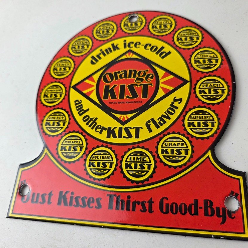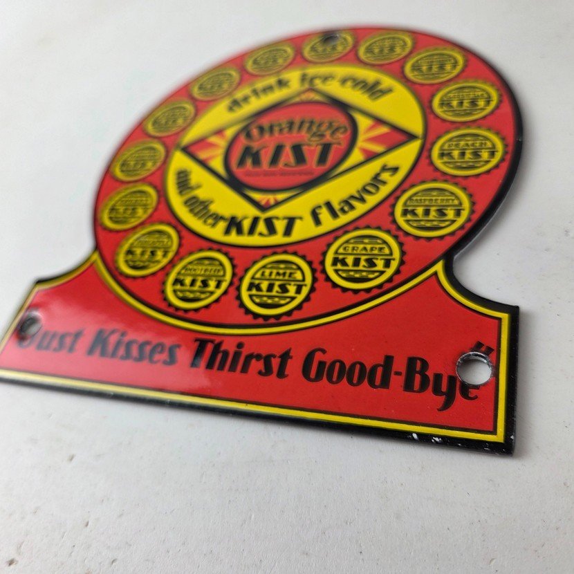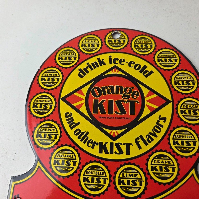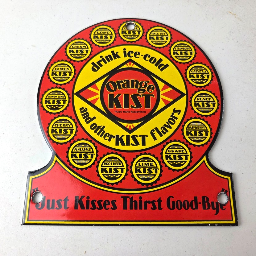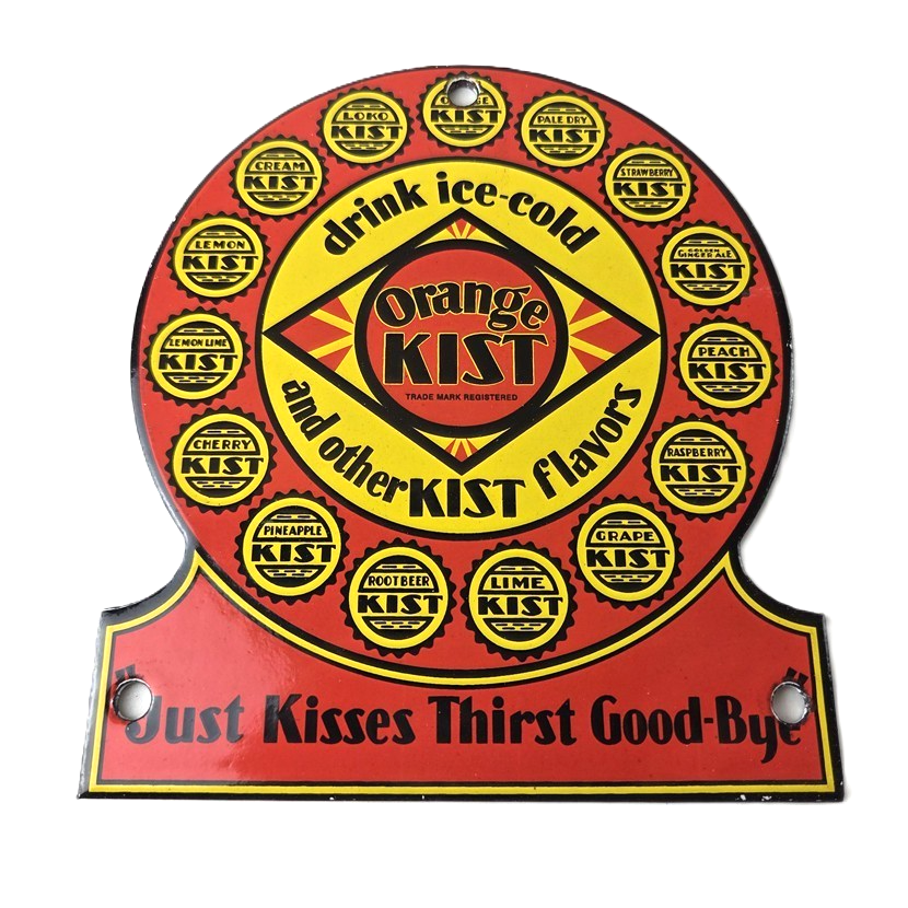 This vintage Orange Kist porcelain sign features the iconic Orange Kist Soda beverage theme. Add a vintage touch to your gas station or soda beverage collection with this Orange Crush sign. Measuring 5 3/4″ by 5″, this sign has excellent colors and porcelain.