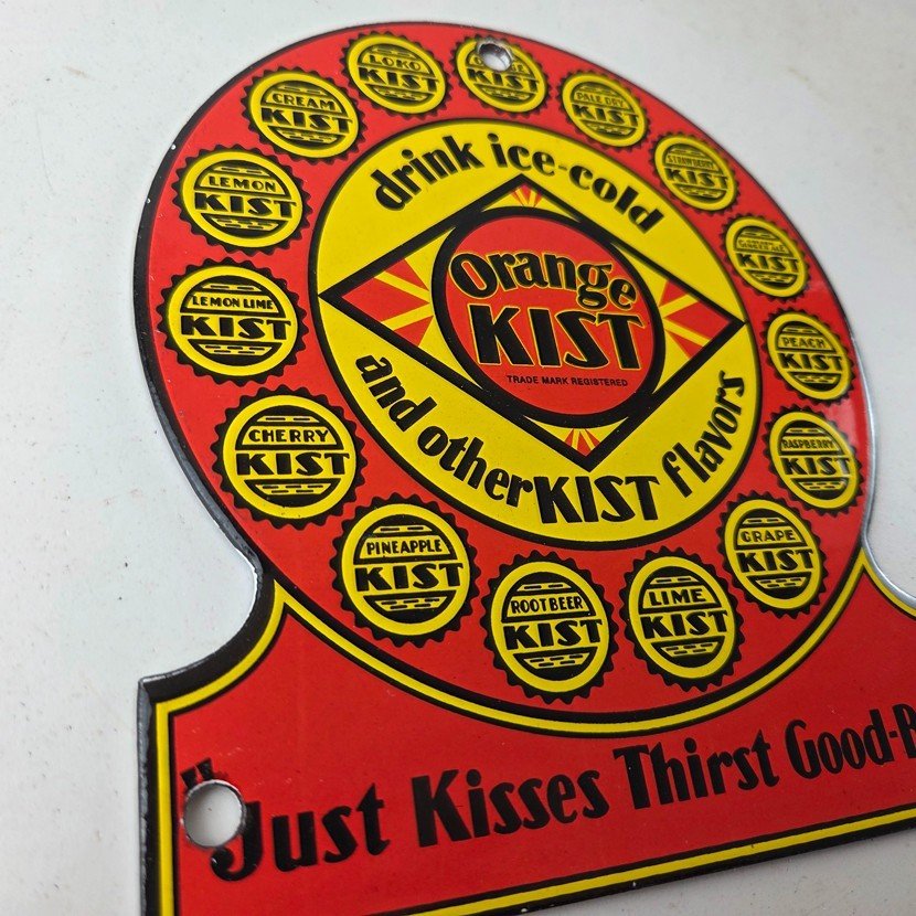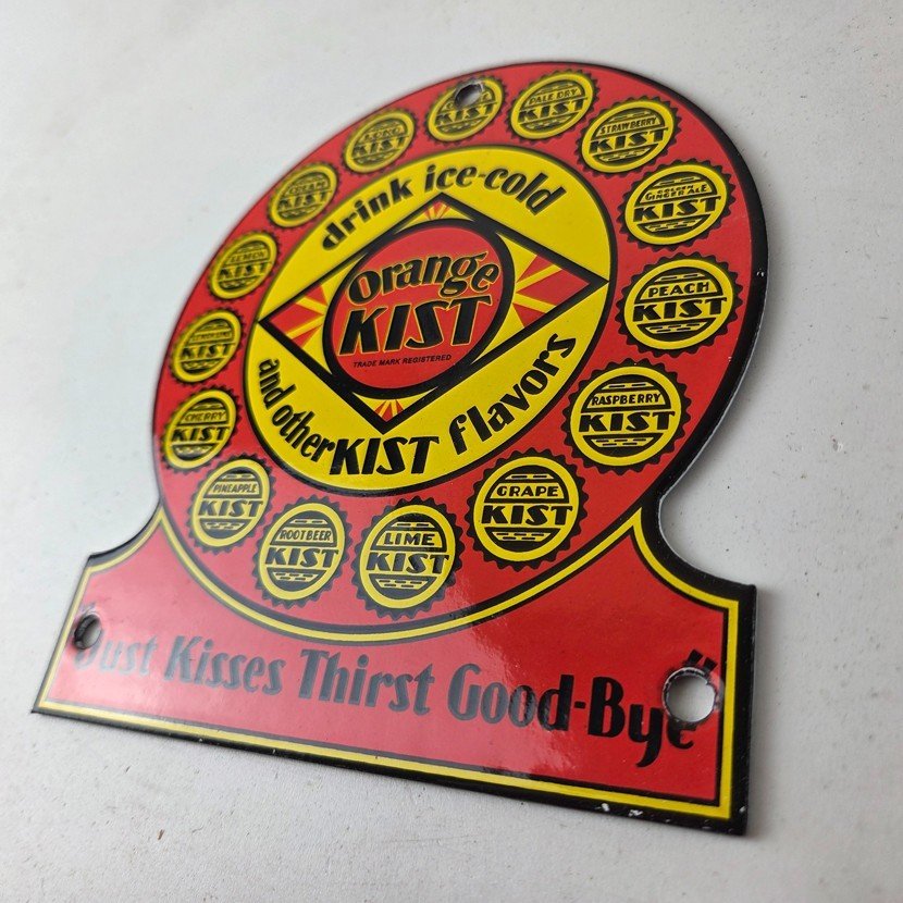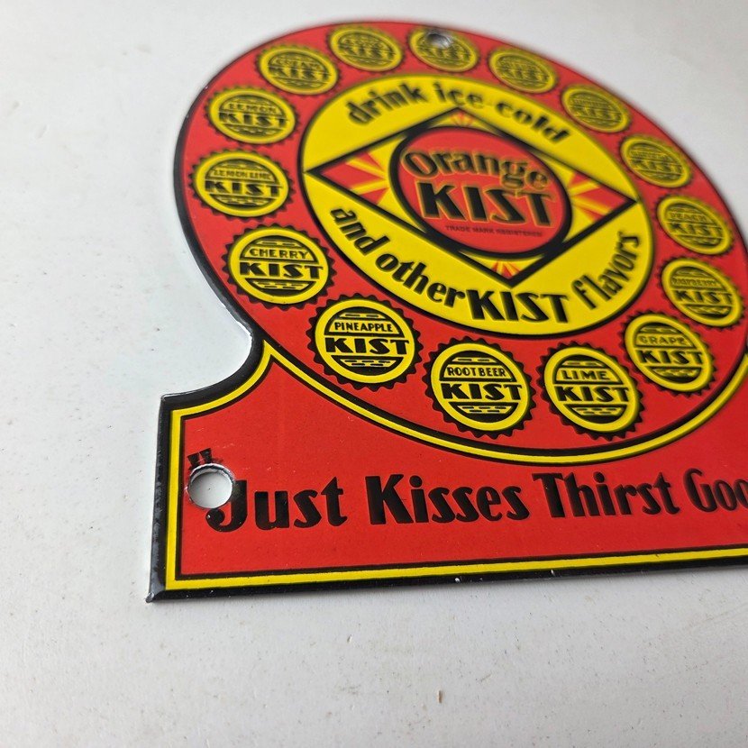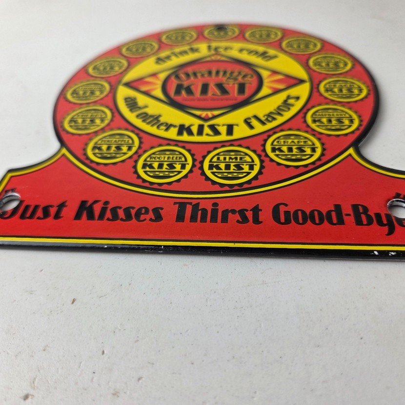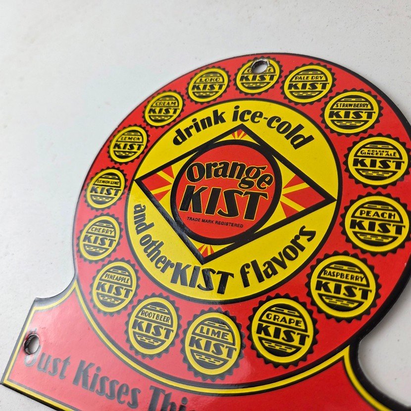 This vintage Orange Kist porcelain sign features the iconic Orange Kist Soda beverage theme. Add a vintage touch to your gas station or soda beverage collection with this Orange Crush sign. Measuring 5 3/4″ by 5″, this sign has excellent colors and porcelain.