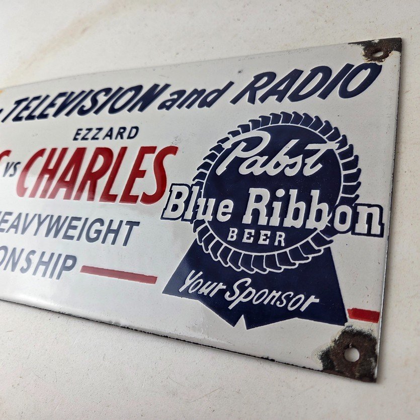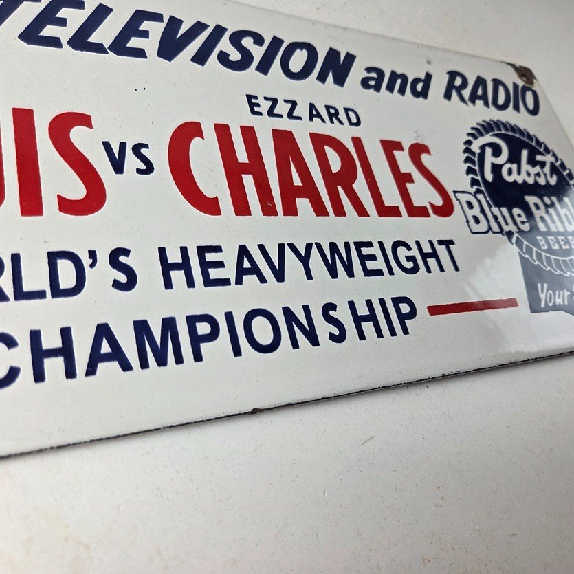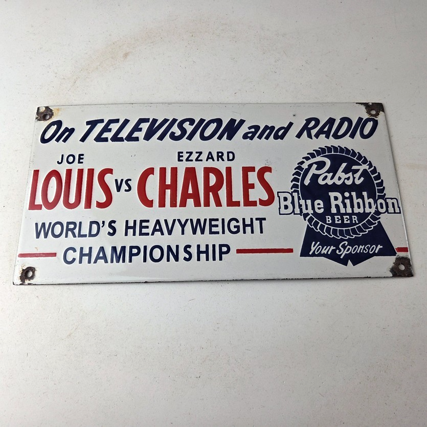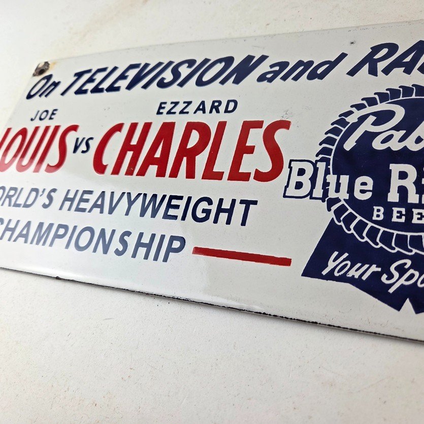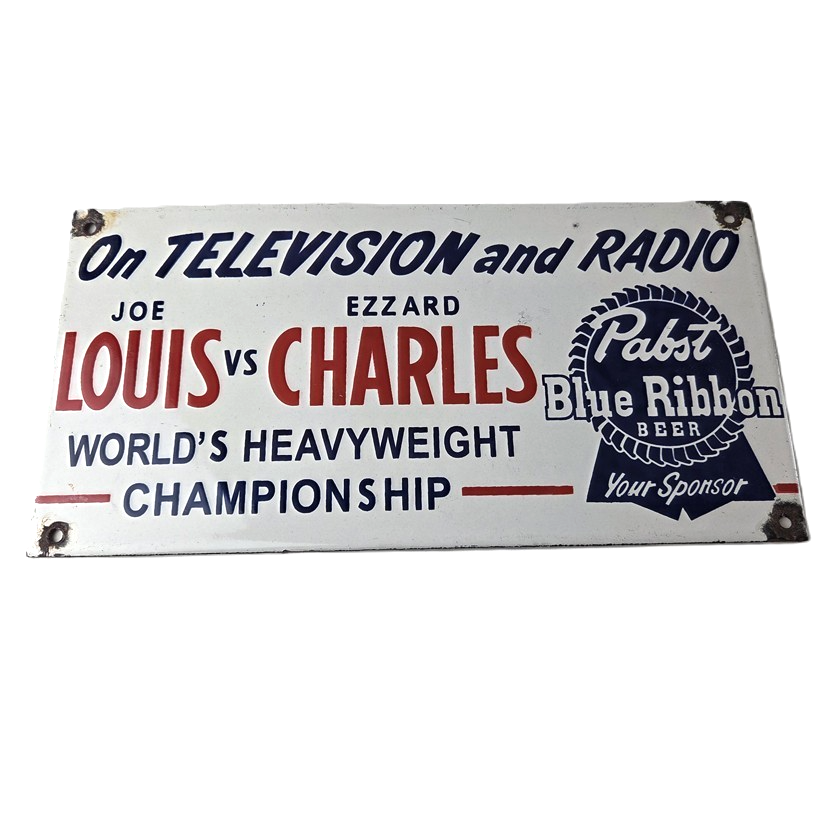 This vintage Pabst Blue Ribbon Beer porcelain sign features the iconic blue ribbon graphic with the large lettering for Joe Louis vs Ezzard Charles. Add a vintage touch to your gas station or soda beverage collection with this alcohol beer sign. Measuring 12 inches by 6 inches, this sign has excellent colors and porcelain.