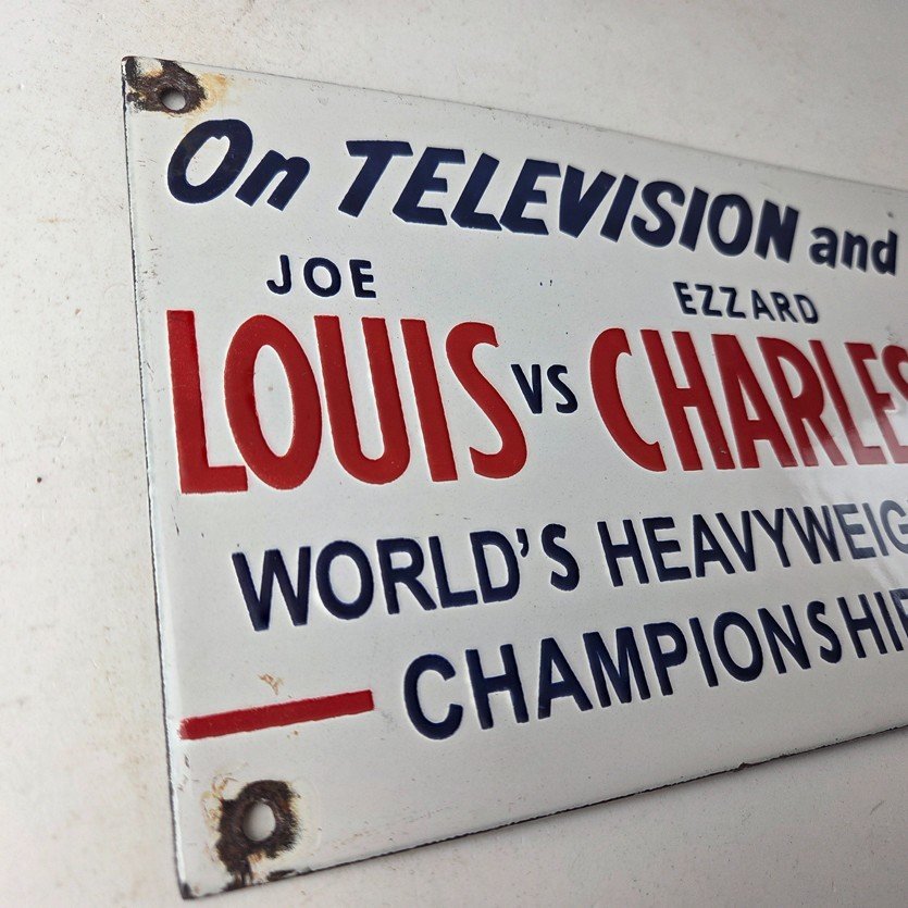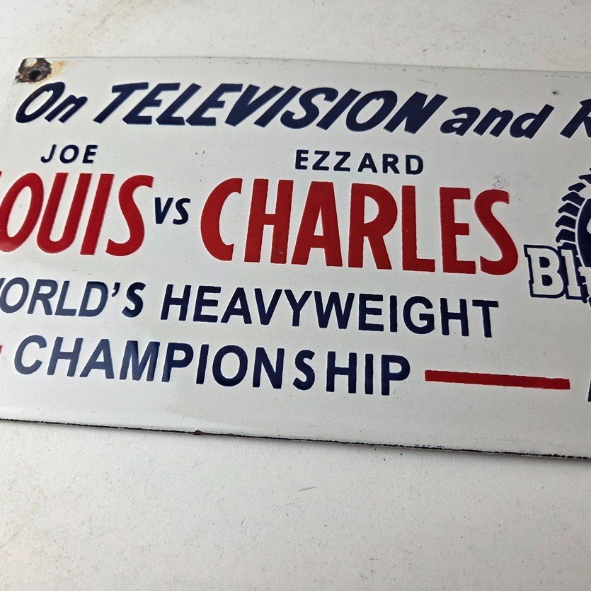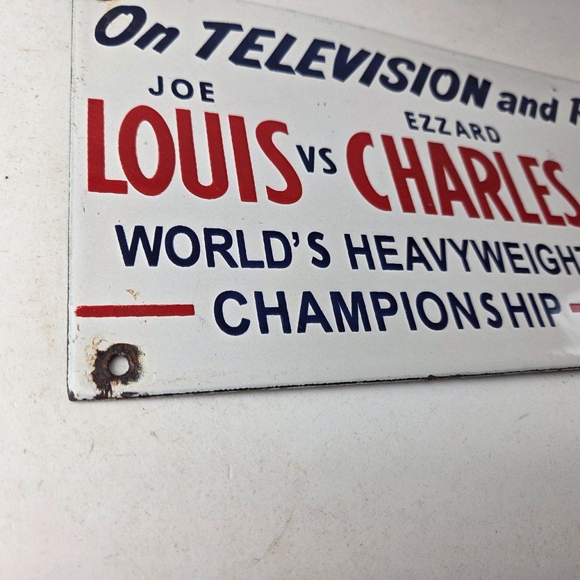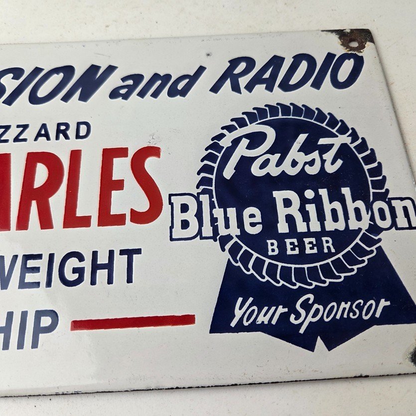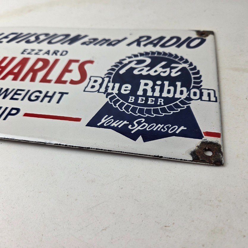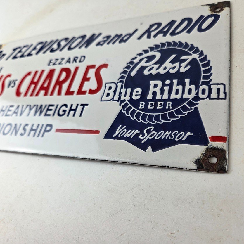 This vintage Pabst Blue Ribbon Beer porcelain sign features the iconic blue ribbon graphic with the large lettering for Joe Louis vs Ezzard Charles. Add a vintage touch to your gas station or soda beverage collection with this alcohol beer sign. Measuring 12 inches by 6 inches, this sign has excellent colors and porcelain.