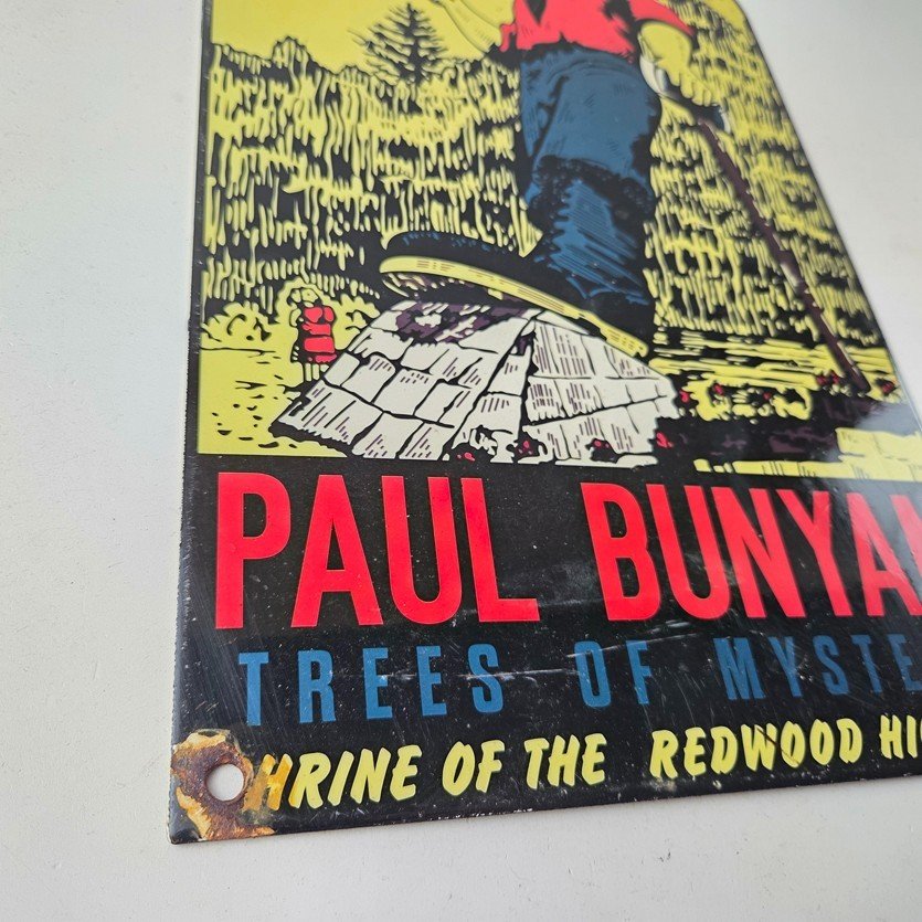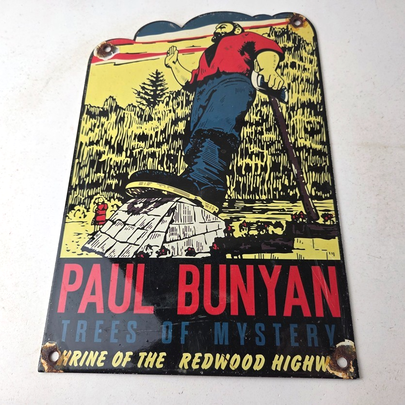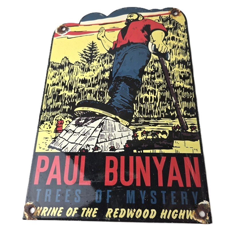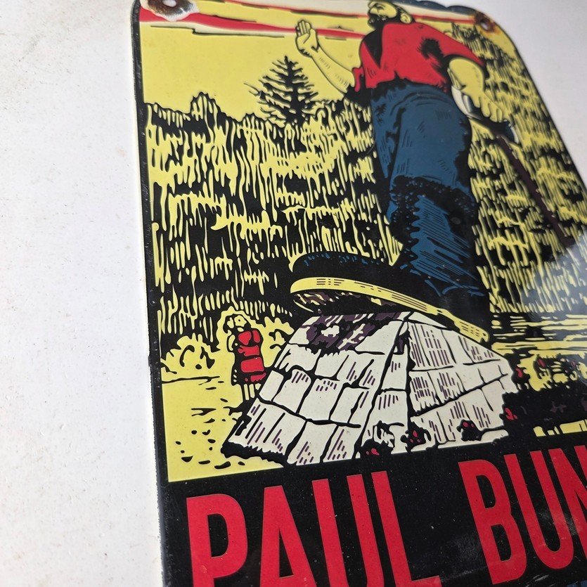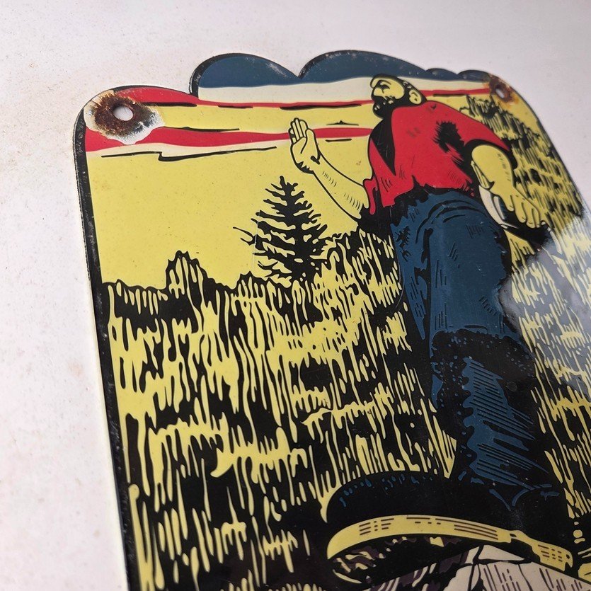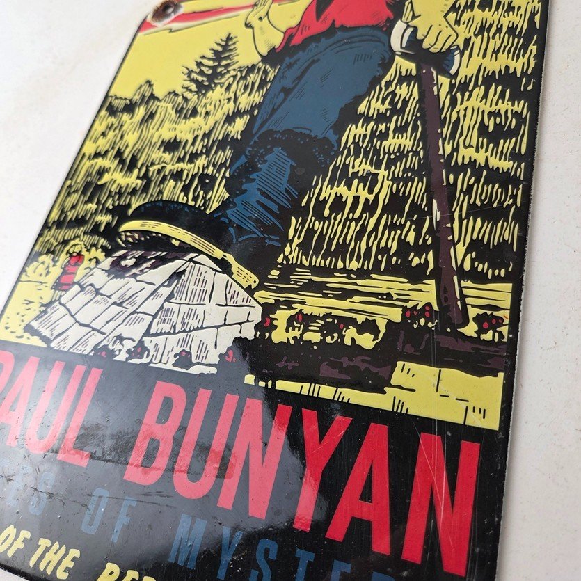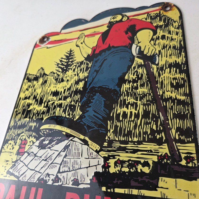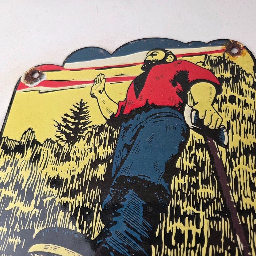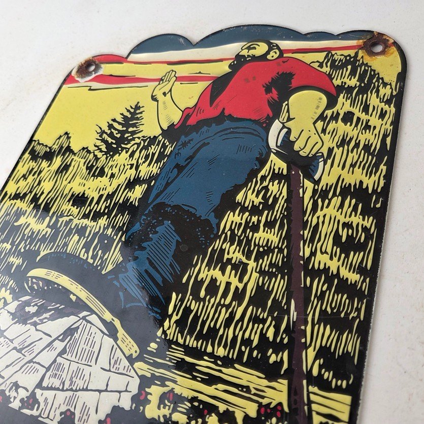 This vintage Paul Bunyan porcelain sign is in excellent condition and has really nice porcelain on both sides. This sign measures 8″ across by 12″ tall.