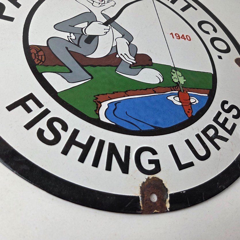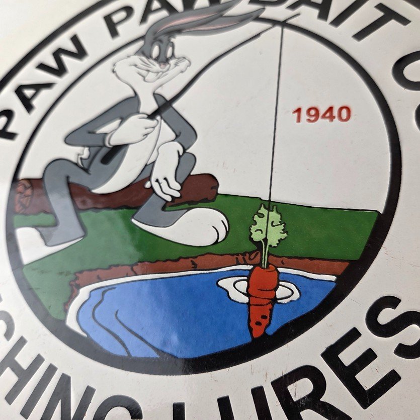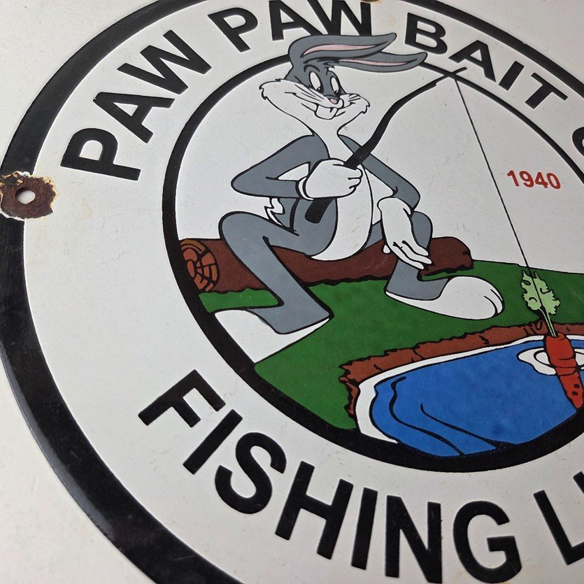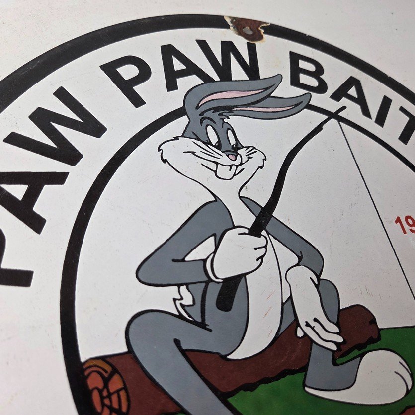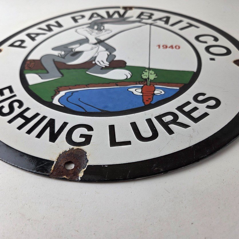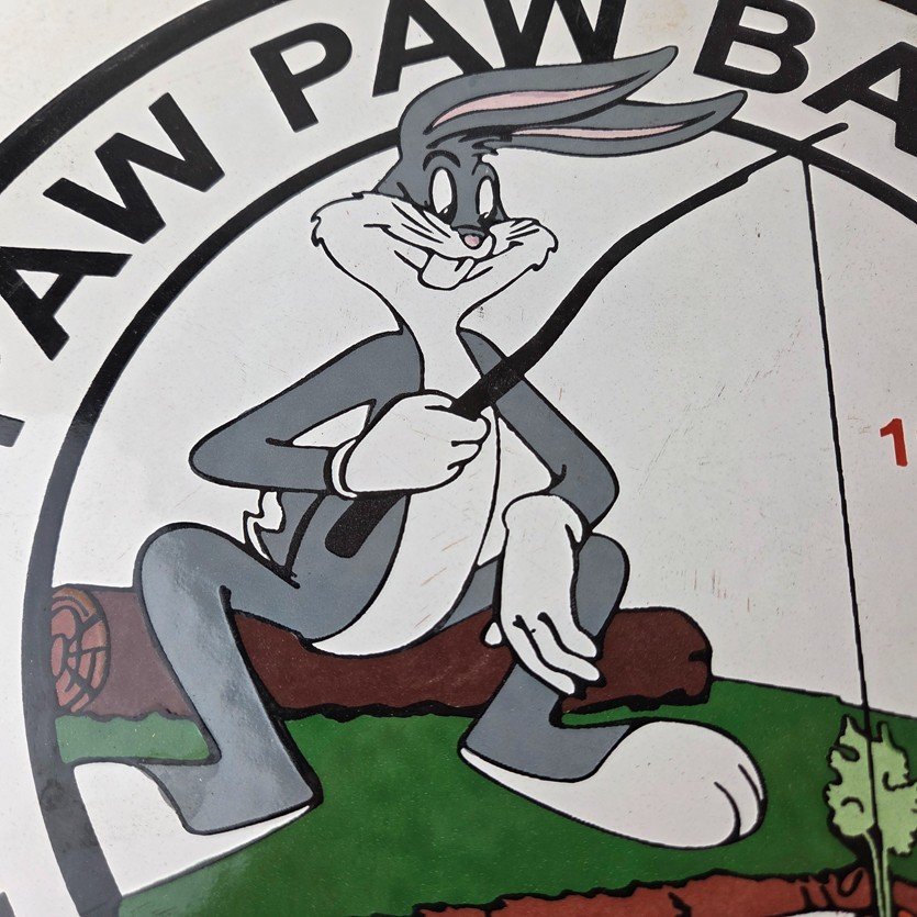 This vintage Paw Paw Bait Company porcelain sign features the large bold lettering around the outside. The sign measures 12 inches and features vibrant colors with excellent porcelain.
