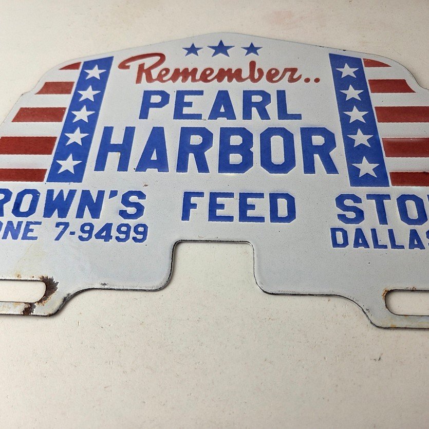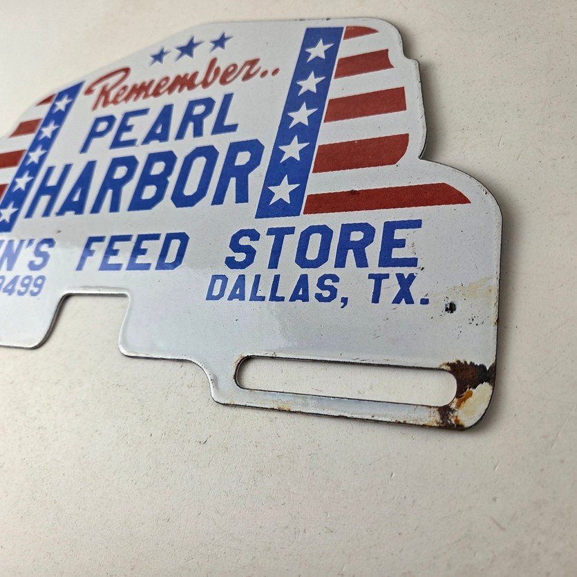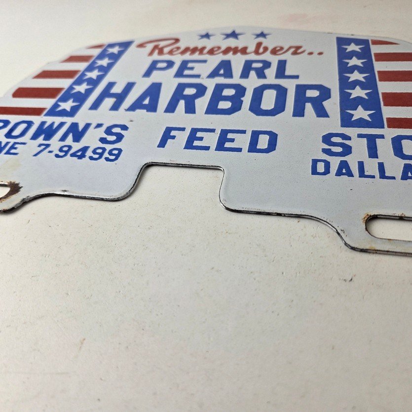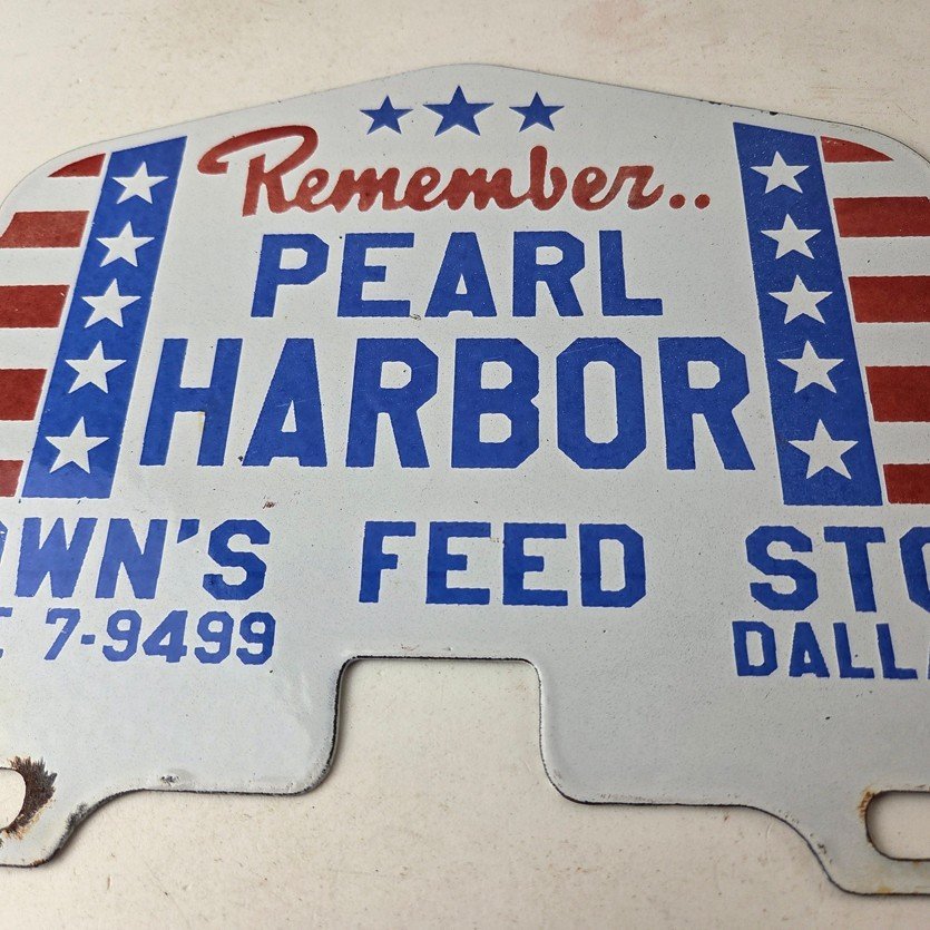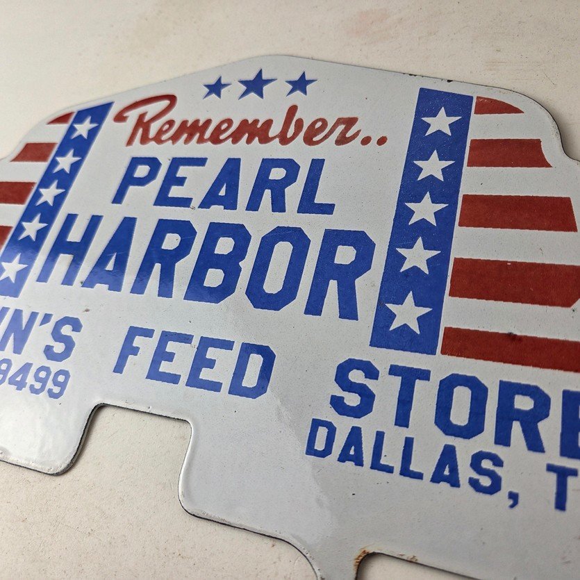 This vintage Remember Pearl Harbor porcelain license plate topper is a must-have for any collector of gas and oil memorabilia. The 12″ by 7 1/2″ porcelain topper features a bold red and blue color with the iconic stars & stripes graphic, making it a great addition to any collection.