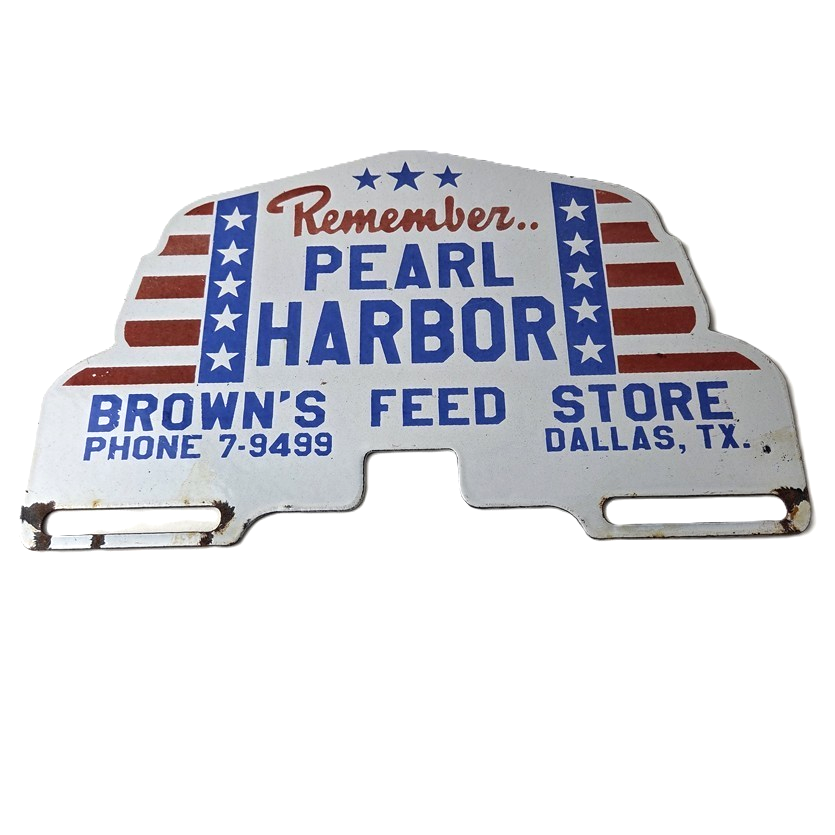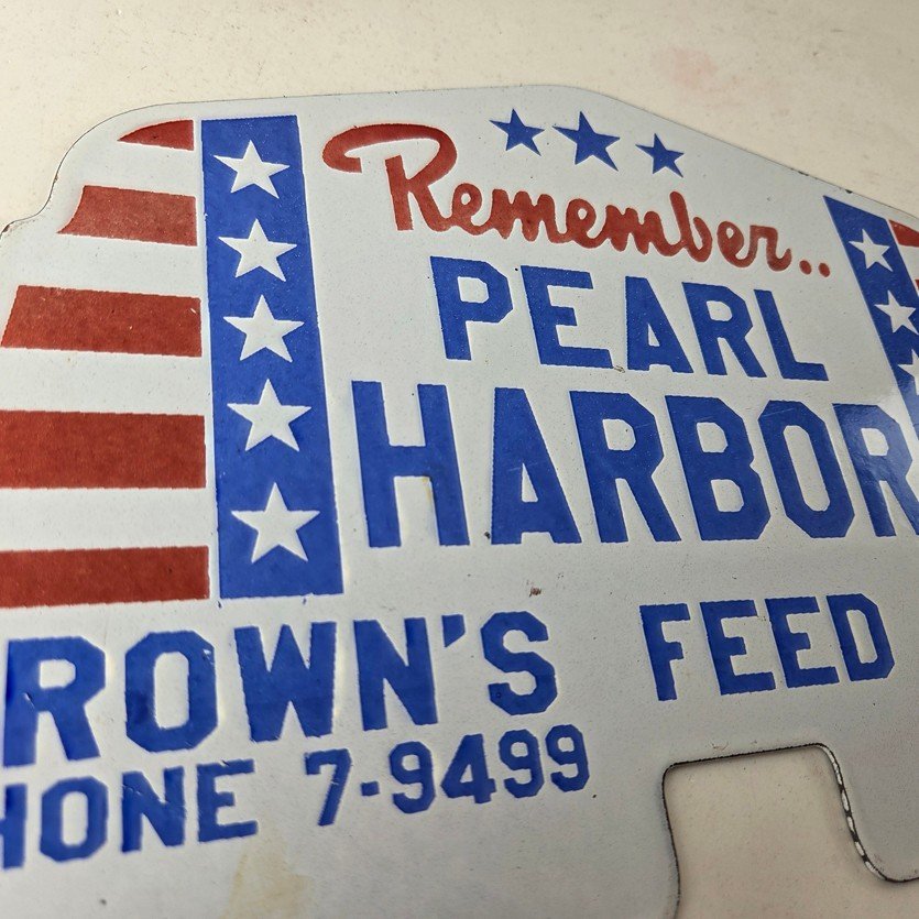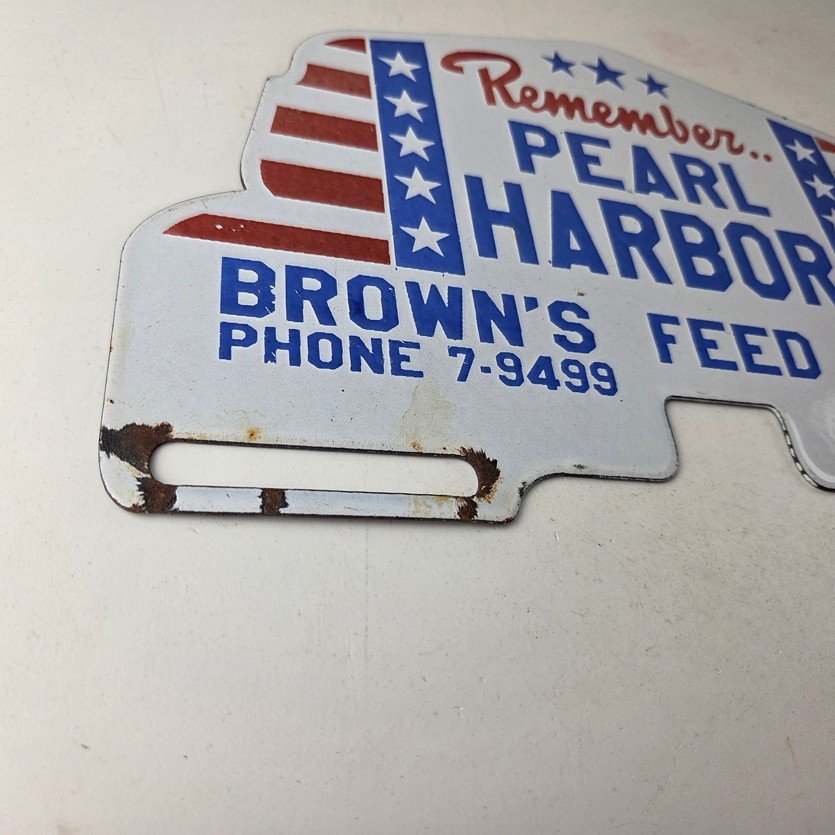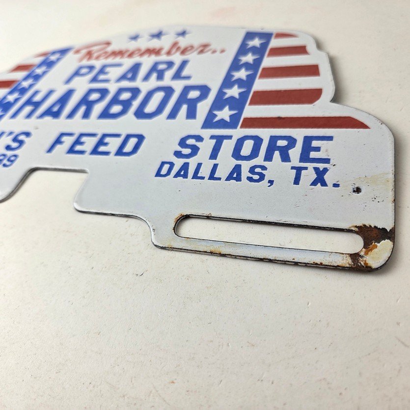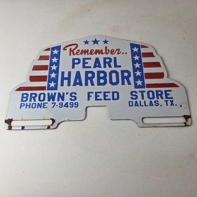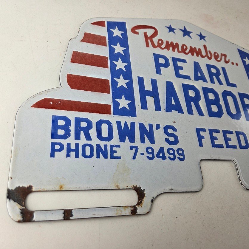 This vintage Remember Pearl Harbor porcelain license plate topper is a must-have for any collector of gas and oil memorabilia. The 12″ by 7 1/2″ porcelain topper features a bold red and blue color with the iconic stars & stripes graphic, making it a great addition to any collection.