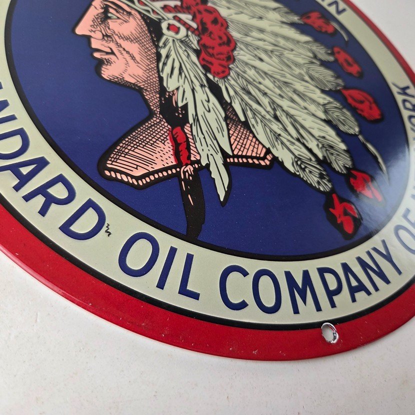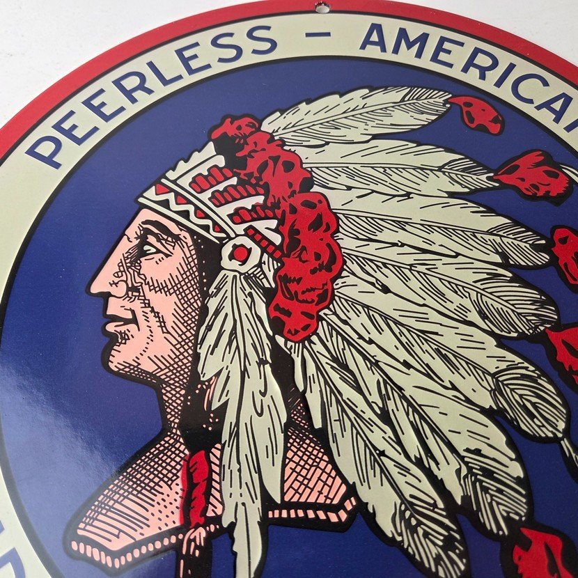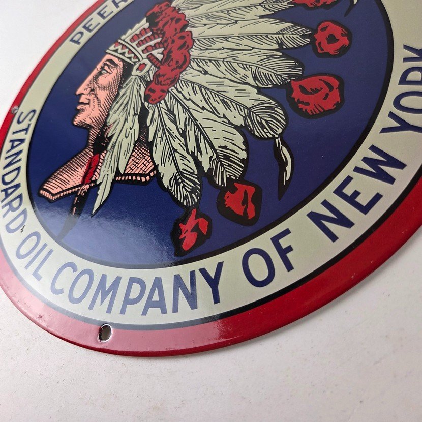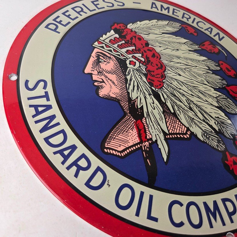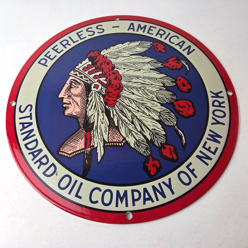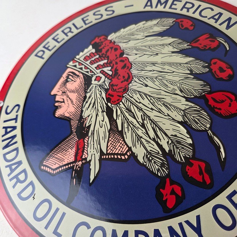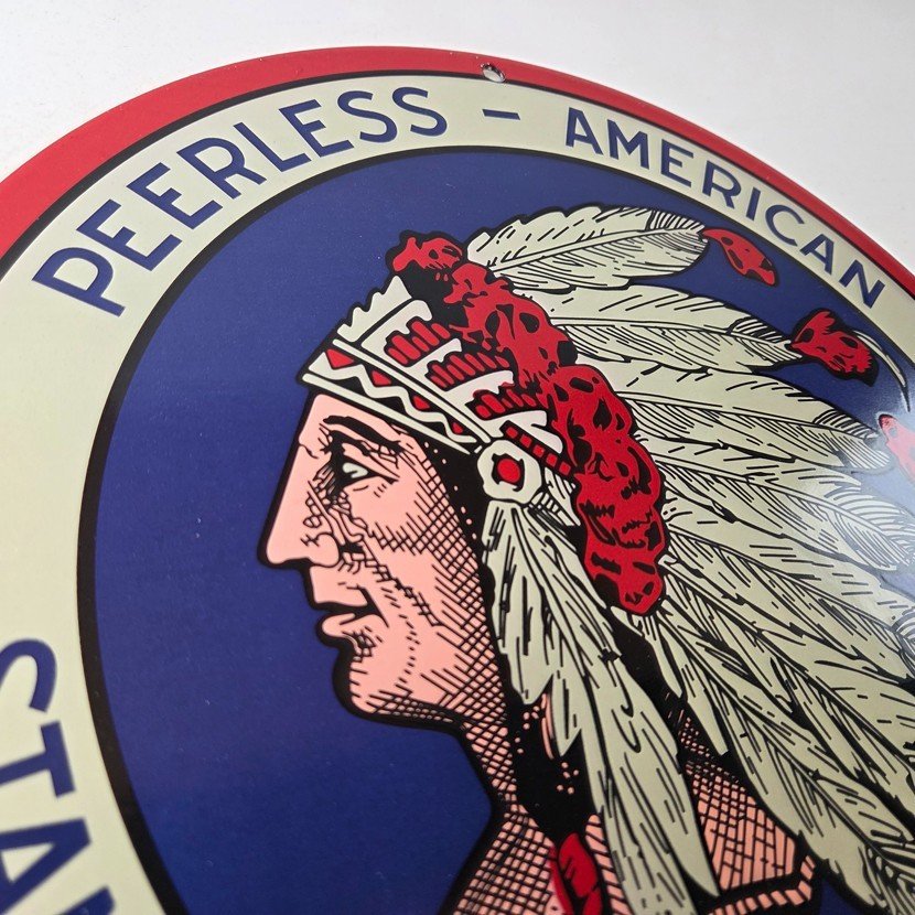 This vintage Peerless Indian chief sign makes a great addition to a garage, shop display, man cave, or any Standard Oil memorabilia collection, vintage gas station advertising collection, or petroliana collection.