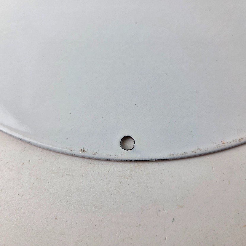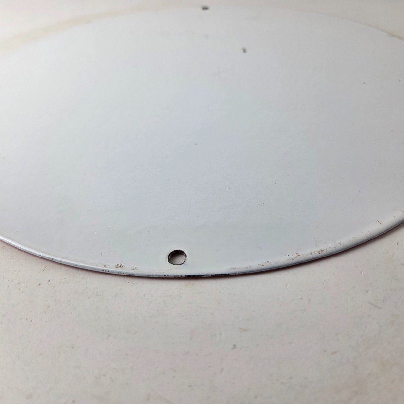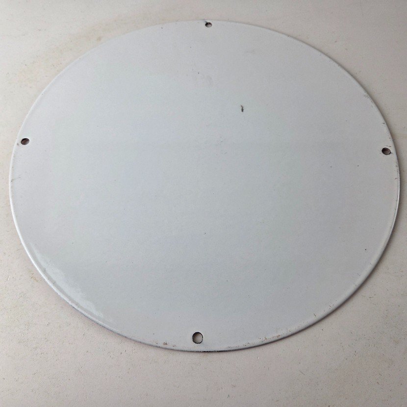 Made of porcelain enamel on steel with patina and wear: rust spotting around the mounting holes, minor edge chips, light surface scratches, and minimal discoloration. This is a porcelain enamel advertising sign in excellent condition, exactly as shown in the photos.