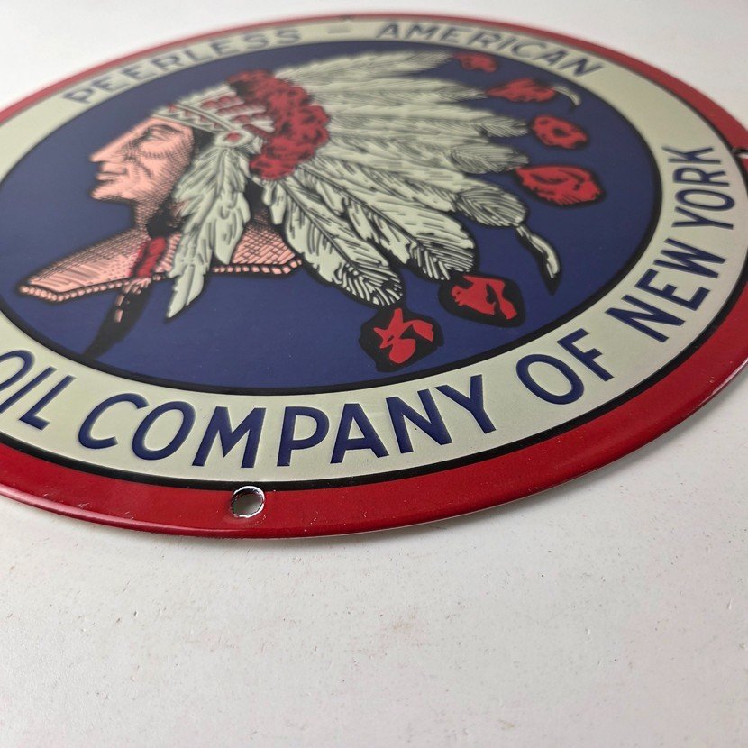 This is a vintage Peerless American Standard Oil porcelain sign (also known as a Peerless porcelain advertising gas pump sign), measuring 12 inches round. It features the classic Native American chief profile: a detailed headdress with red feathers centered on a deep blue background, “PEERLESS – AMERICAN” arched across the top in white on red, “STANDARD OIL COMPANY OF NEW YORK” curved at the bottom, and “NEW YORK” on the sides — a classic Standard Oil of New York (Socony) advertising sign.