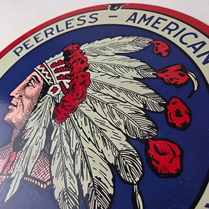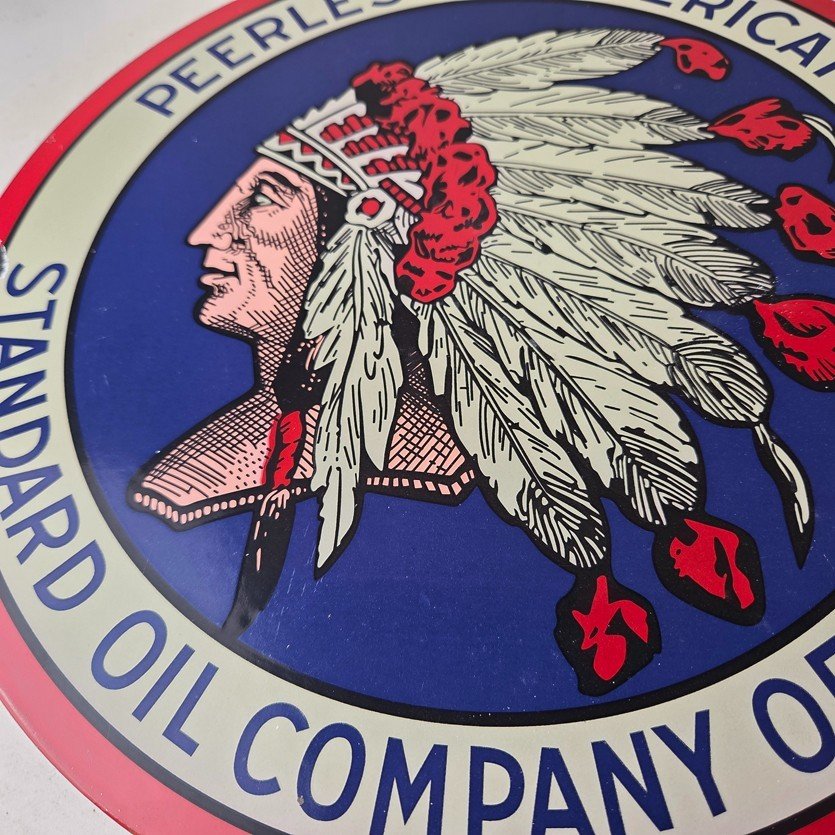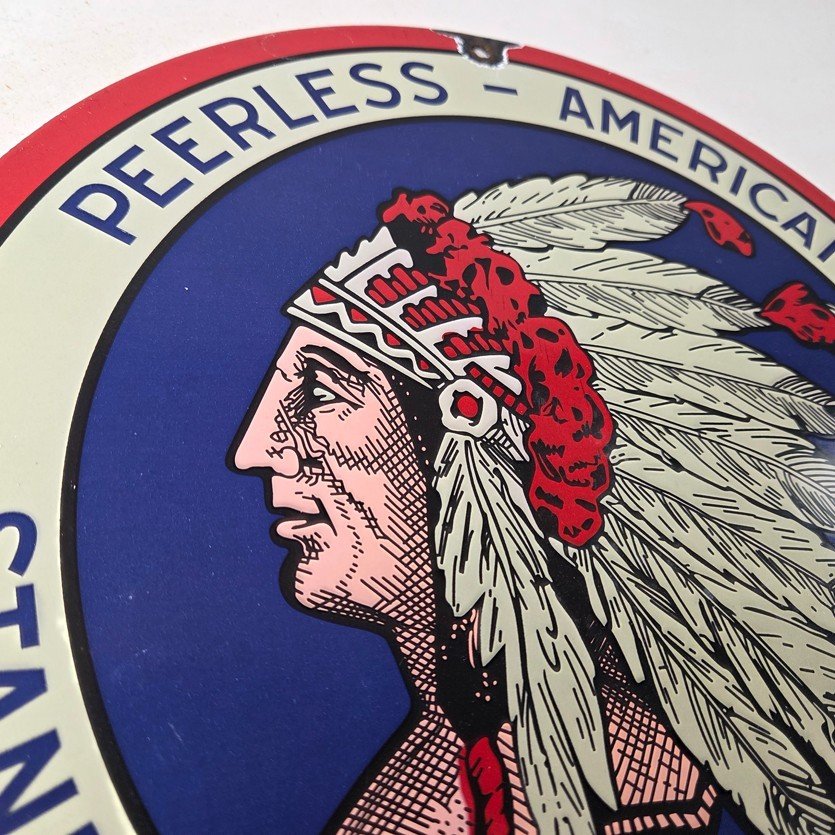 This vintage Peerless Indian chief sign makes a great addition to a garage, shop display, man cave, or any Standard Oil memorabilia collection, vintage gas station advertising collection, or petroliana collection.