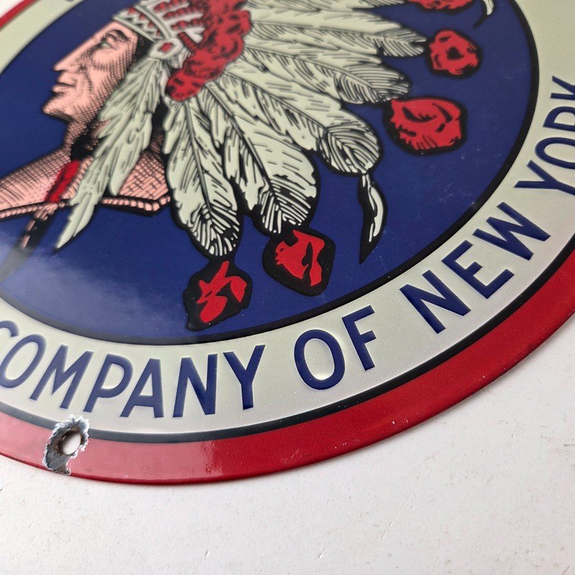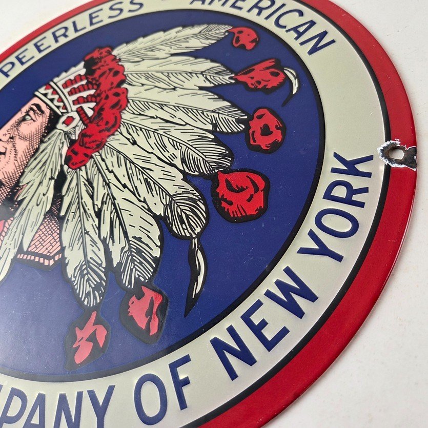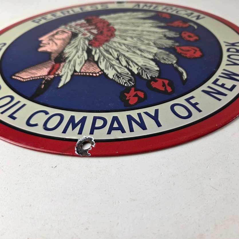 This is a vintage Peerless American Standard Oil porcelain sign (also known as a Peerless porcelain advertising gas pump sign), measuring 12 inches round. It features the classic Native American chief profile: a detailed headdress with red feathers centered on a deep blue background, “PEERLESS – AMERICAN” arched across the top in white on red, “STANDARD OIL COMPANY OF NEW YORK” curved at the bottom, and “NEW YORK” on the sides — a classic Standard Oil of New York (Socony) advertising sign.