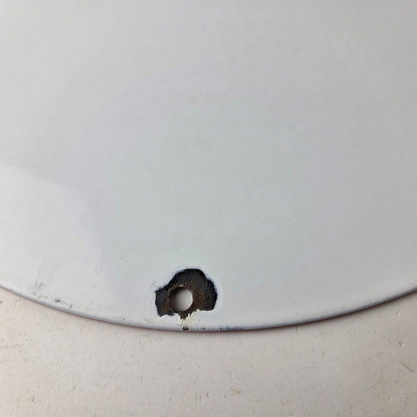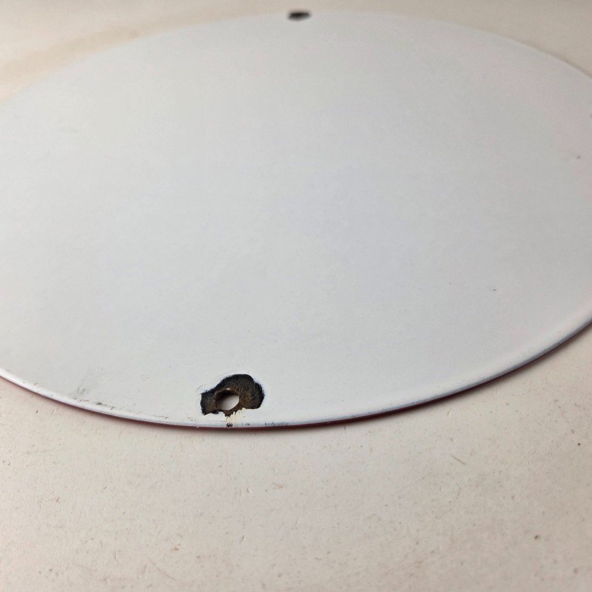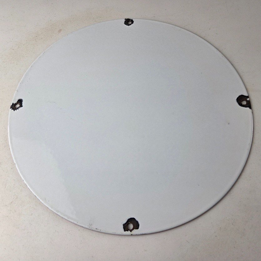 Made of porcelain enamel on steel with patina and wear: rust spotting around the mounting holes, minor edge chips, light surface scratches, and minimal discoloration. This is a porcelain enamel advertising sign in excellent condition, exactly as shown in the photos.