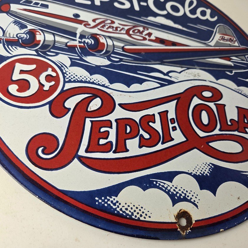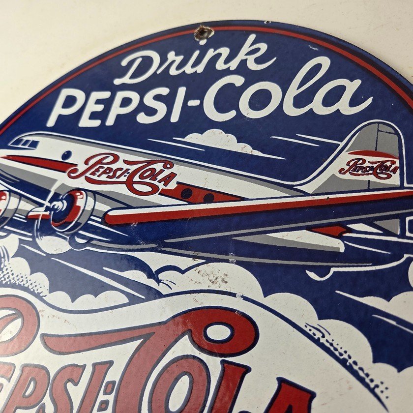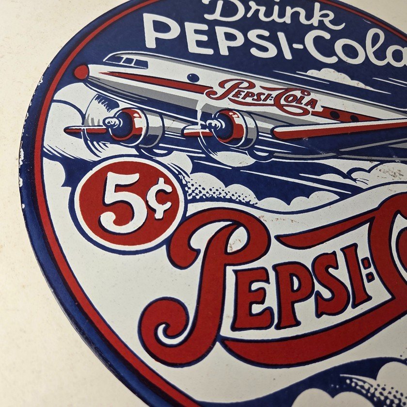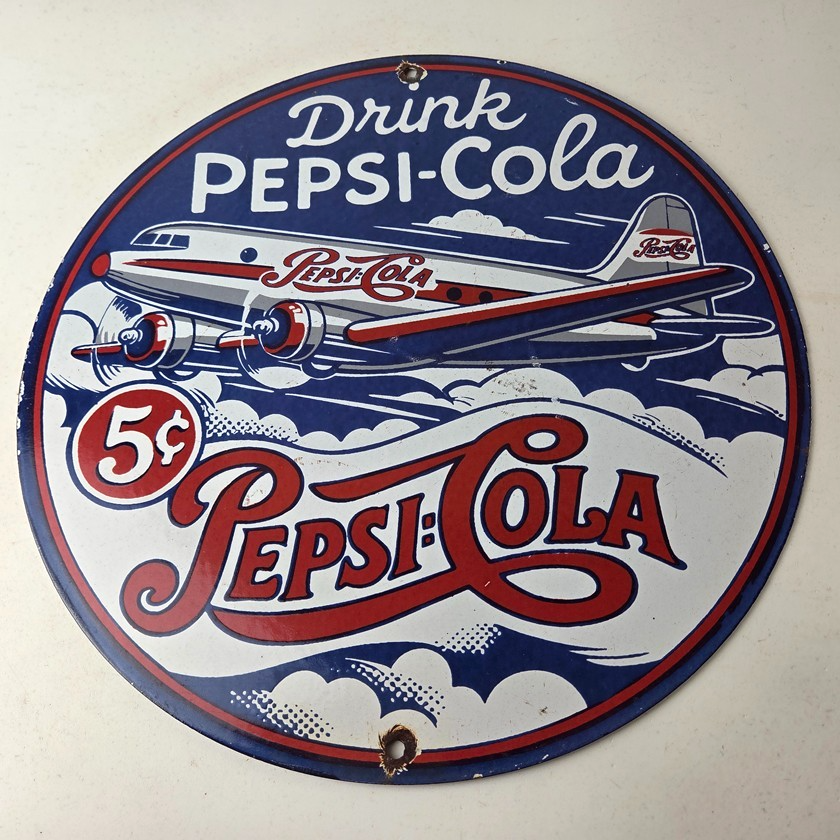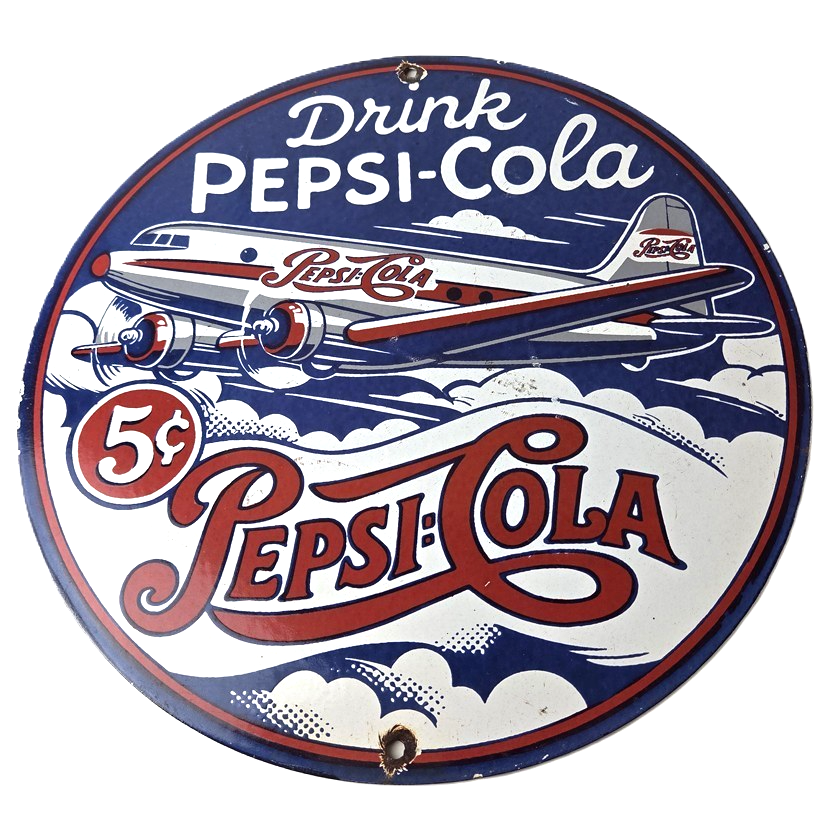 This vintage Pepsi Cola porcelain sign features the iconic Pepsi lettering and the Pepsi Cola airplane. It is made of porcelain and measures 12″ across.