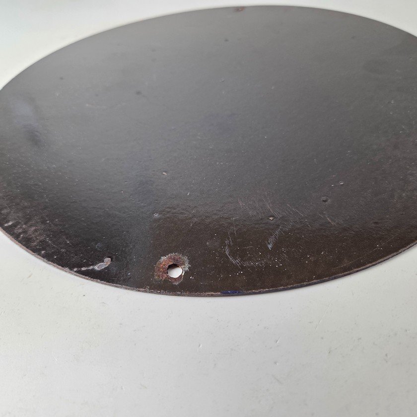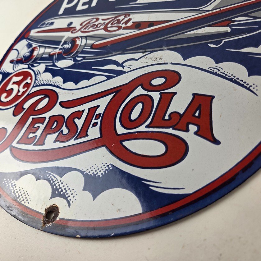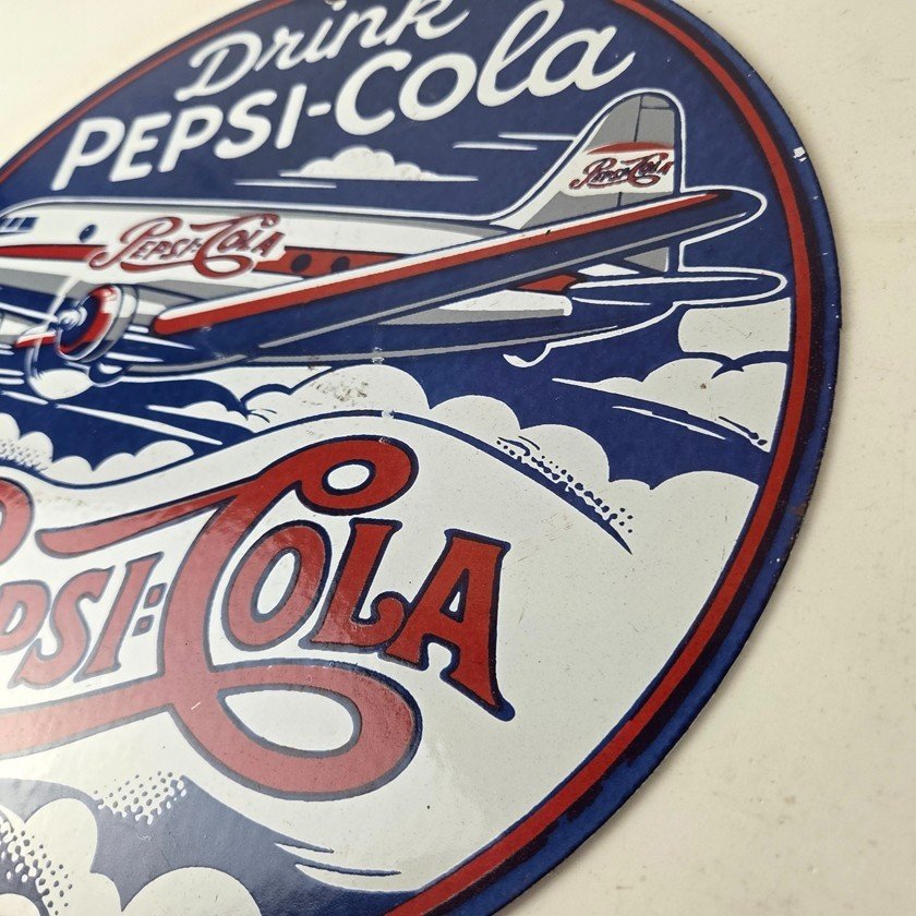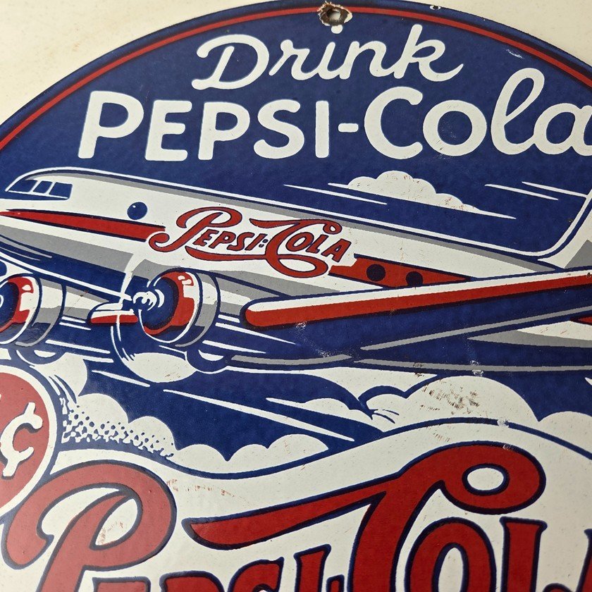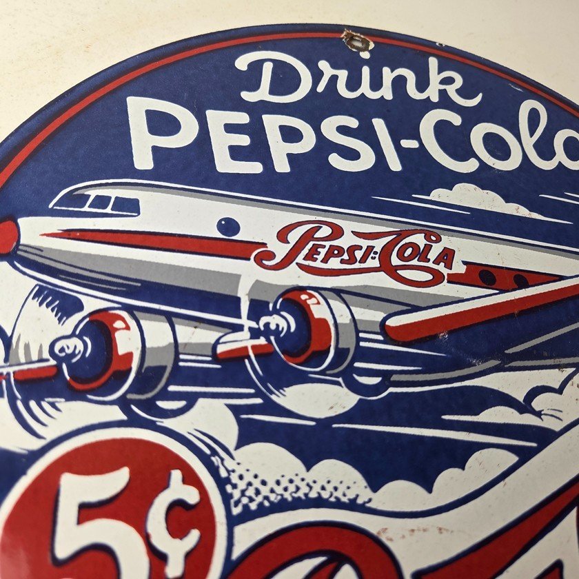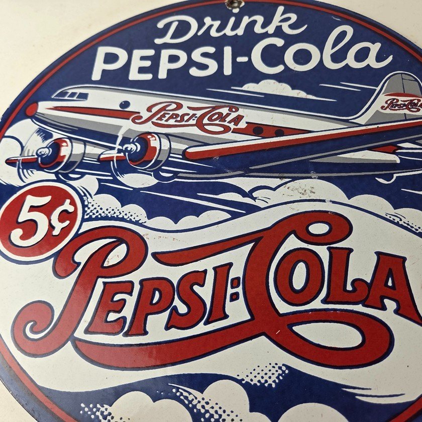 This vintage Pepsi Cola porcelain sign features the iconic Pepsi lettering and the Pepsi Cola airplane. It is made of porcelain and measures 12″ across.