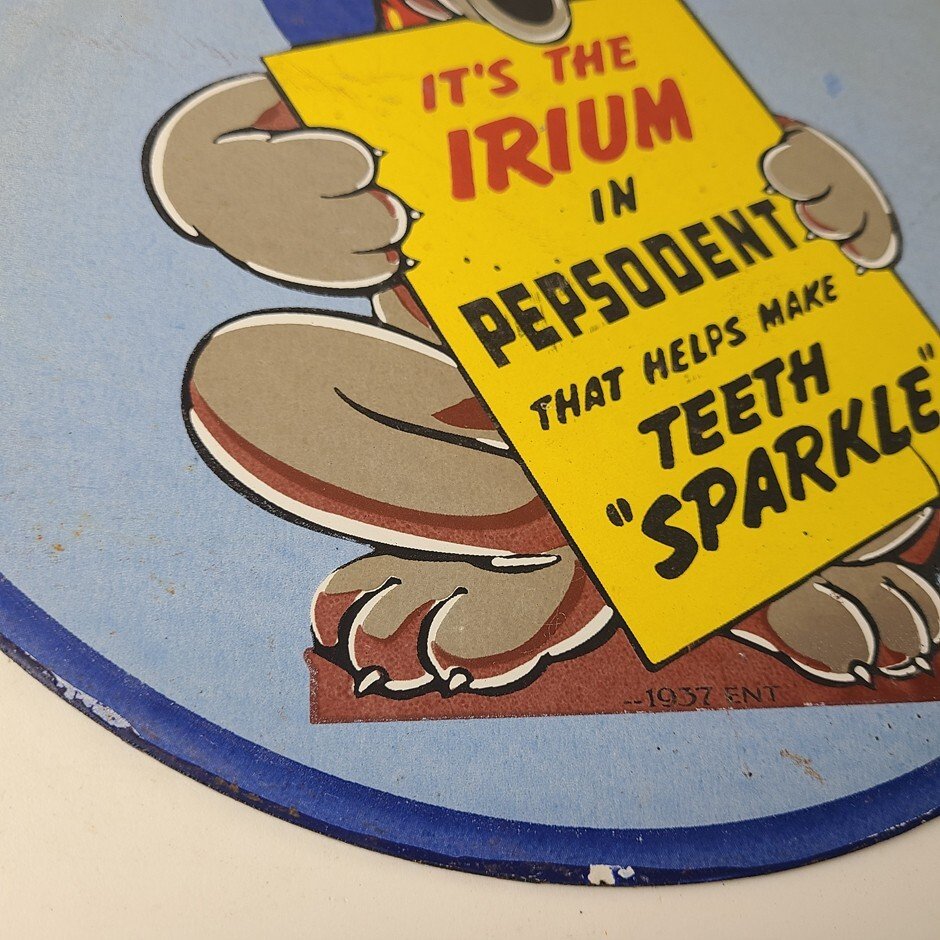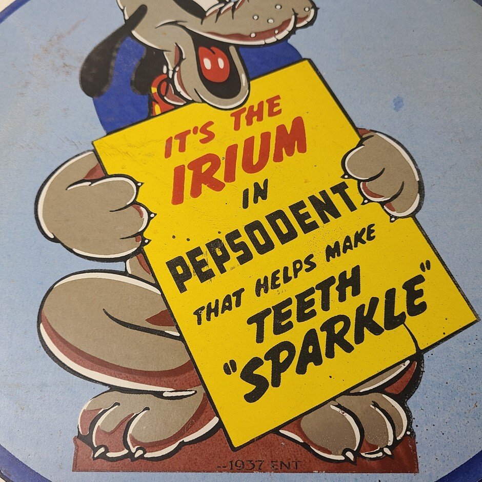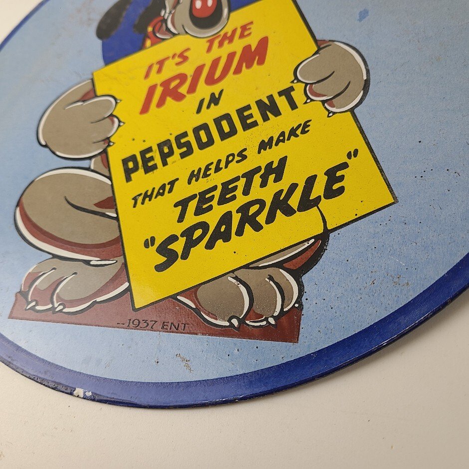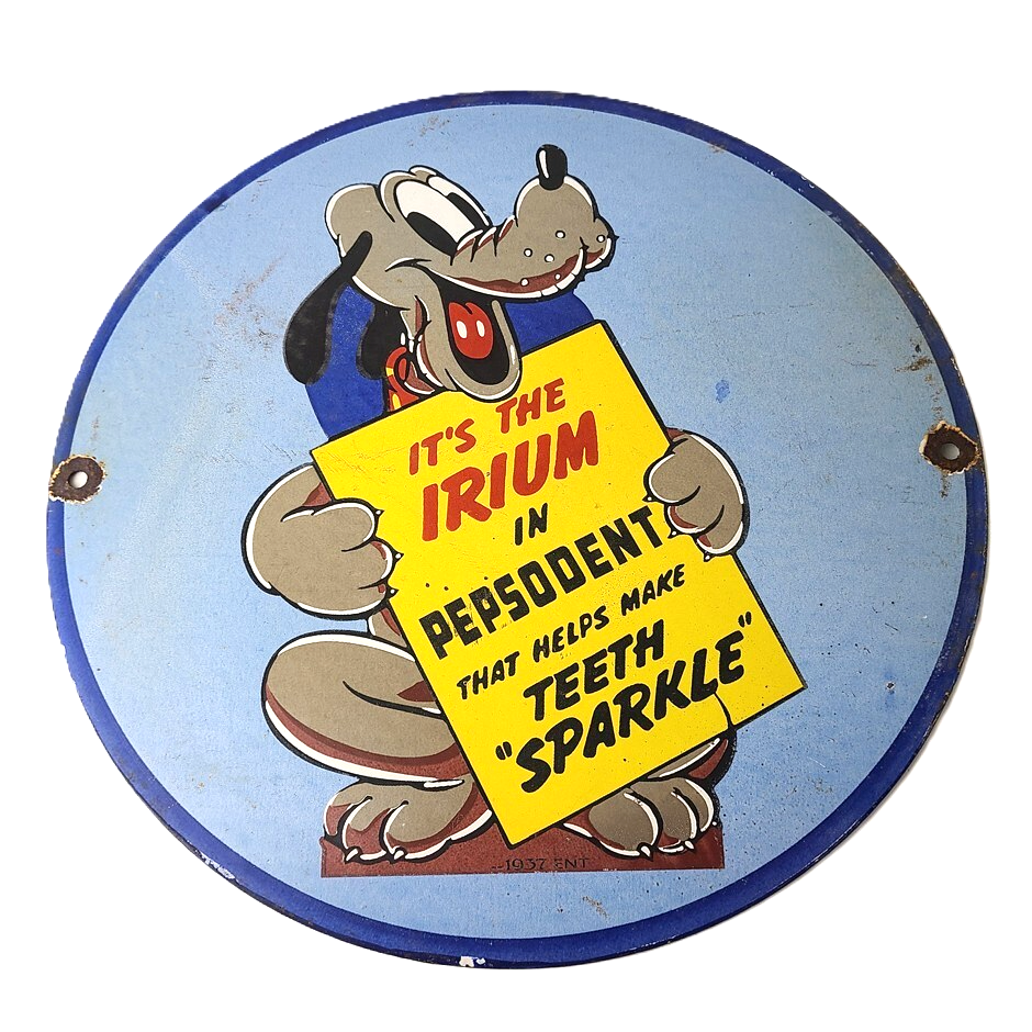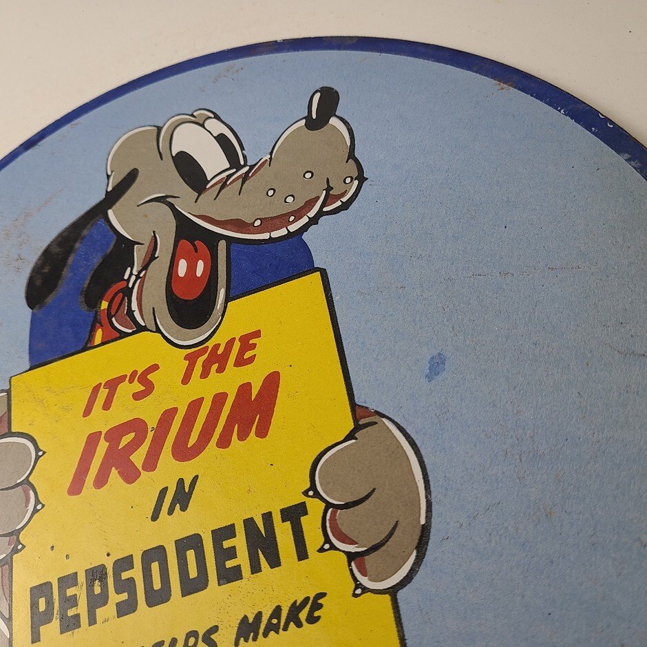 For sale is a vintage Pepsodent Teeth Sparkle porcelain sign featuring a playful Pluto design. This porcelain sign is perfect for adding a pop of color to any gas and oil themed collection. Measuring at a pump plate size of 12 inches, this sign is a great addition for any advertising or collectibles enthusiast.