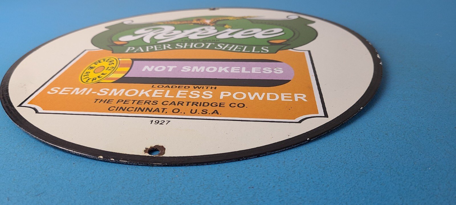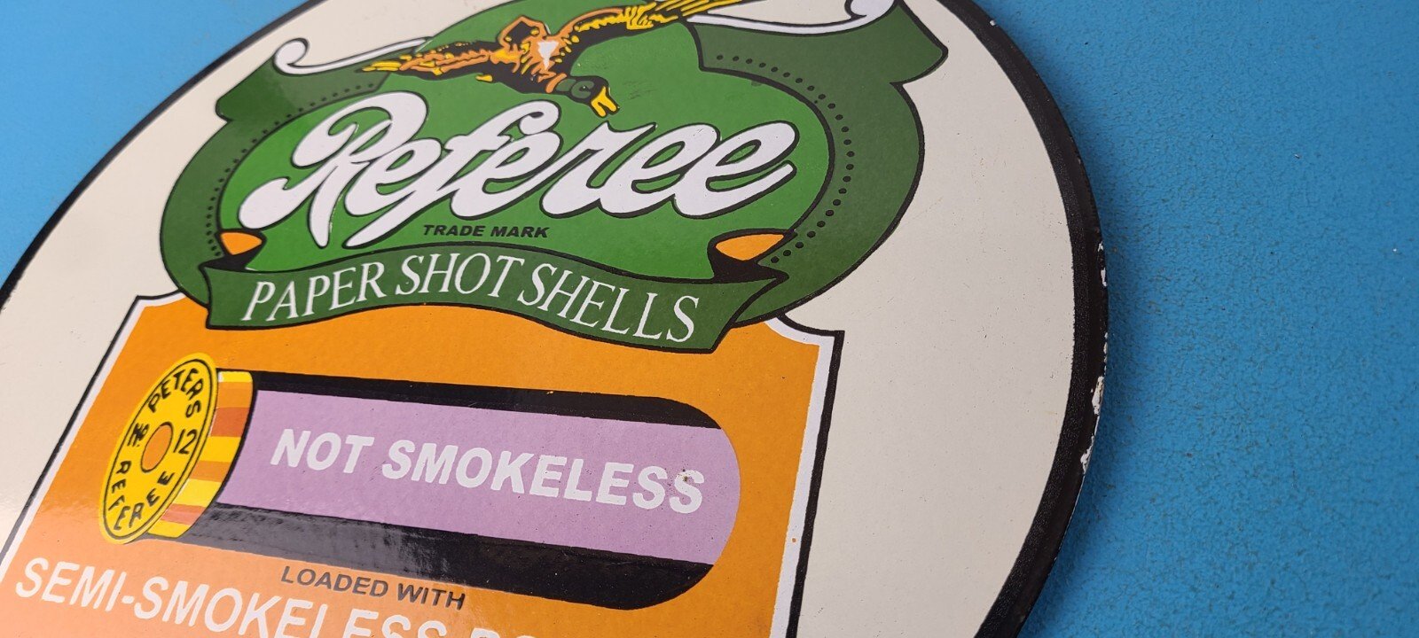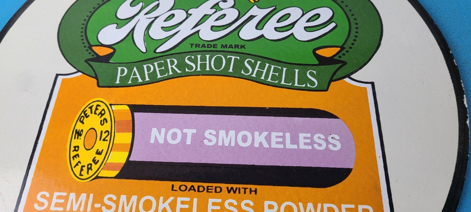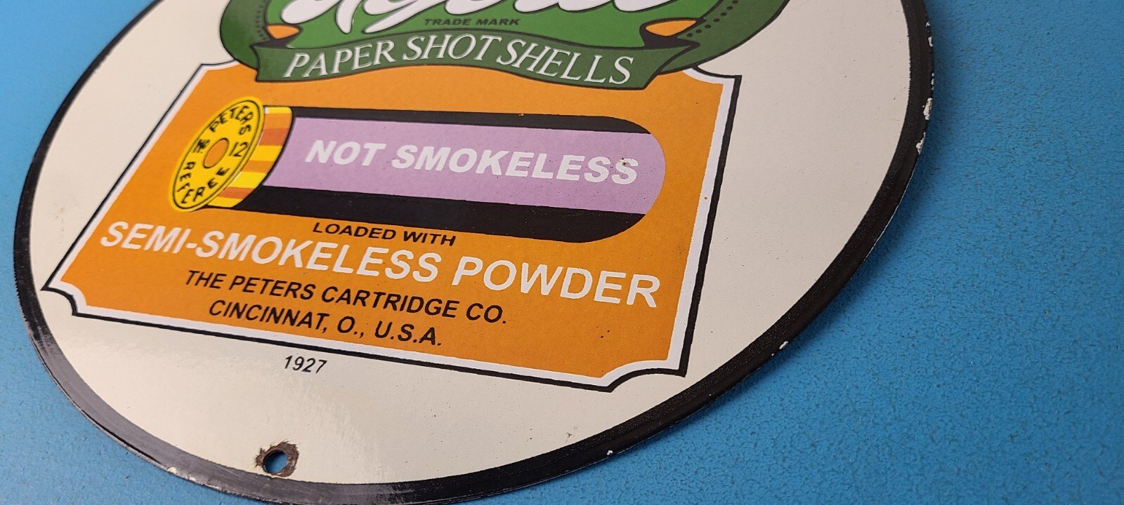 This vintage Peters sign is a must-have for any collector of gas and outdoor sports memorabilia. Made of durable porcelain, it features the iconic Peter’s lettering and is perfect for displaying in a garage or man cave. Measuring at 12 inches, it is a great size for display in a service station or man cave. With its bright colors and classic design this sign is sure to catch the eye of anyone who appreciates firearm advertising. Whether you’re a fan of shotguns, rifles or Ammo, this Peter’s Sporting ammo sign is a great addition to any collection.