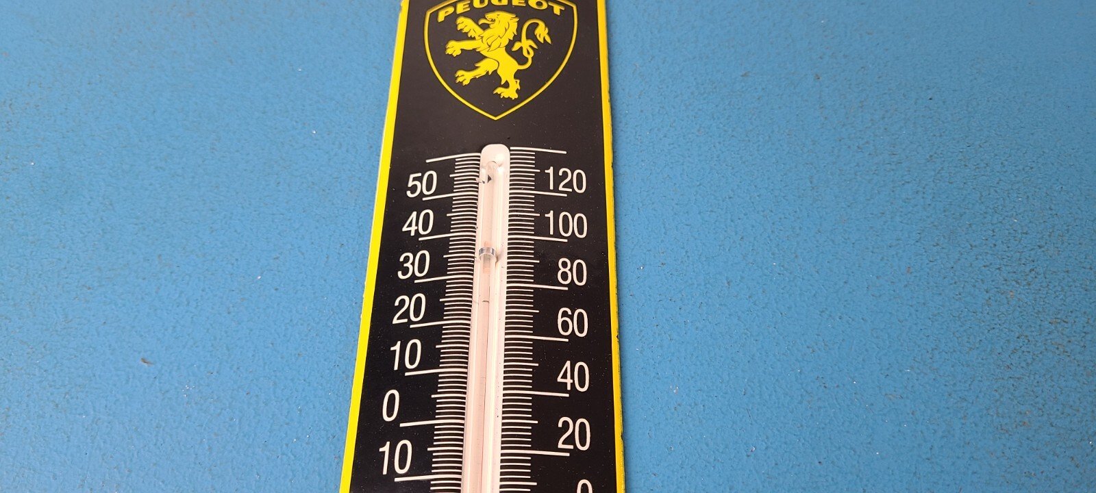 This vintage Peugeot porcelain thermometer measures 11 3/4″ x 2 1/2″. This thermometer is a great addition to any collection. It features the iconic lion at the top and has vibrant black and yellow color with excellent gloss.