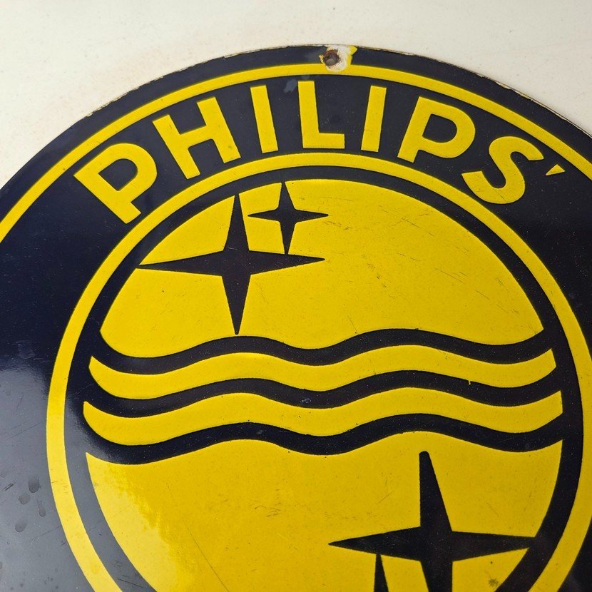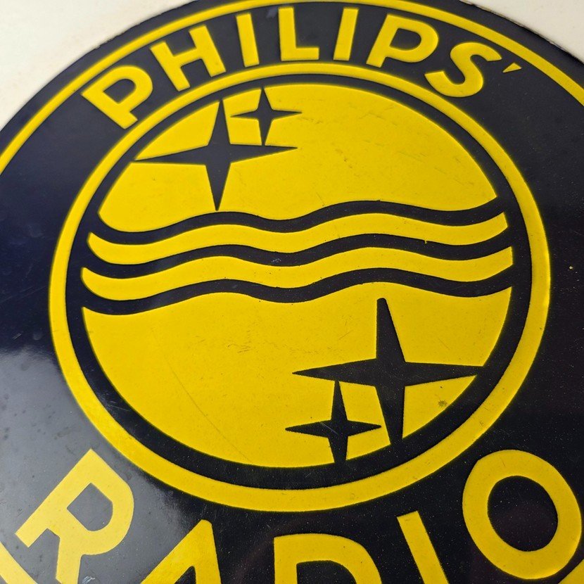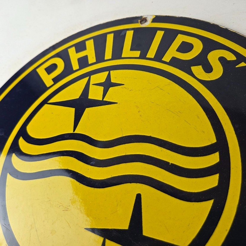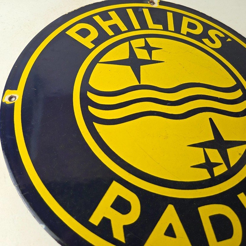 This vintage Philips Radio porcelain sign features the Philips Radio graphic of the girl with a recorder. The sign measures 12 inches and features vibrant yellow color with excellent porcelain.