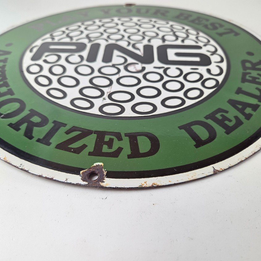 This vintage Ping Golf porcelain sign features the iconic Ping golf ball and has large lettering around the rim. This sign is perfect for any golf fan or collector of sports memorabilia. This sign has high-quality porcelain on both sides and measures at 12″.