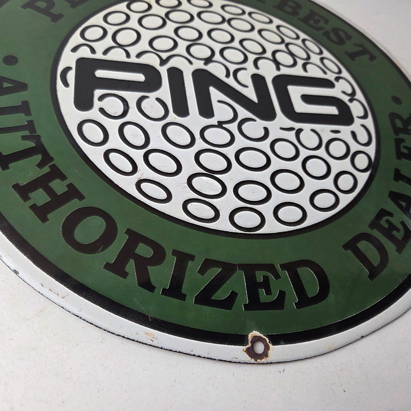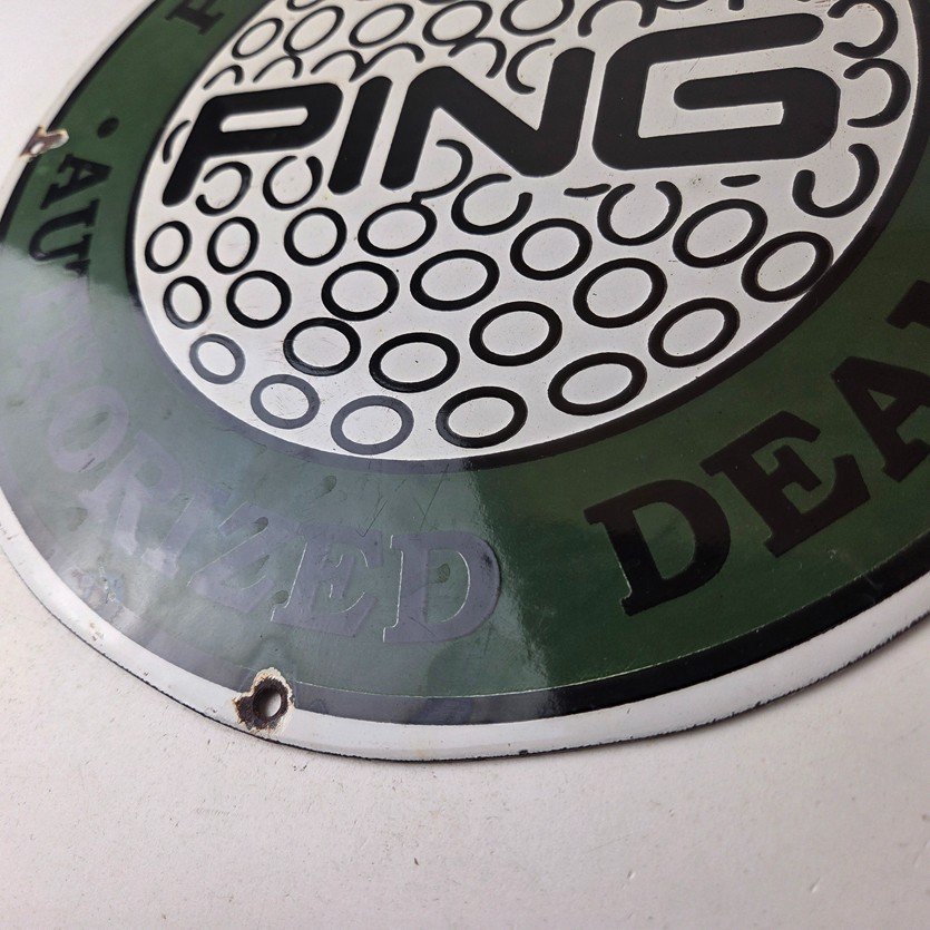This vintage Ping Golf porcelain sign features the iconic Ping golf ball and has large lettering around the rim. This sign is perfect for any golf fan or collector of sports memorabilia. This sign has high-quality porcelain on both sides and measures at 12″.