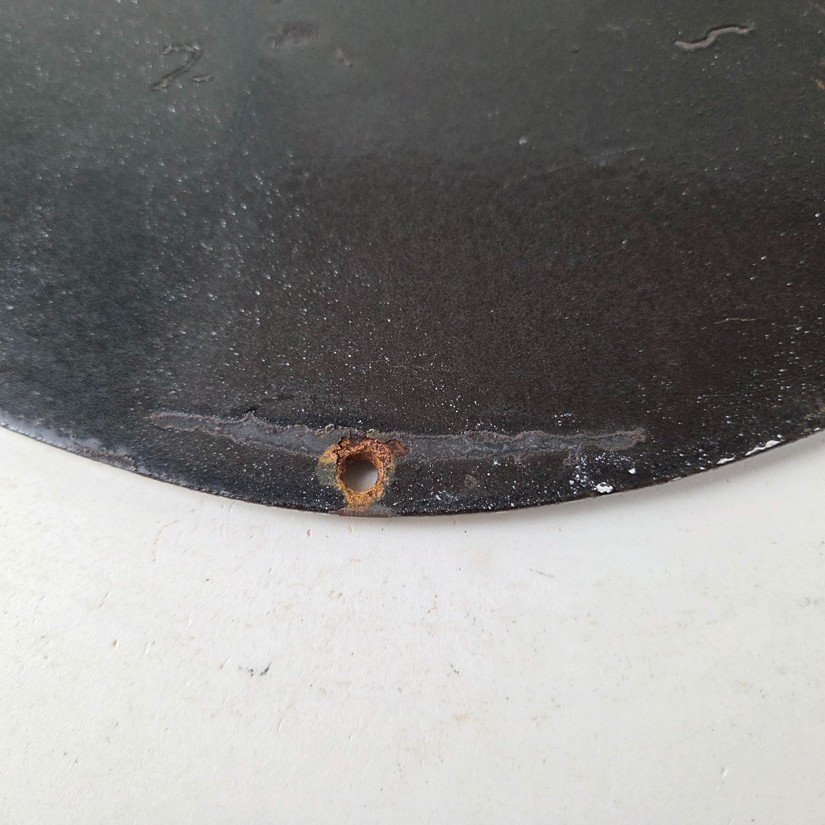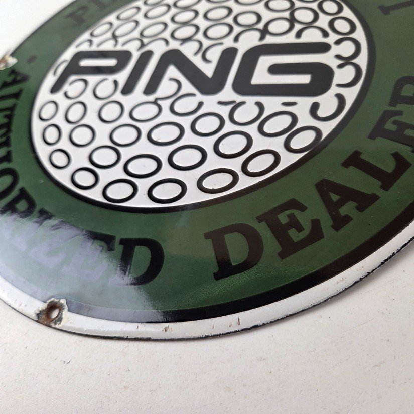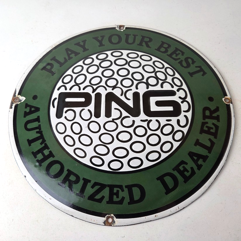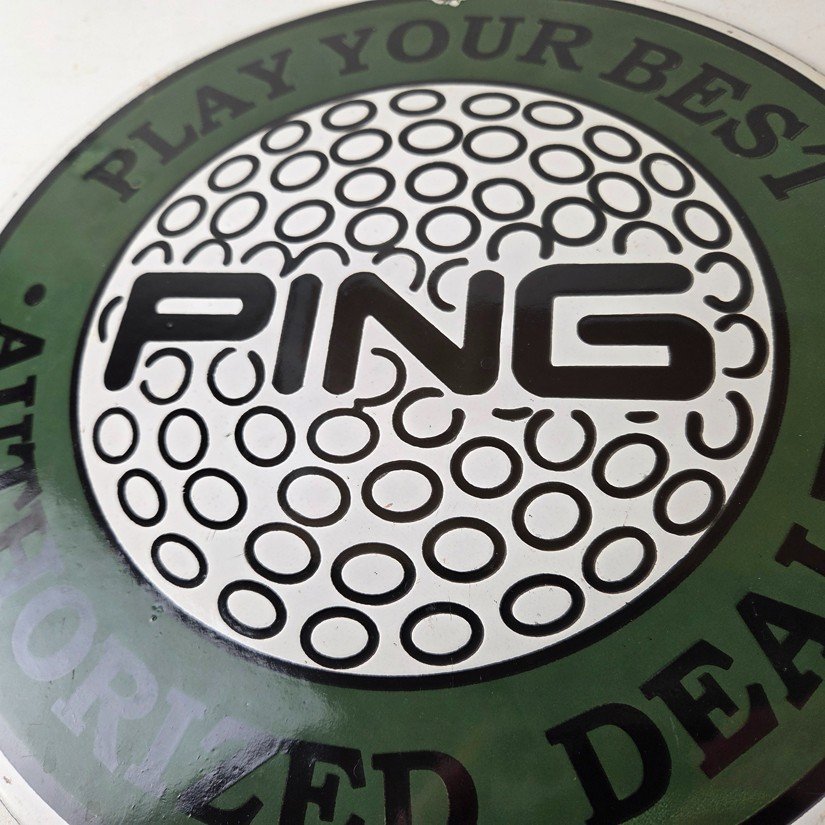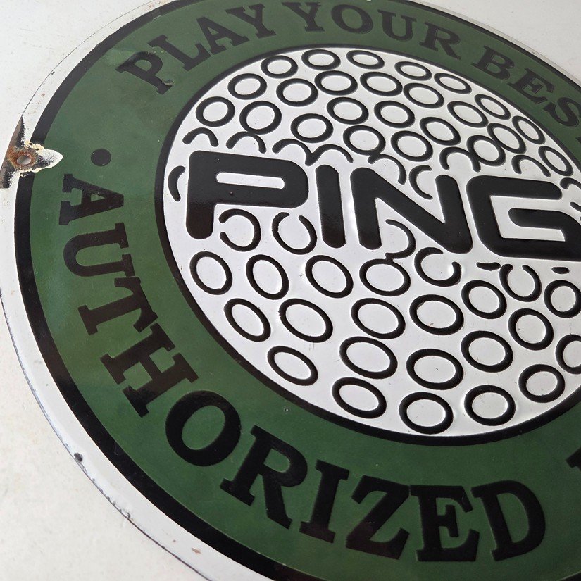 This vintage Ping Golf porcelain sign features the iconic Ping golf ball and has large lettering around the rim. This sign is perfect for any golf fan or collector of sports memorabilia. This sign has high-quality porcelain on both sides and measures at 12″.