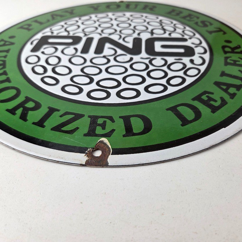 This vintage Ping Golf porcelain sign features the iconic Ping golf ball and has large lettering around the rim. This sign is perfect for any golf fan or collector of sports memorabilia. This sign has high-quality porcelain on both sides and measures at 12″.
