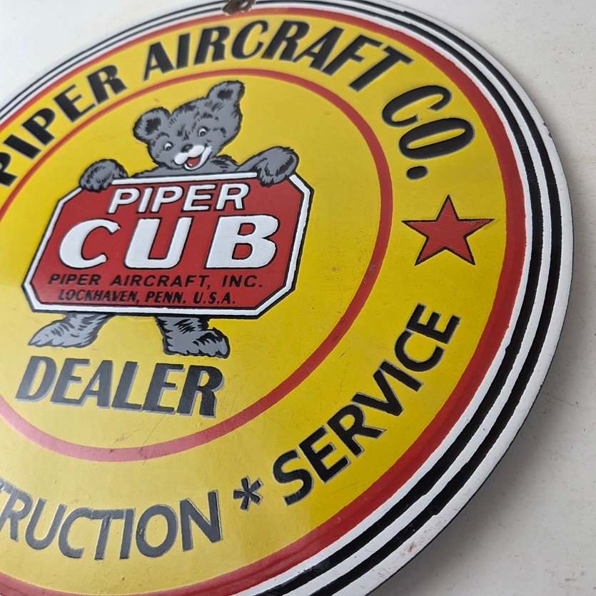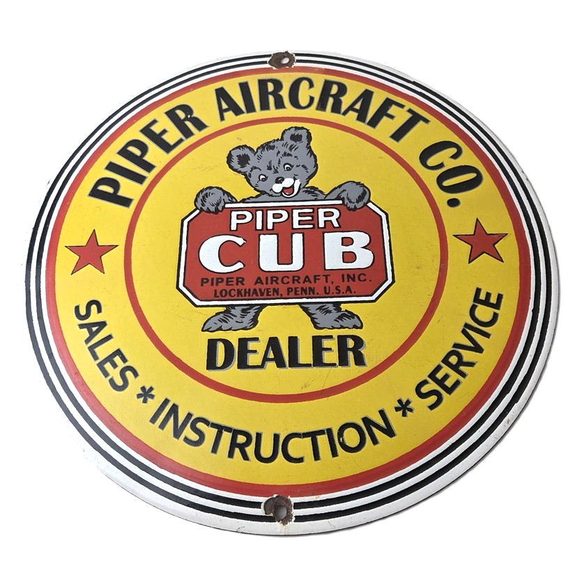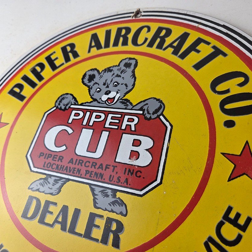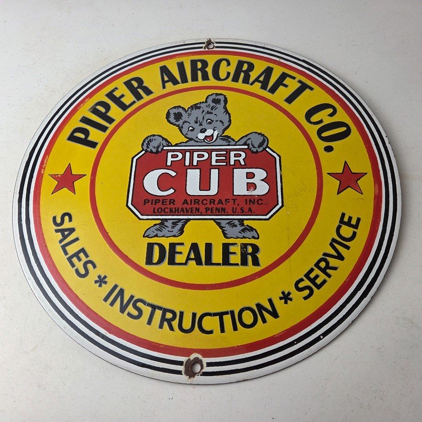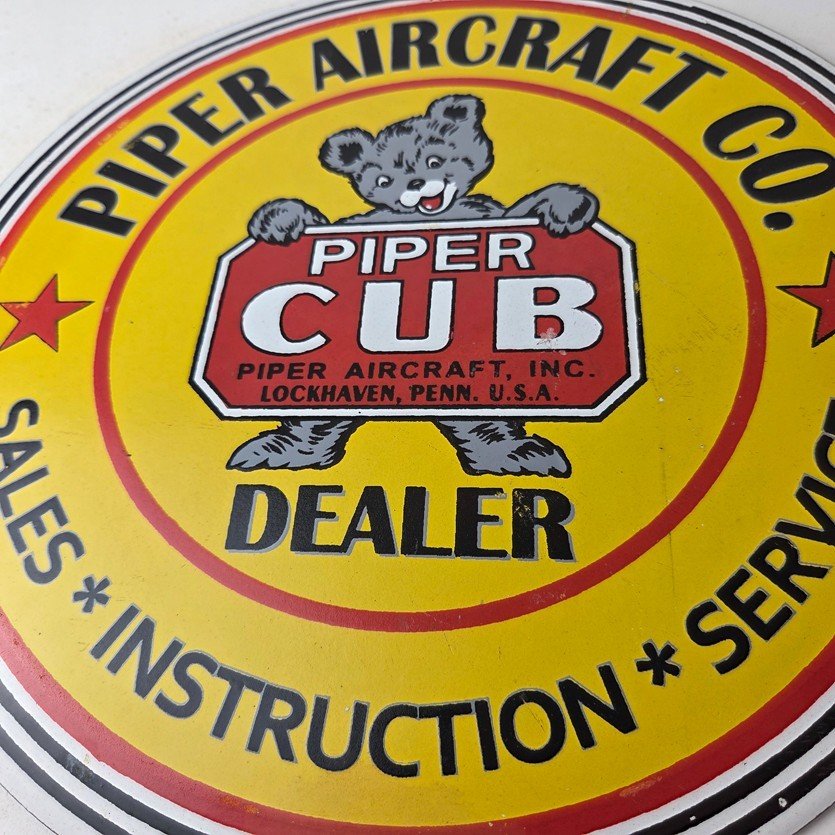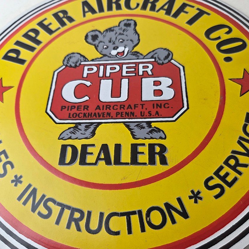This vintage Piper Aircraft Co. porcelain sign is a must-have for collectors and aviation & gasoline enthusiasts alike. With its eye-catching red and yellow color and Piper Aircraft brand, it’s a perfect addition to any collection. Measuring 12″, this porcelain sign has excellent lettering with the Cessna logo in the center.