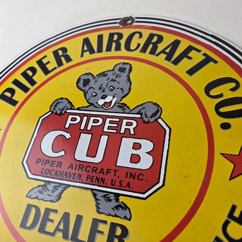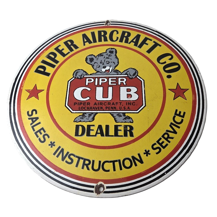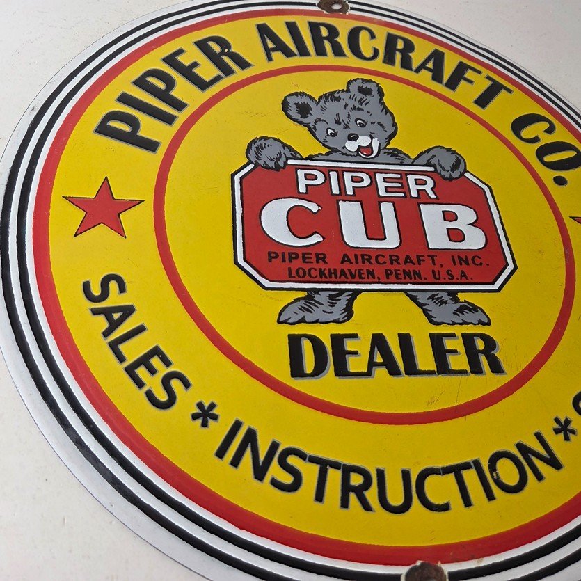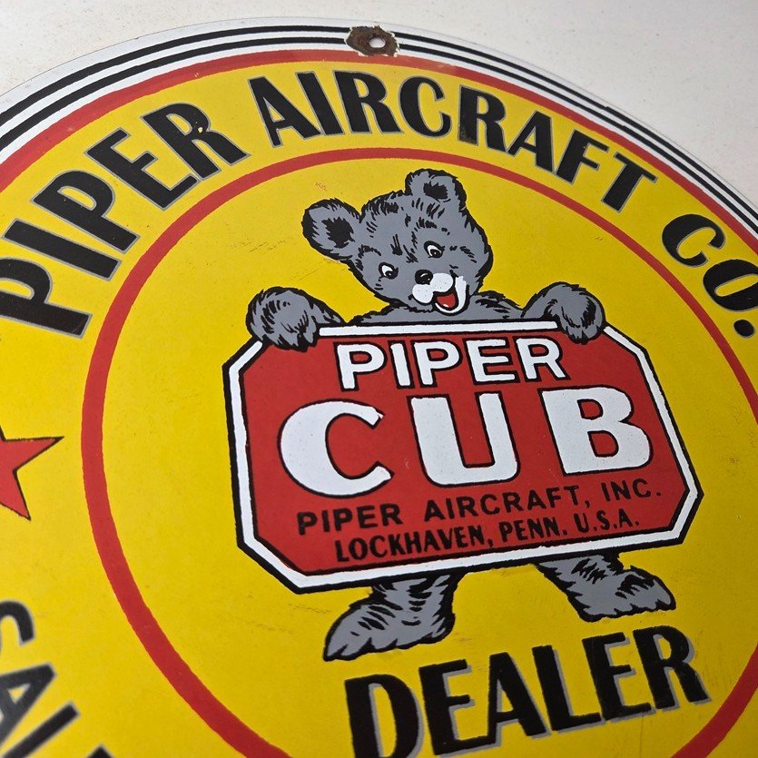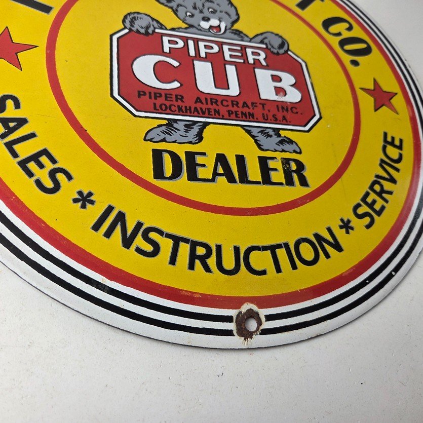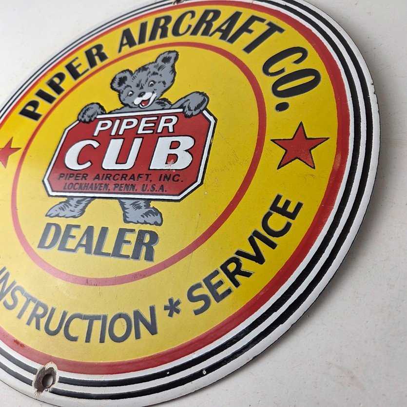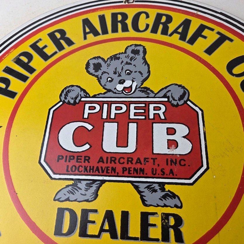 This vintage Piper Aircraft Co. porcelain sign is a must-have for collectors and aviation & gasoline enthusiasts alike. With its eye-catching red and yellow color and Piper Aircraft brand, it’s a perfect addition to any collection. Measuring 12″, this porcelain sign has excellent lettering with the Cessna logo in the center.
