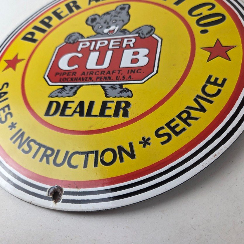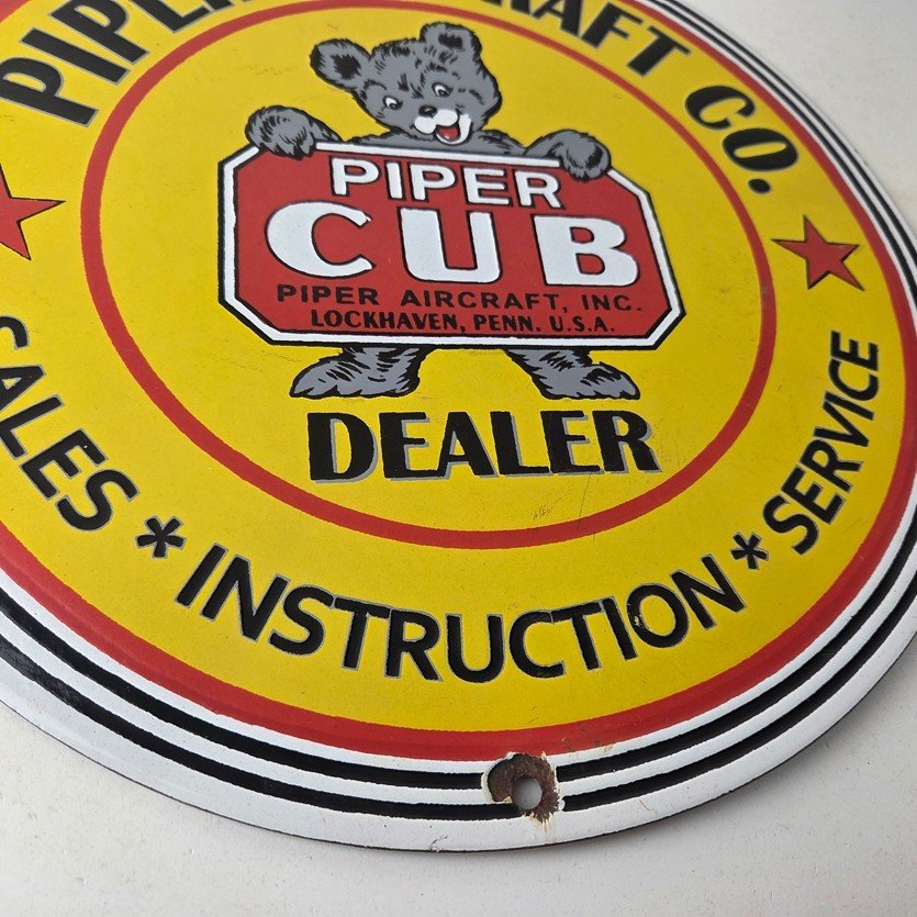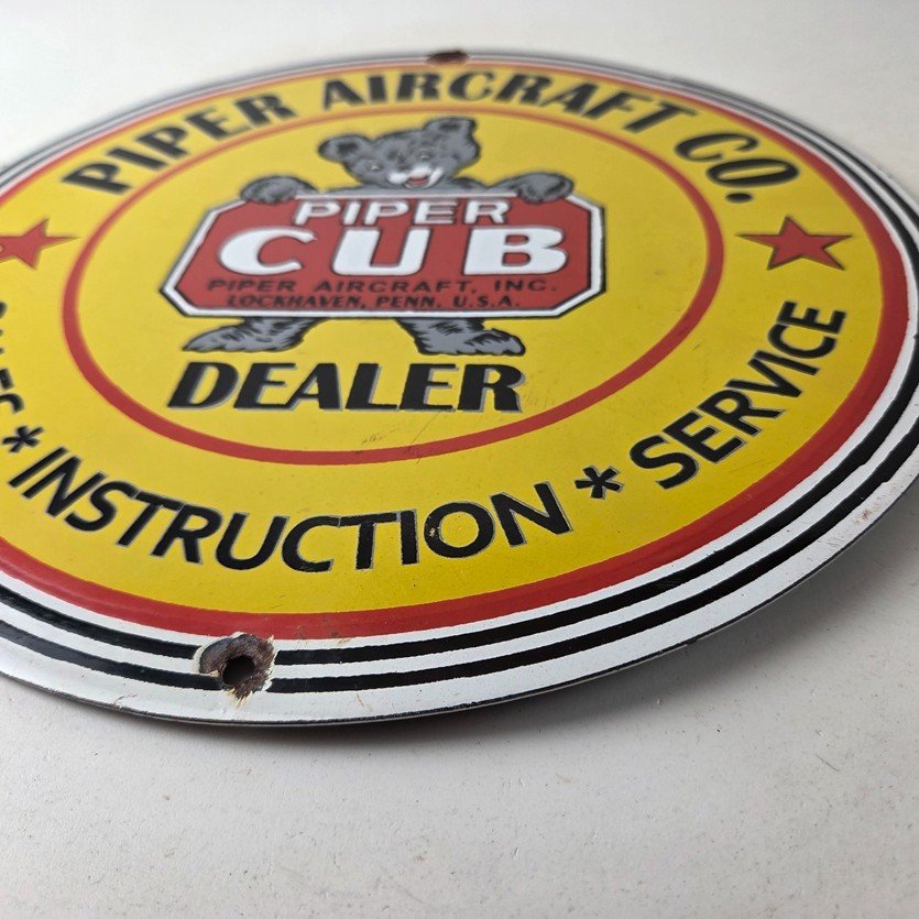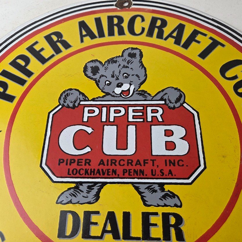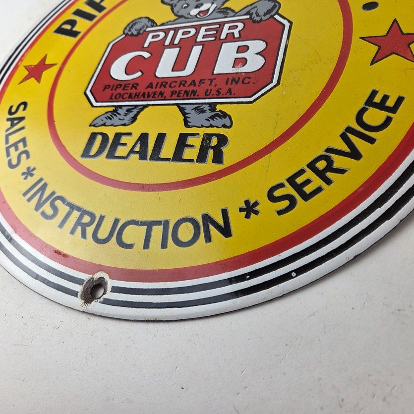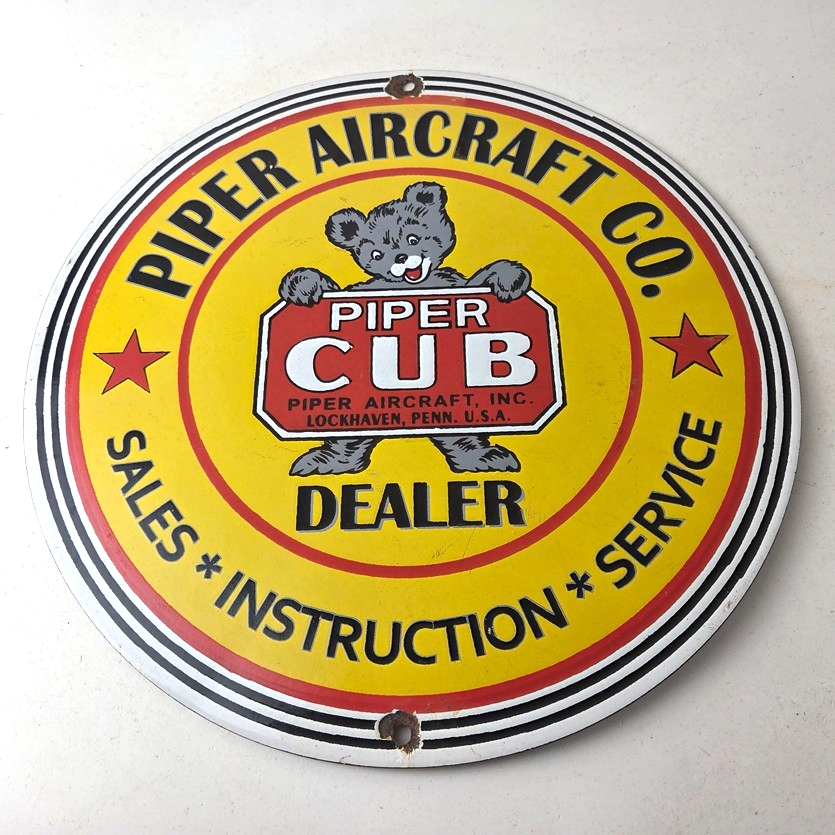 This vintage Piper Aircraft Co. porcelain sign is a must-have for collectors and aviation & gasoline enthusiasts alike. With its eye-catching red and yellow color and Piper Aircraft brand, it’s a perfect addition to any collection. Measuring 12″, this porcelain sign has excellent lettering with the Cessna logo in the center.