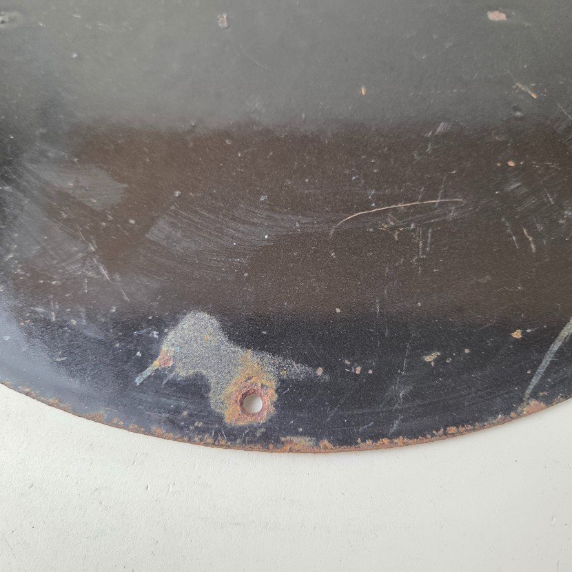 Made of porcelain enamel on steel with patina and wear: rust spotting around the mounting holes, minor edge chips, light surface scratches, and minimal discoloration. This is a porcelain enamel advertising sign in excellent condition, exactly as shown in the photos.